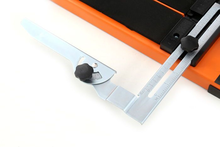 Stalowa podstawa z warstwą mikrogumy stabilizuje materiał, ułatwiając precyzyjne ustawienie płytki przed cięciem.