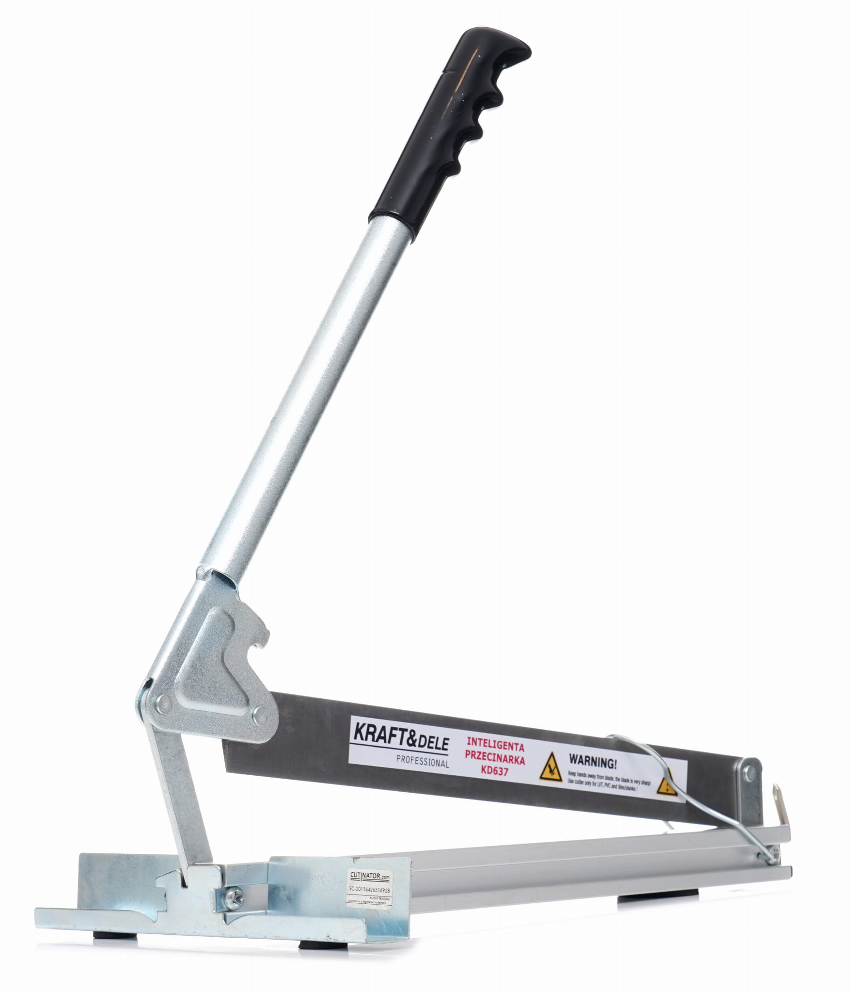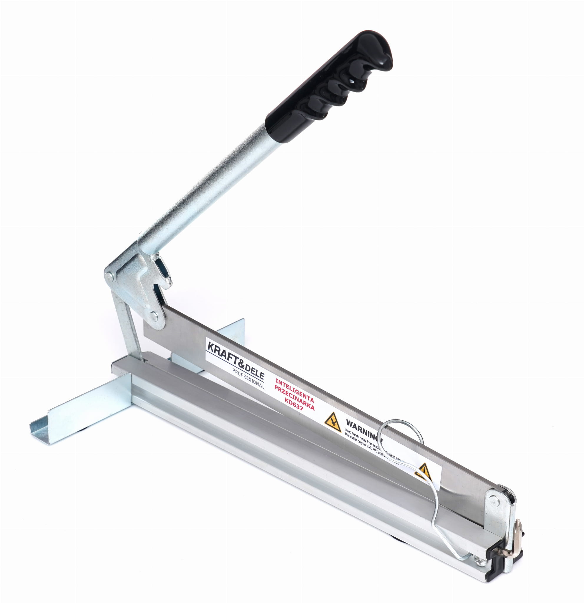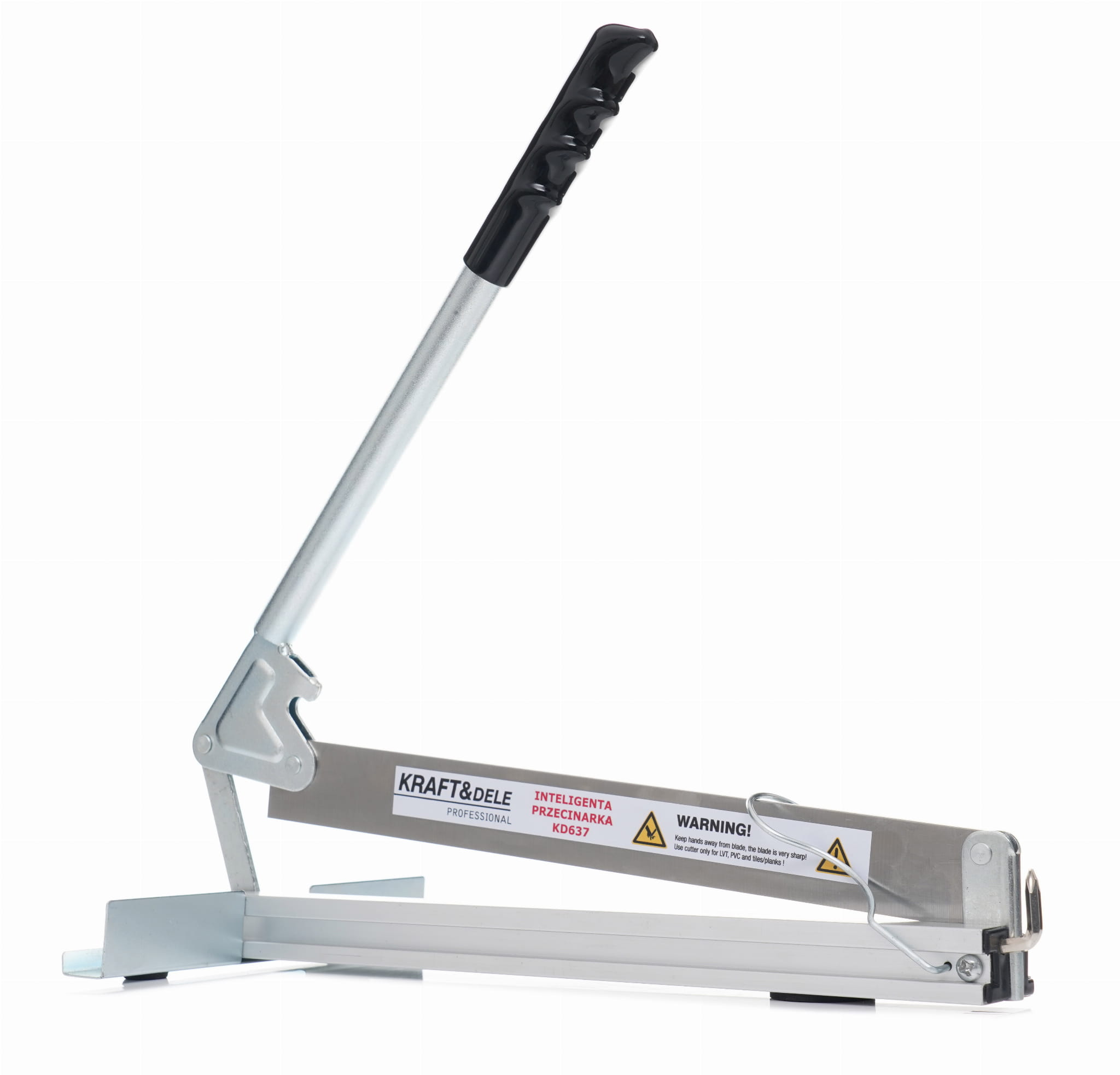 Ręczna gilotyna do cięcia paneli laminowanych, MDF, PCV, winylowych i innych materiałów podłogowych oraz elewacyjnych. Pracuje bez zasilania elektrycznego, nie wytwarza pyłu i umożliwia precyzyjne cięcia pod kątem 45° oraz 90°.