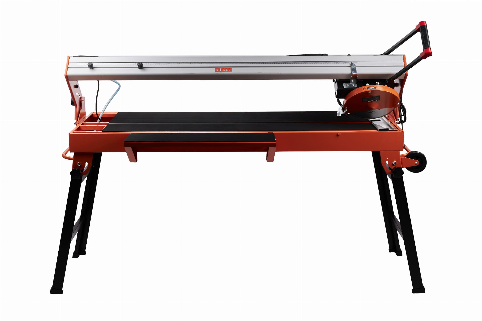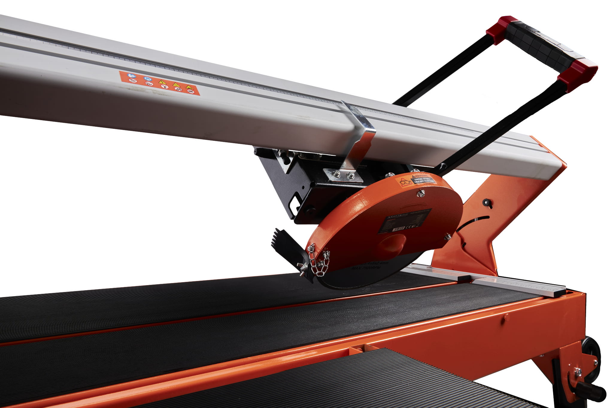 Uchwyt przedłużający zapewnia dodatkowe podparcie dla większych płyt podczas cięcia, zmniejszając ryzyko pęknięcia materiału przy wyjściu tarczy. Kółka transportowe ułatwiają przemieszczanie urządzenia o wadze 58 kg na placu budowy.