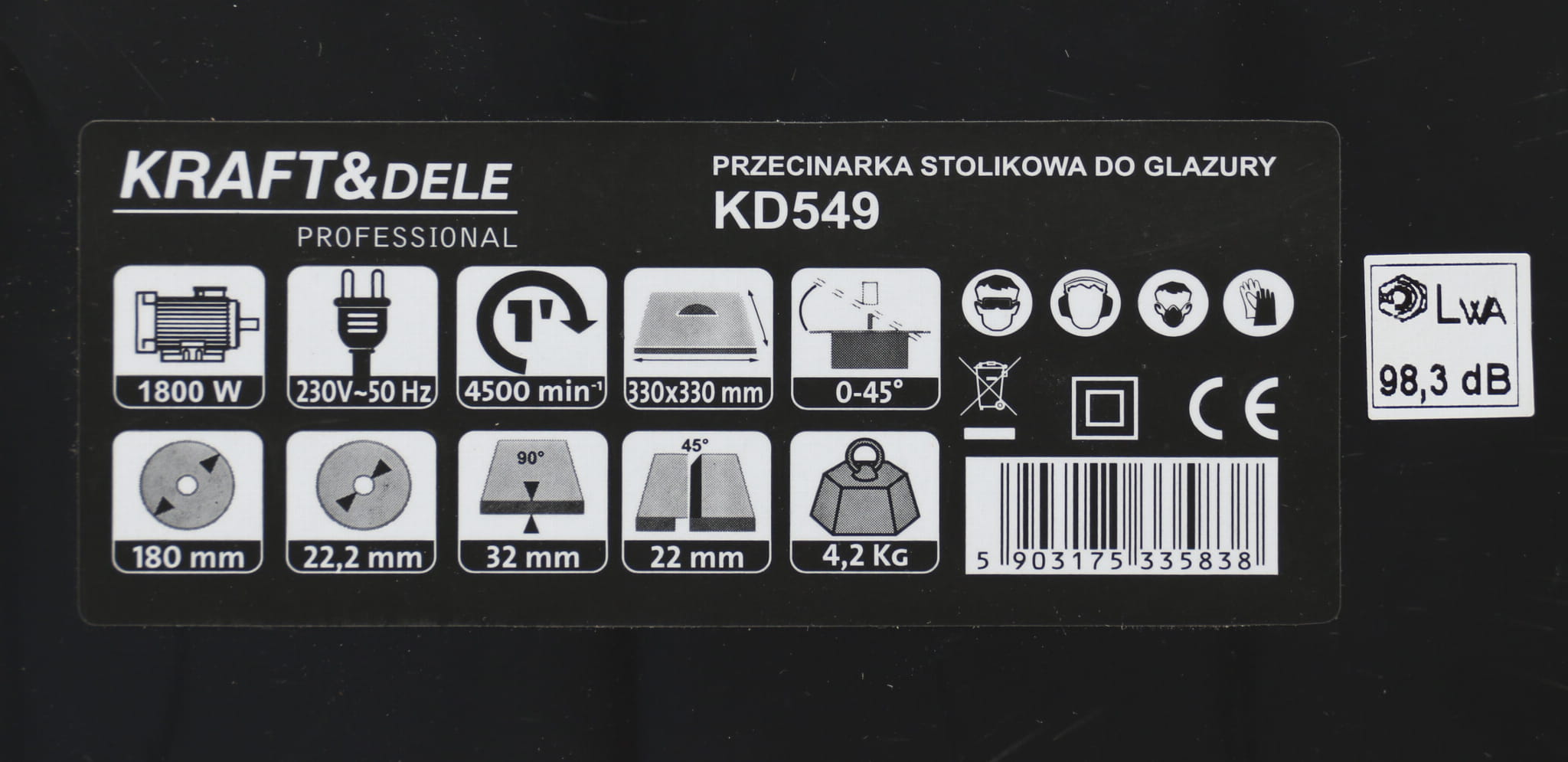 Tarcza o średnicy 180 mm z otworem mocującym 22,2 mm umożliwia cięcie płytek ceramicznych, gresu, terakoty i podobnych materiałów. Prędkość obrotowa bez obciążenia wynosi 4500 rpm, co przekłada się na płynne prowadzenie cięcia bez nadmiernego odpryskiwania krawędzi.