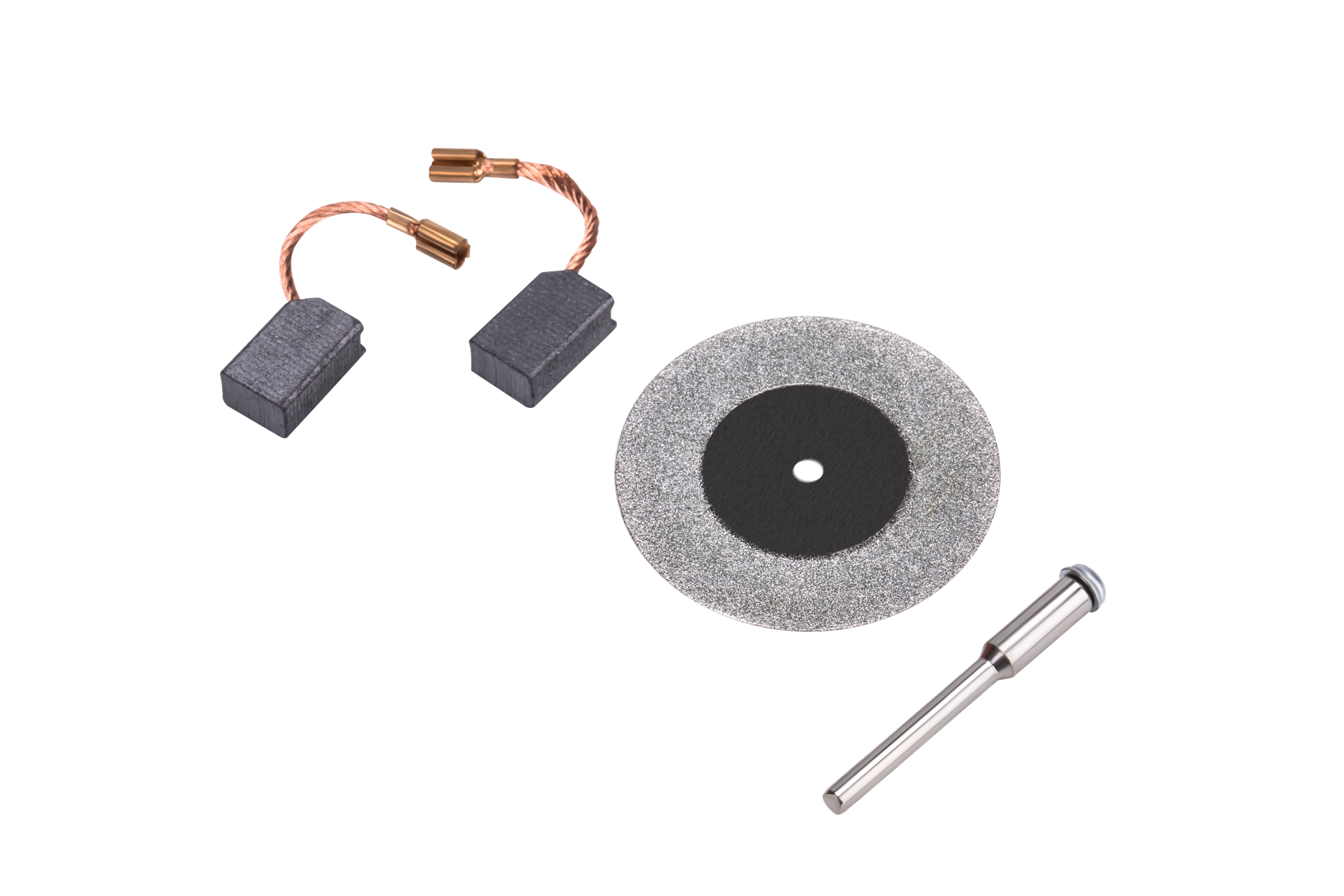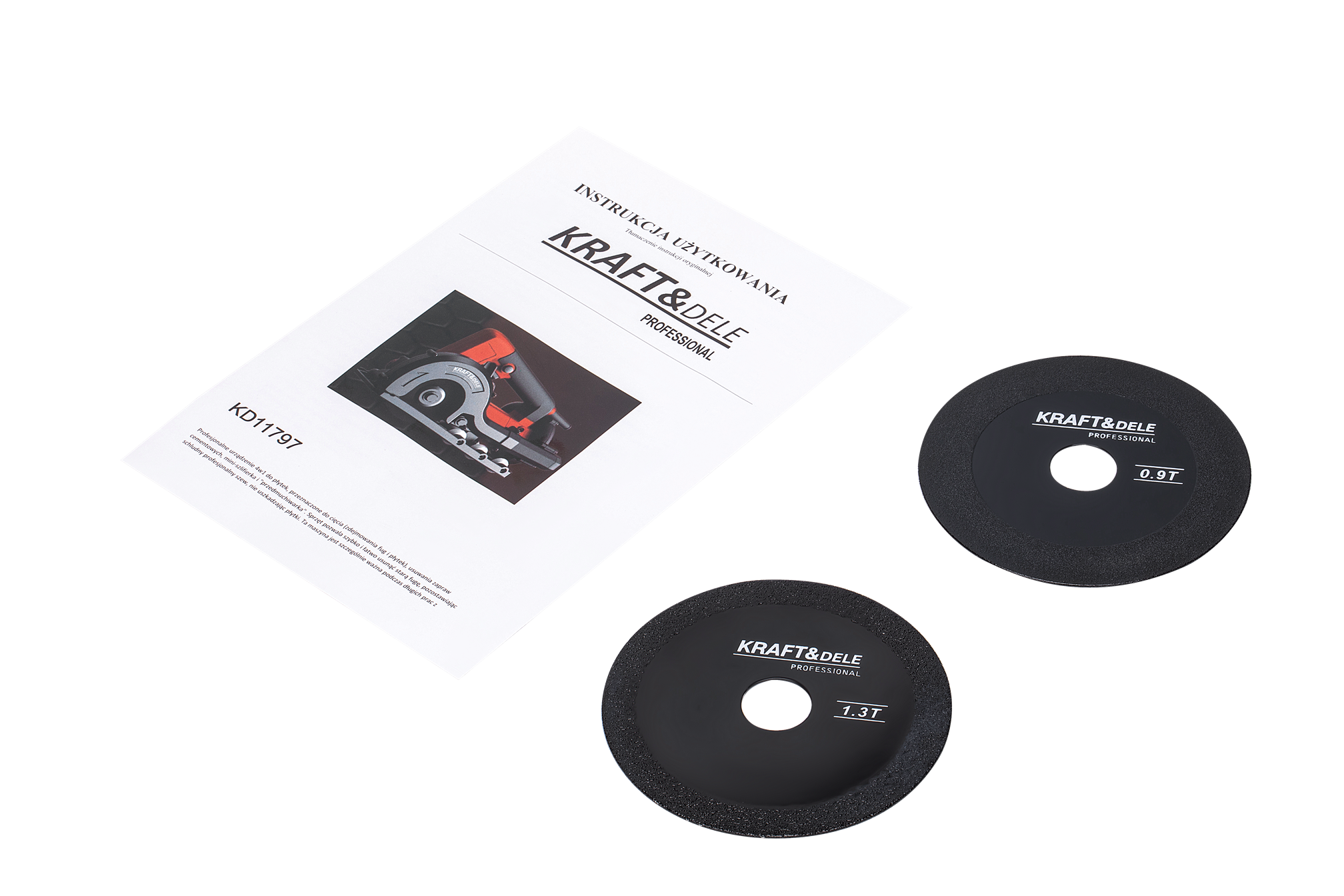 W zestawie dostępne są dwie tarcze tnące o różnej grubości: 1,3T (grubsza, bardziej wytrzymała, do twardszych materiałów) oraz 0,9T (cieńsza, do precyzyjniejszych cięć z mniejszą stratą materiału). Tarcze kompatybilne z urządzeniem muszą mieć średnicę 100mm i otwór montażowy 20mm. Przed zakupem dodatkowych tarcz należy zweryfikować oba wymiary.