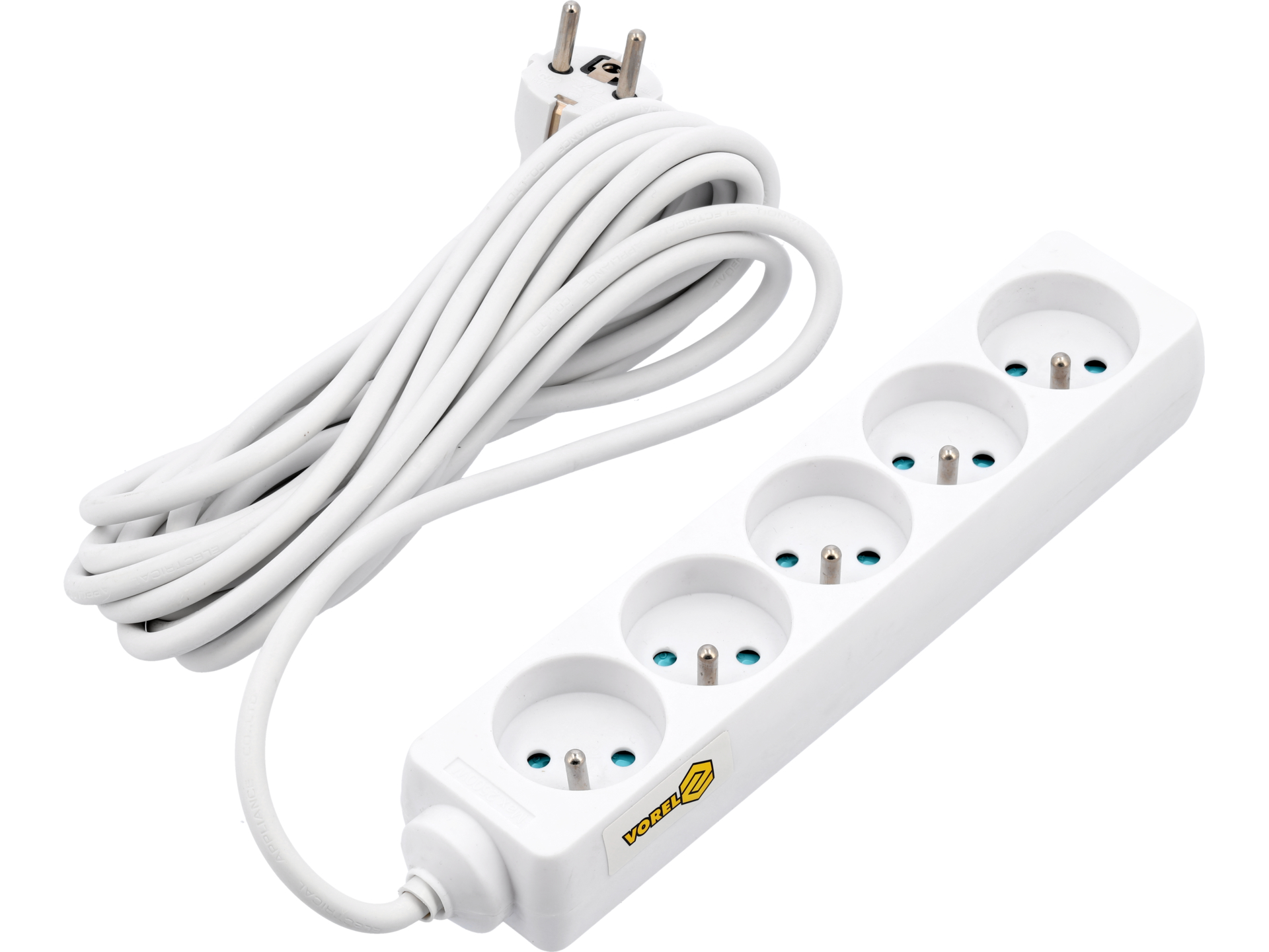 Przedłużacz elektryczny z pięcioma gniazdami schuko umożliwia jednoczesne zasilanie wielu urządzeń z jednego źródła prądu. Model VOREL 72510 wyposażono w przewód o długości 5 metrów oraz system uziemienia chroniący przed porażeniem prądem.