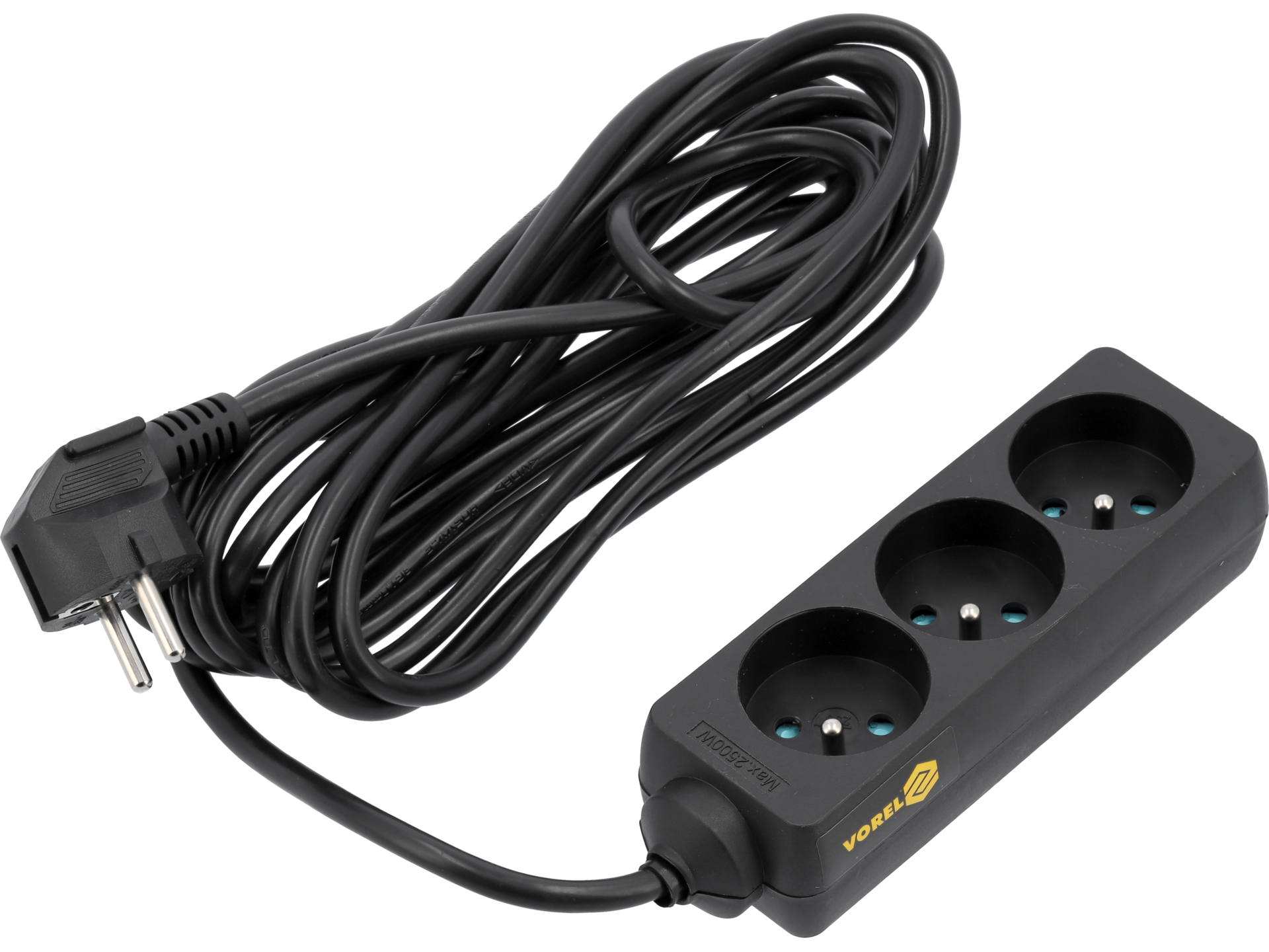 Przedłużacz elektryczny z trzema gniazdami typu francuskiego (z uziemieniem) i przewodem o długości 5 metrów. Przeznaczony do zasilania urządzeń gospodarstwa domowego, sprzętu biurowego oraz elektronarzędzi w pomieszczeniach zamkniętych.