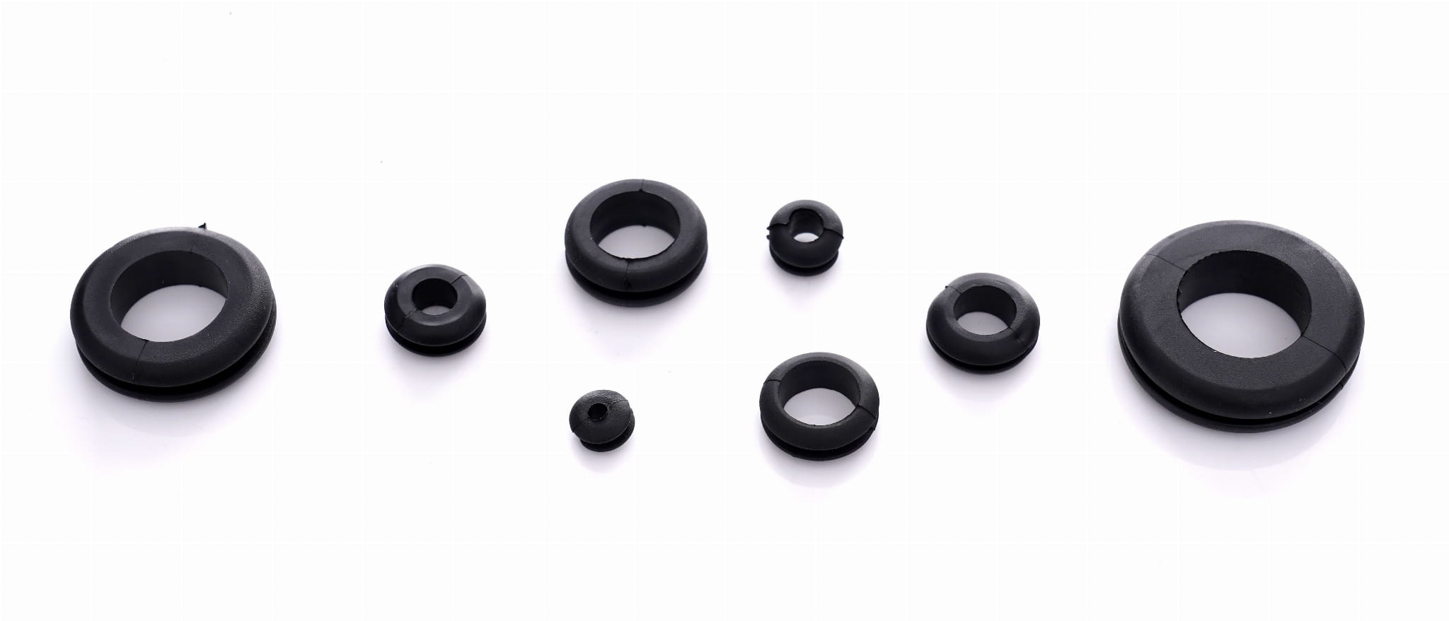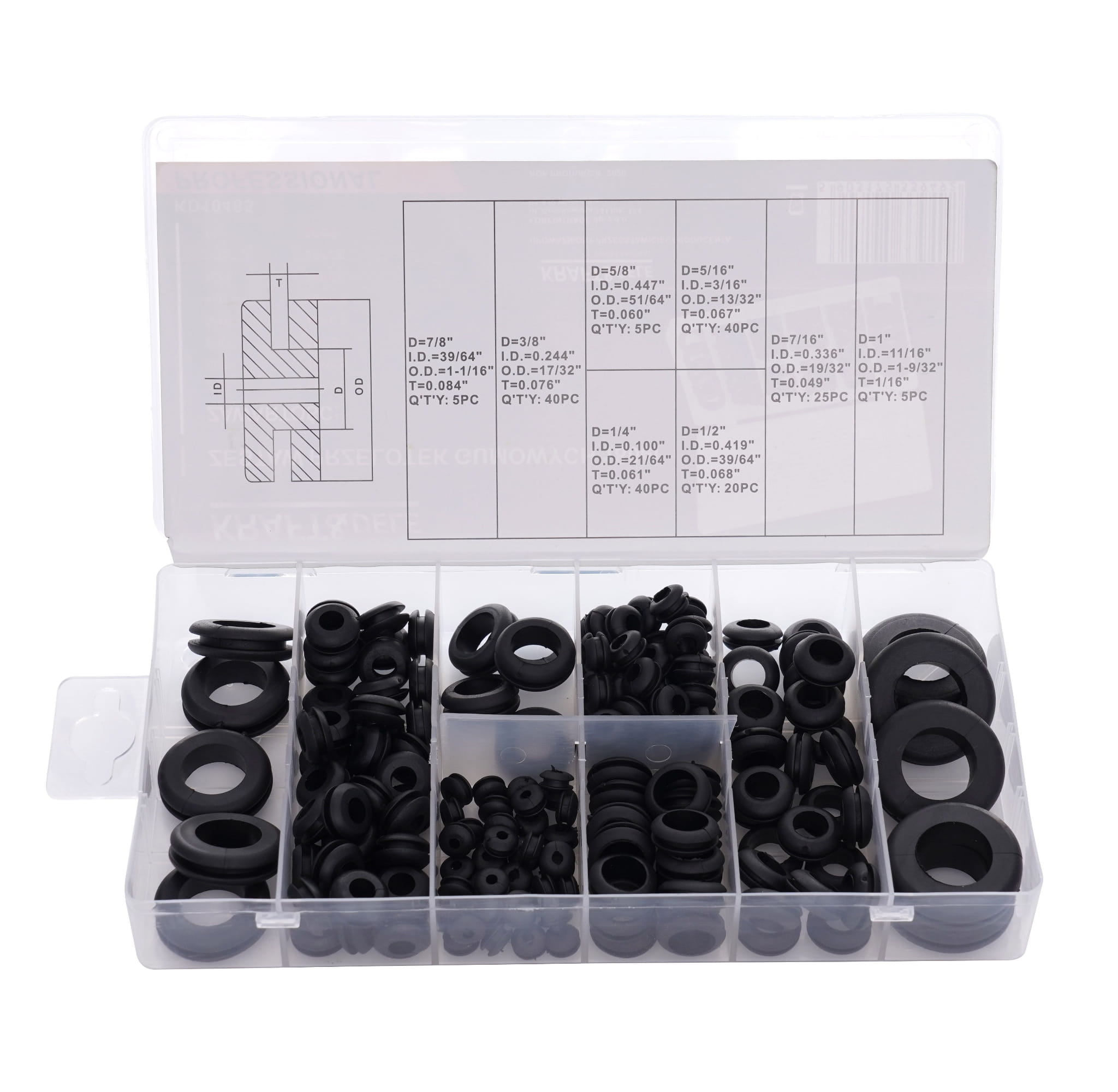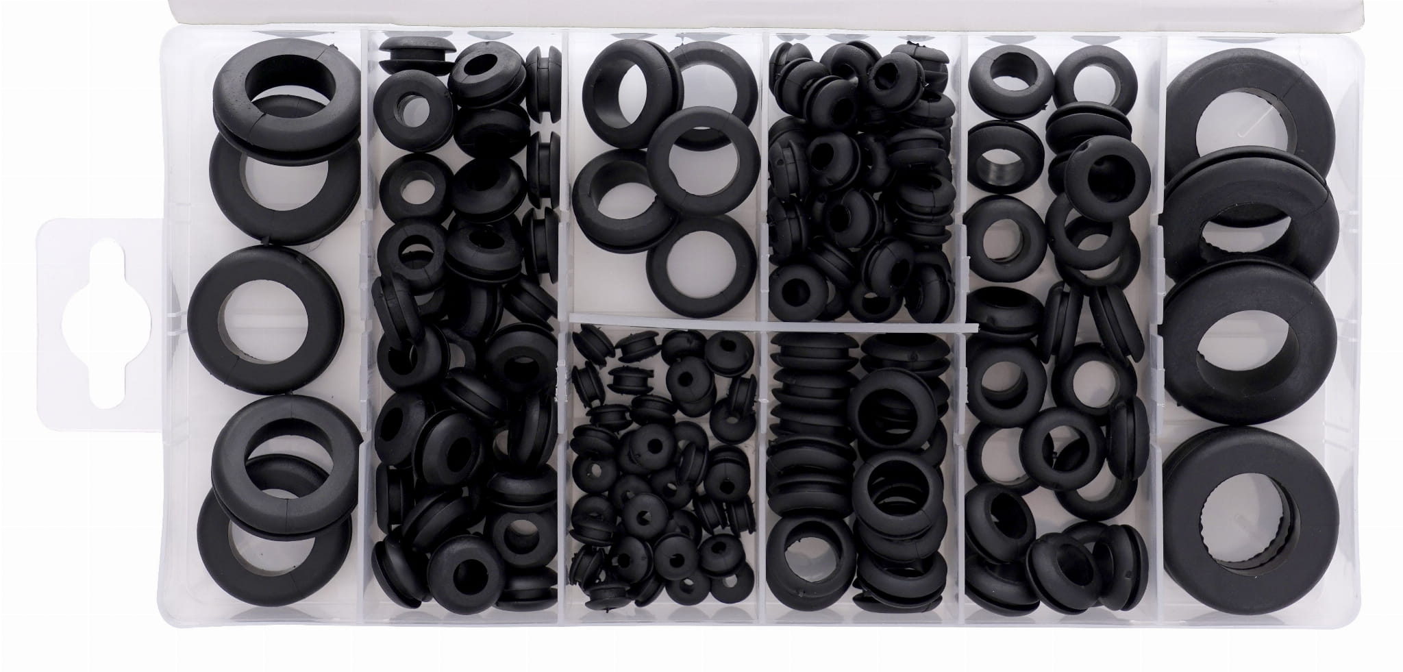 Zestaw 180 przelotek gumowych w różnych rozmiarach, przeznaczonych do wykańczania otworów w blachach, obudowach i panelach. Przelotki chronią przeprowadzane przez otwory przewody, kable i rury przed przetarciem o ostre metalowe krawędzie, a jednocześnie pozwalają dopasować efektywną średnicę otworu do przekroju prowadzonego elementu.