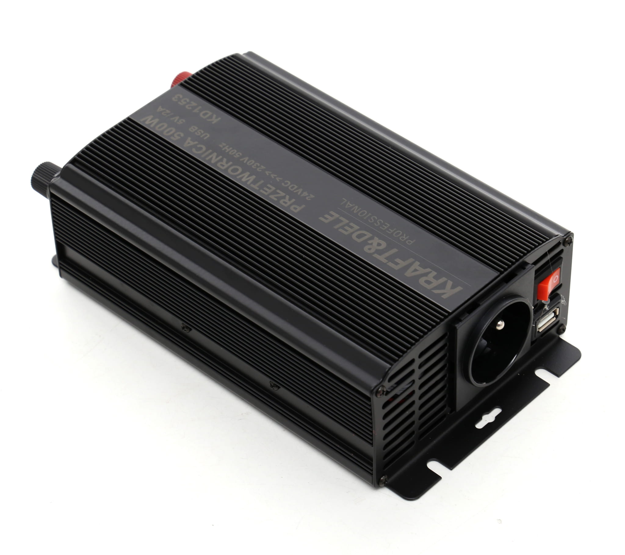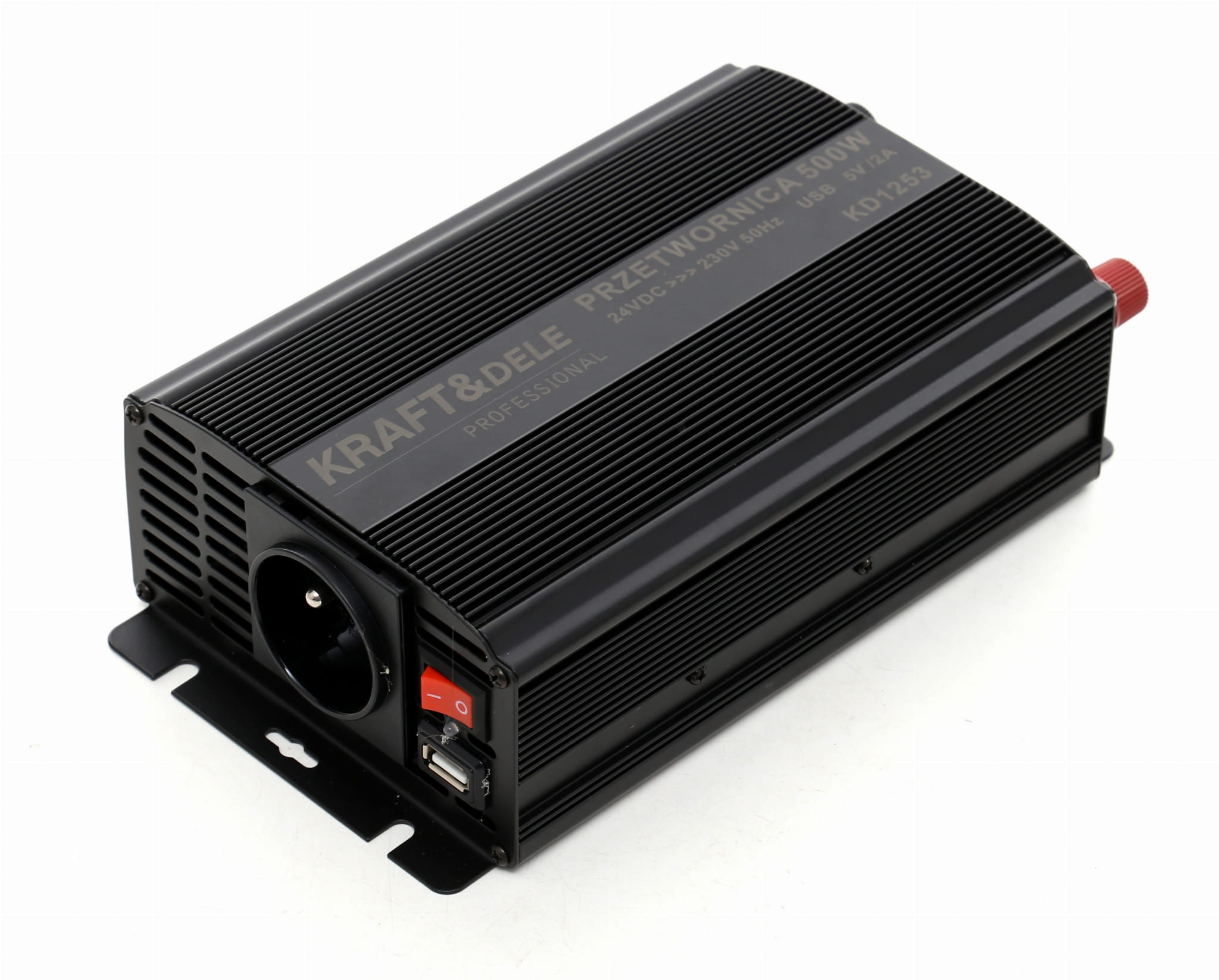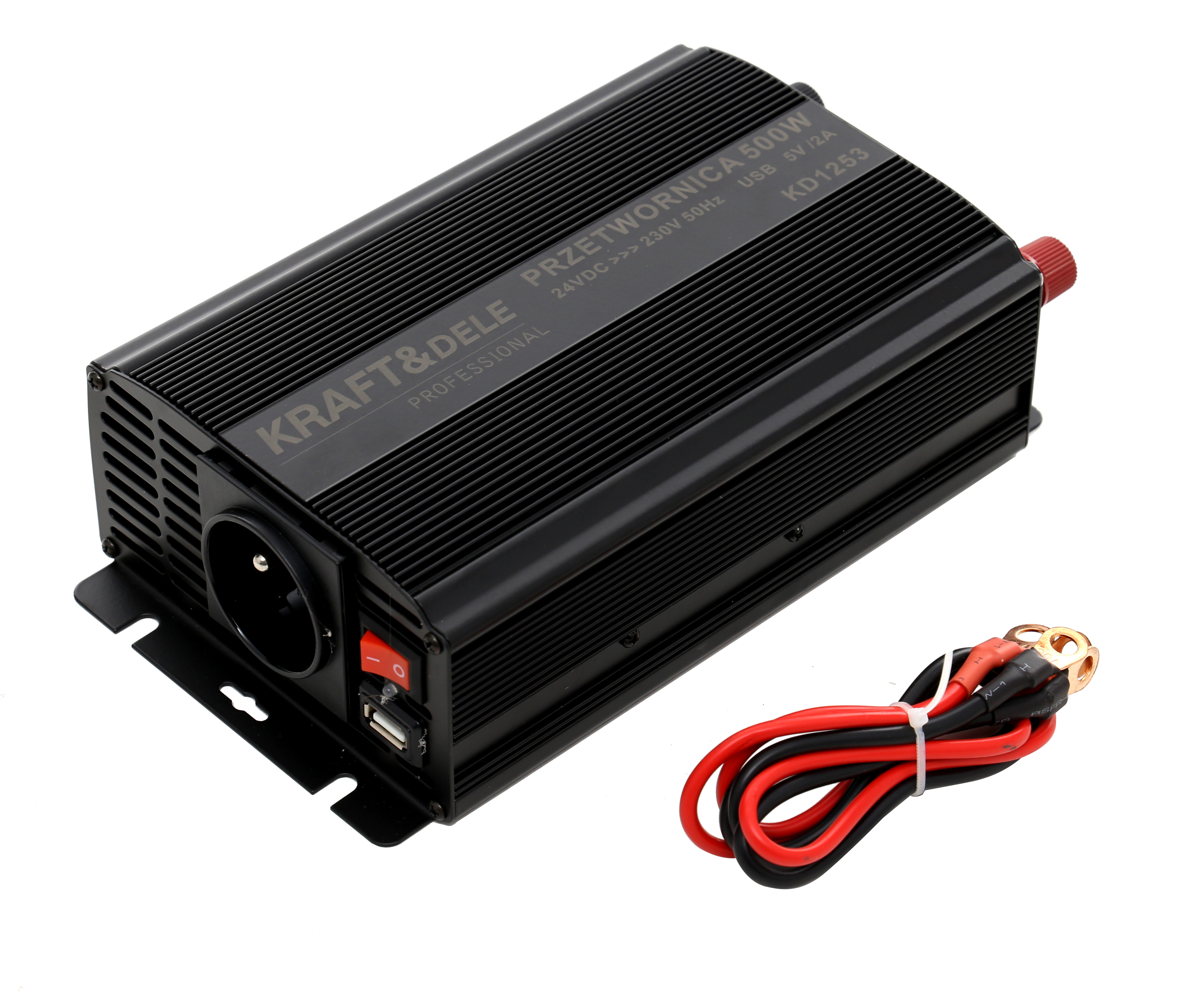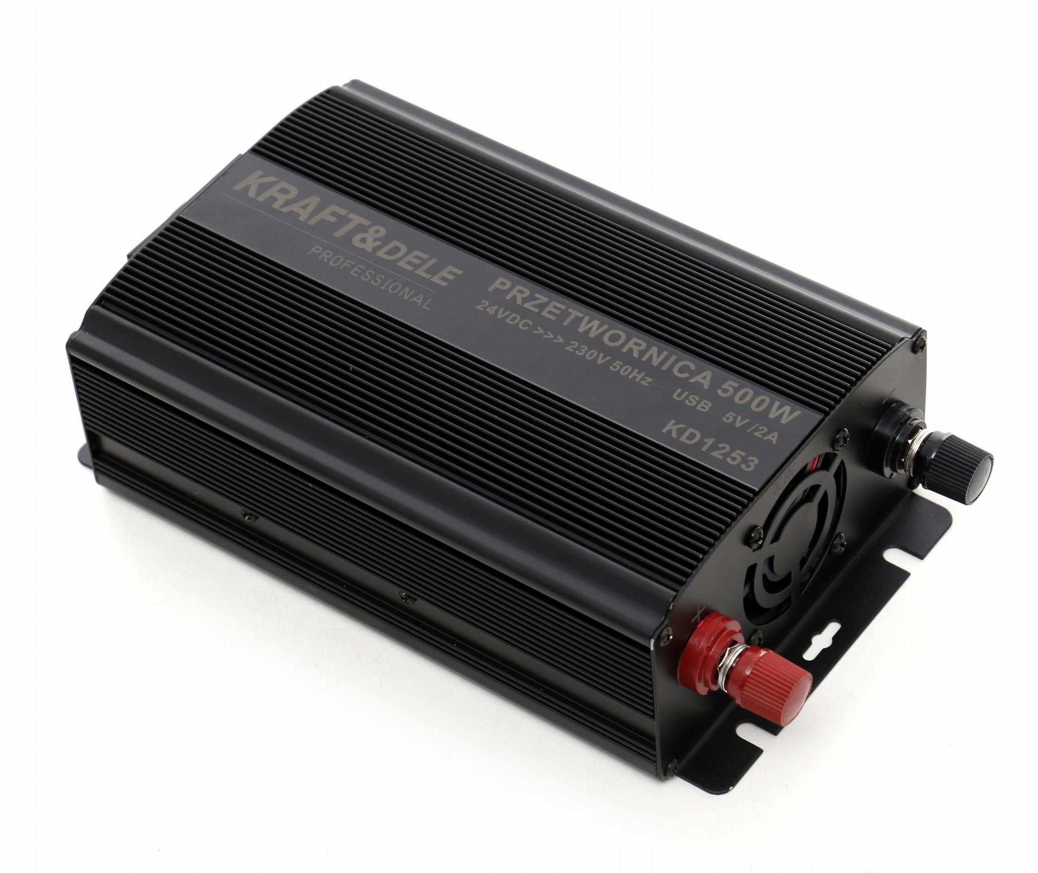 Przetwornica KD1253 to urządzenie przekształcające napięcie stałe 24V DC (z akumulatora) na napięcie przemienne 230V AC, umożliwiając zasilanie standardowego sprzętu elektrycznego poza siecią energetyczną. Model przeznaczony do pojazdów ciężarowych, autobusów oraz maszyn roboczych wyposażonych w instalację 24V.