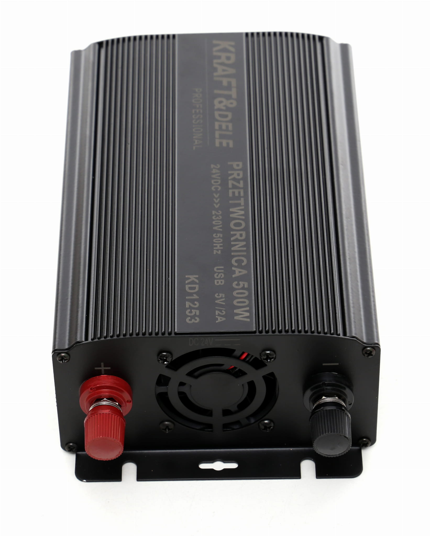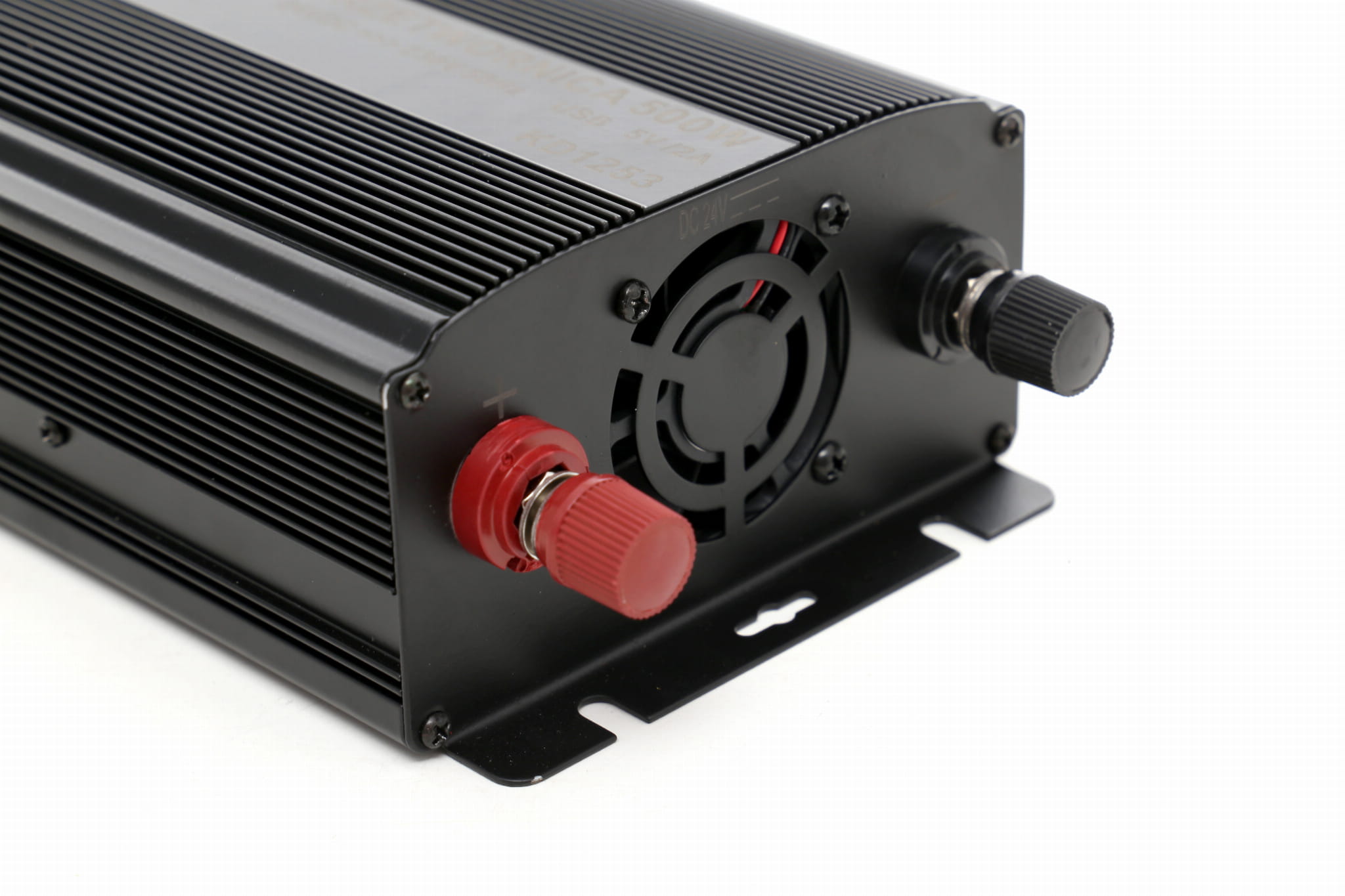 Przetwornica pracuje ciągle przy obciążeniu do 500W. Moc impulsowa 1000W obsługuje krótkotrwałe skoki poboru mocy, typowe przy rozruchu silników narzędzi elektrycznych lub lamp wyładowczych — bez wyłączania urządzenia.