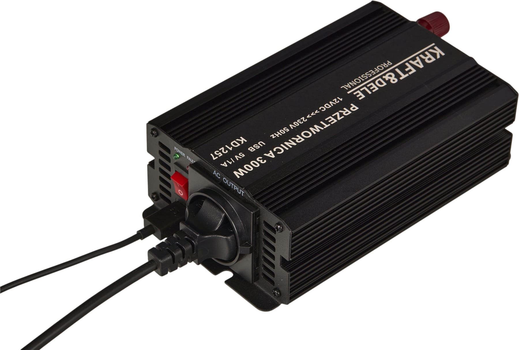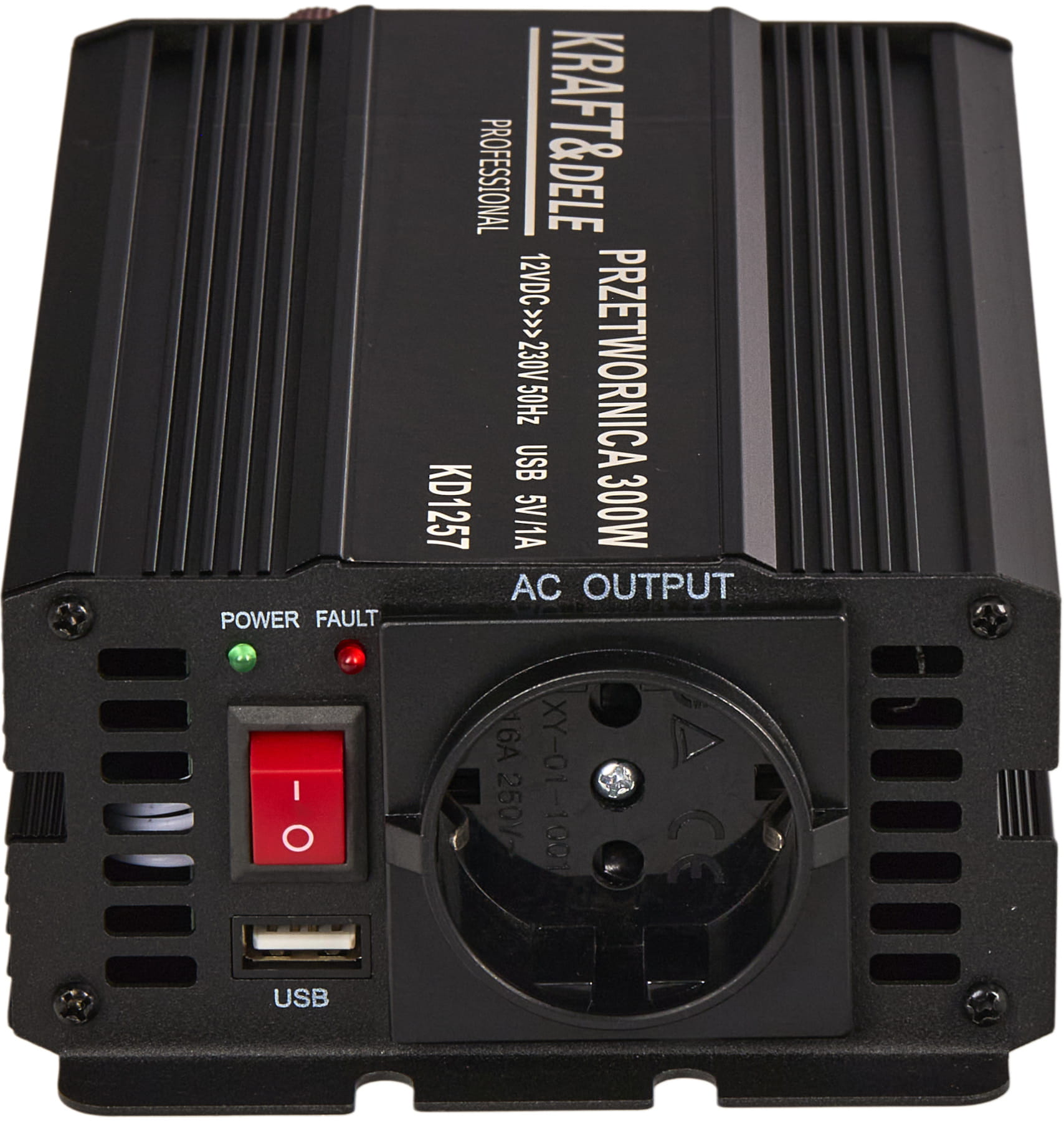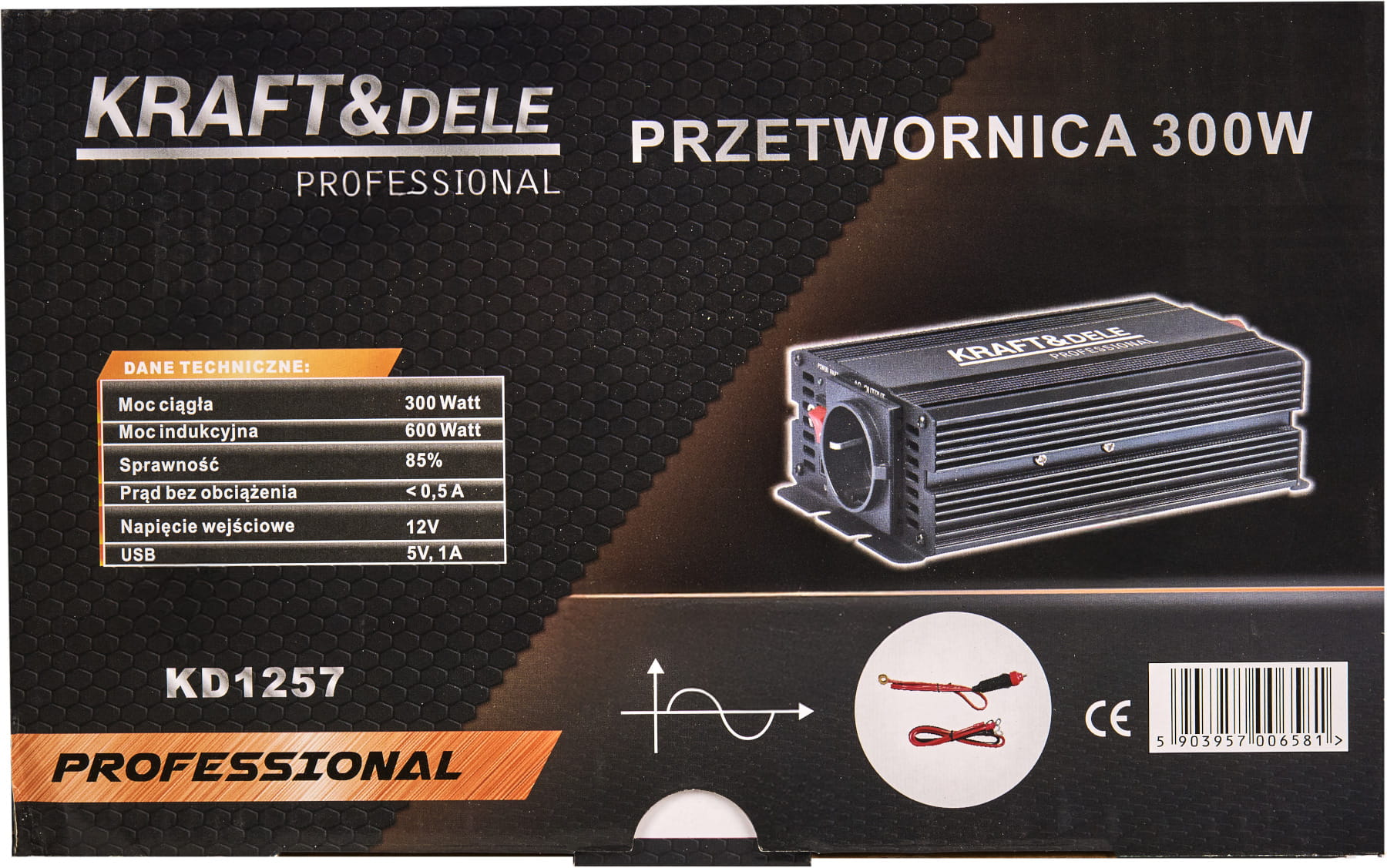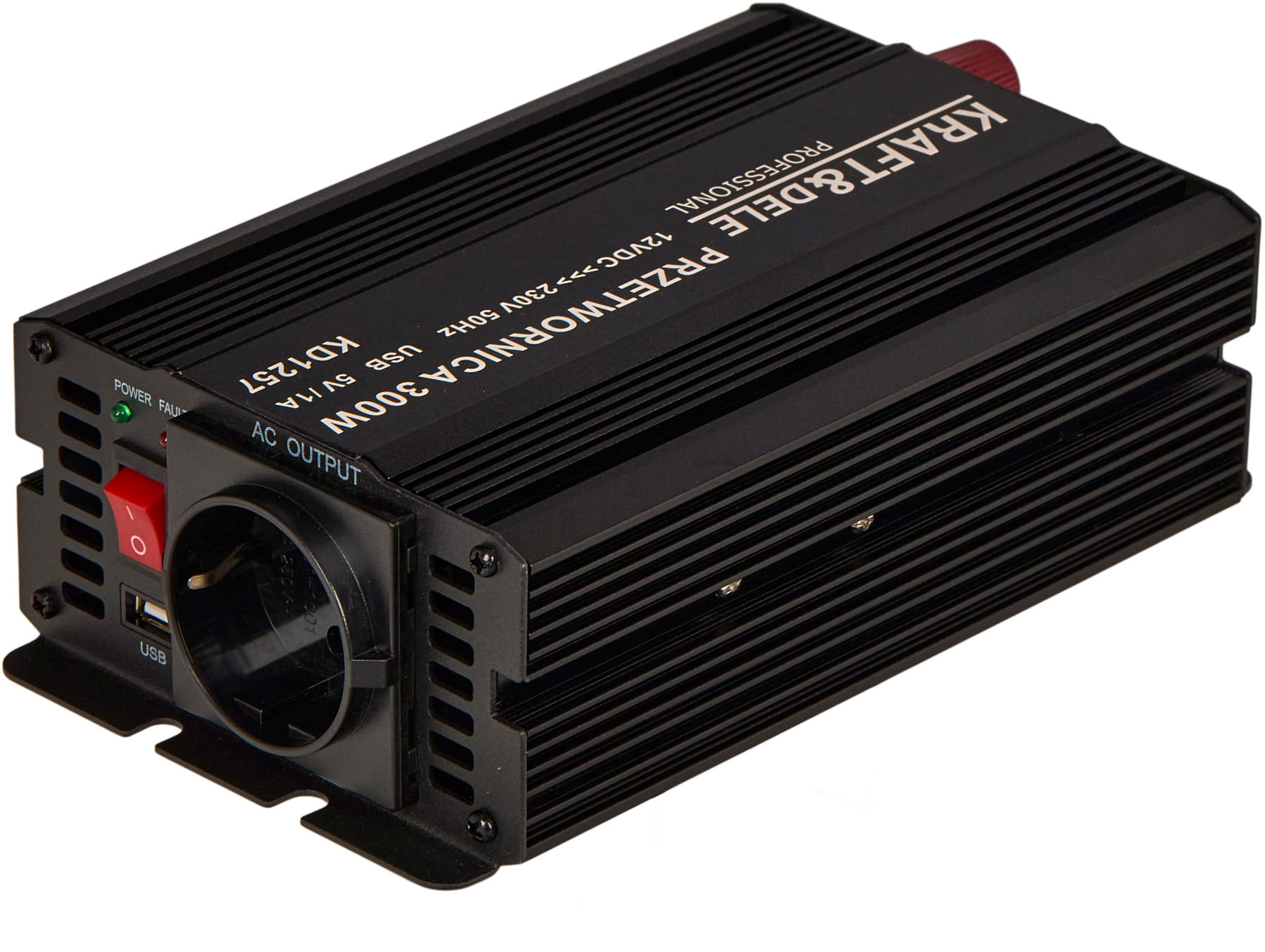 KD1257 to inwerter DC/AC zamieniający napięcie stałe 12V (akumulator samochodowy lub instalacja pojazdu) na napięcie przemienne 230V o przebiegu czystej sinusoidy. Oznacza to, że kształt napięcia wyjściowego jest identyczny z tym dostarczanym przez standardową sieć energetyczną — bez zakłóceń i harmonicznych charakterystycznych dla przetwornic quasi-sinusoidalnych.