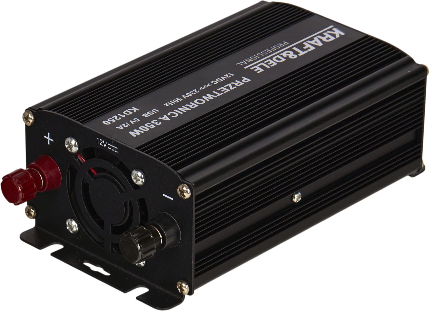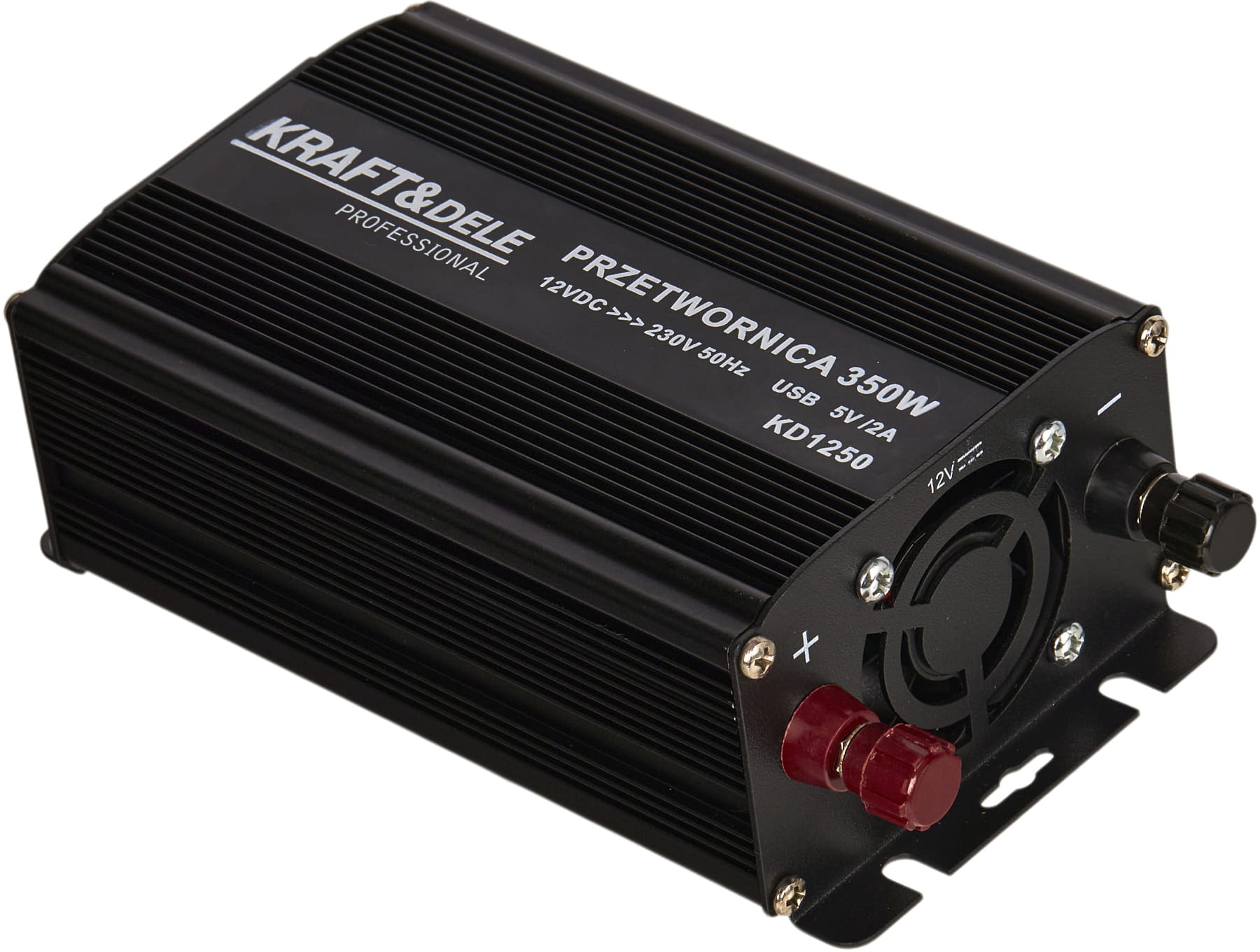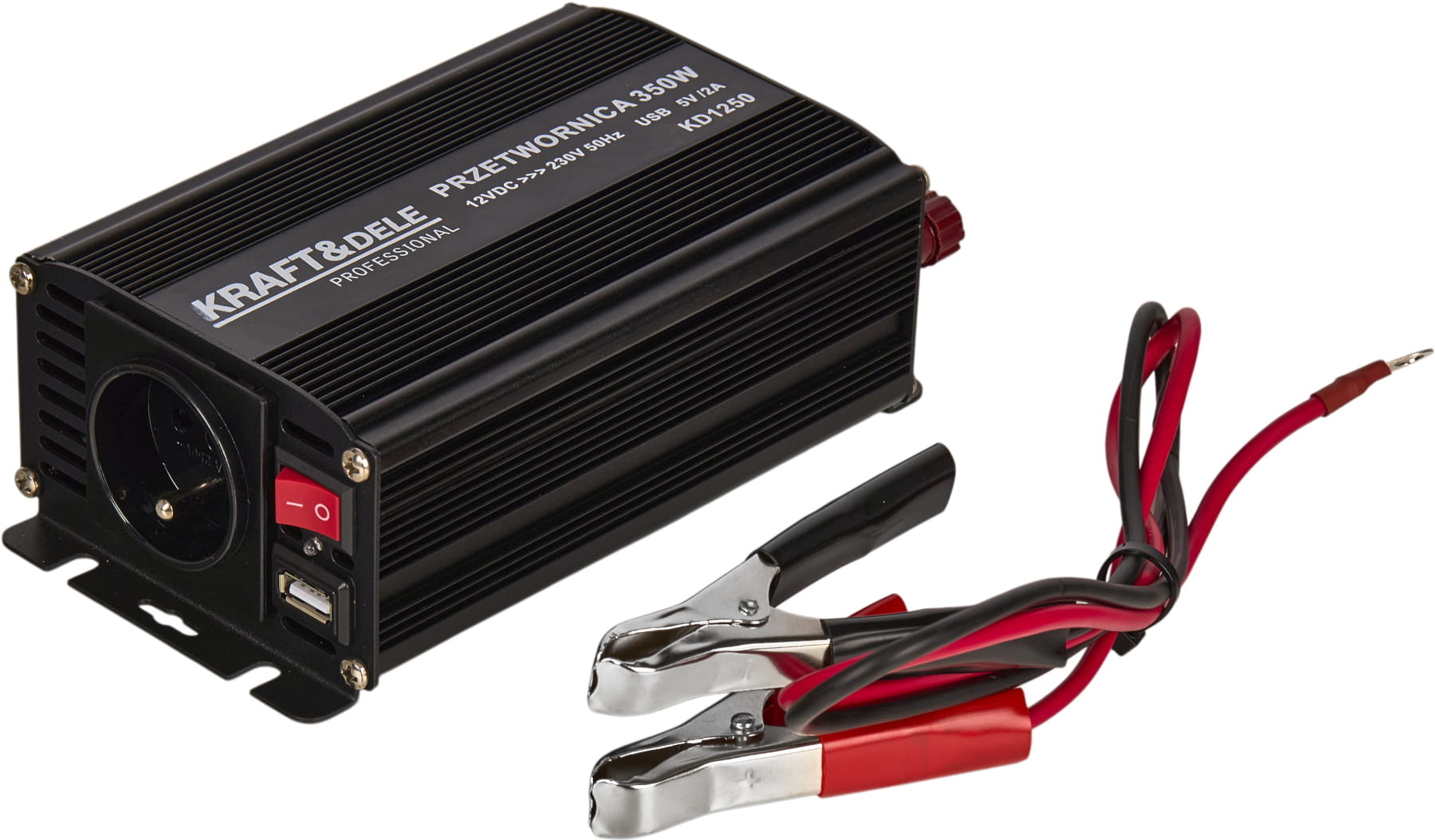 Przetwornica KD1250 to inwerter DC/AC przekształcający napięcie stałe 12V z akumulatora samochodowego lub instalacji pojazdu na napięcie przemienne 230V AC. Umożliwia zasilanie standardowych urządzeń elektrycznych w warunkach mobilnych — bez dostępu do sieci energetycznej.