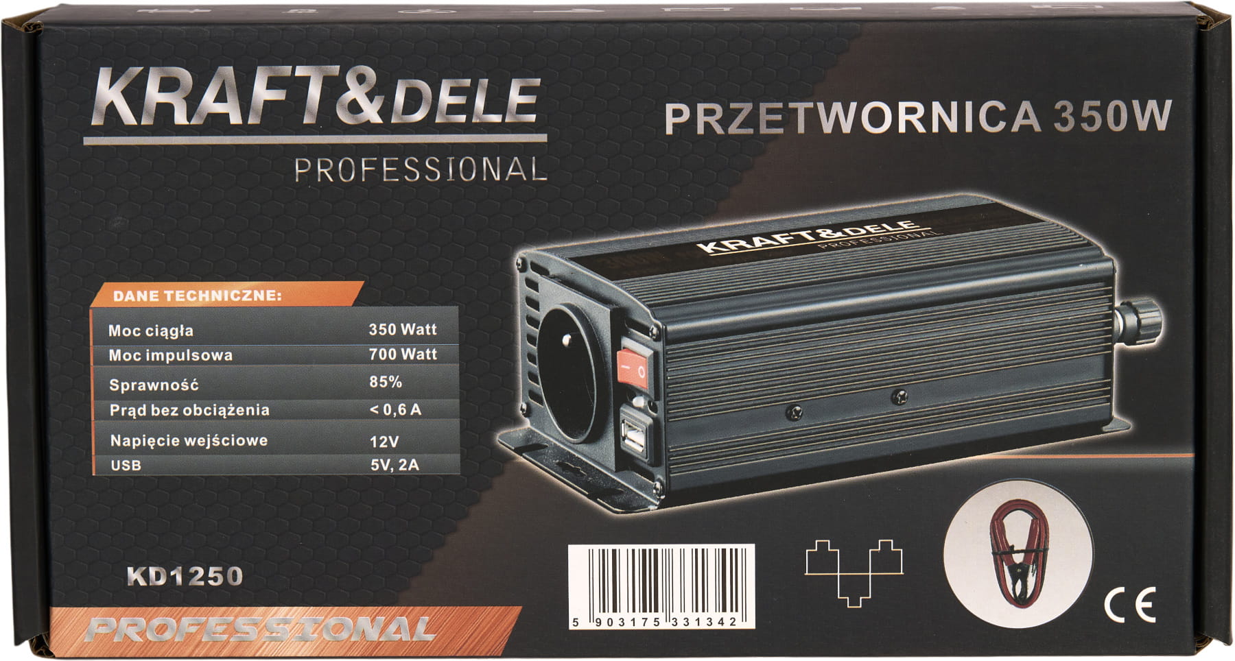 W skład zestawu wchodzą: przetwornica KD1250, kable do podłączenia akumulatora, instrukcja obsługi w języku polskim oraz oryginalne opakowanie. Gwarancja producenta wynosi 12 miesięcy.