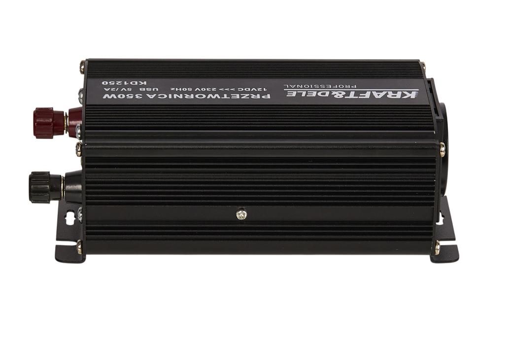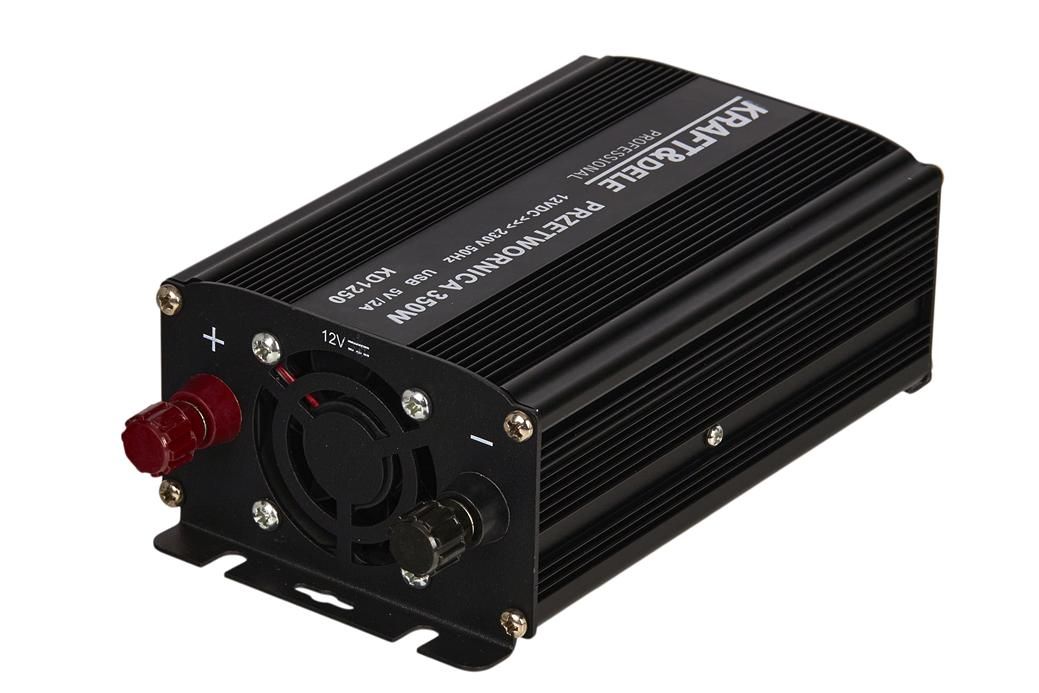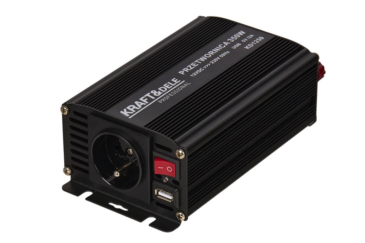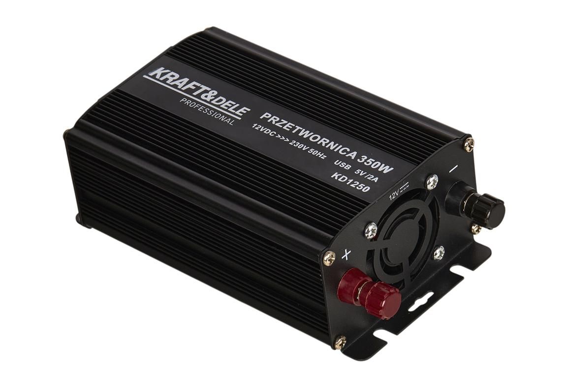 Przetwornica samochodowa 350W 12V/24V - 230V KD1250 KRAFT&DELE to dopracowana przetwornica DC/AC do wygodnego zasilania sprzętu 230V z akumulatora. Jeśli szukasz praktycznego rozwiązania do auta i pracy mobilnej, model KD1250 oferuje sensowną moc, zabezpieczenia oraz dodatkowe ładowanie przez USB.