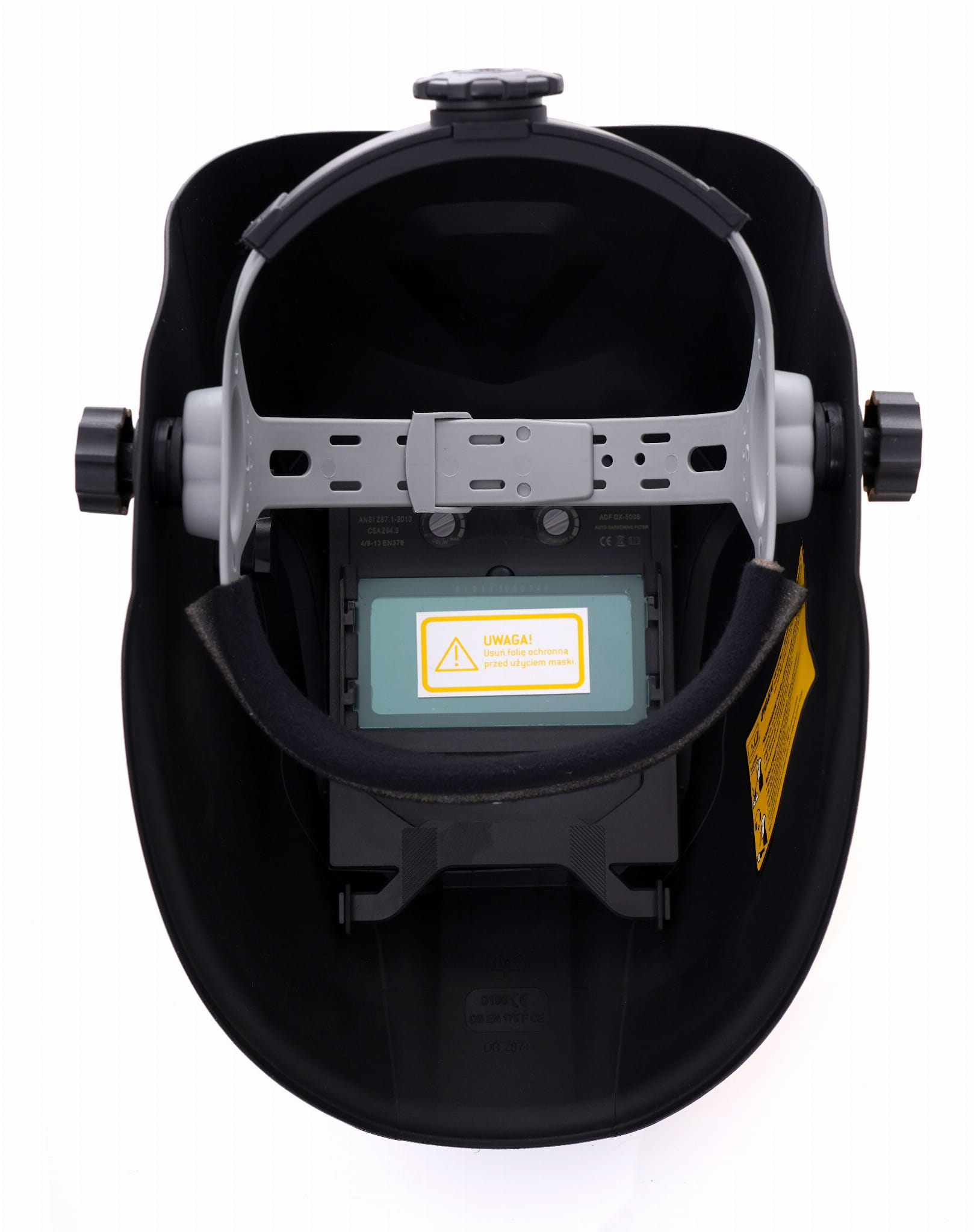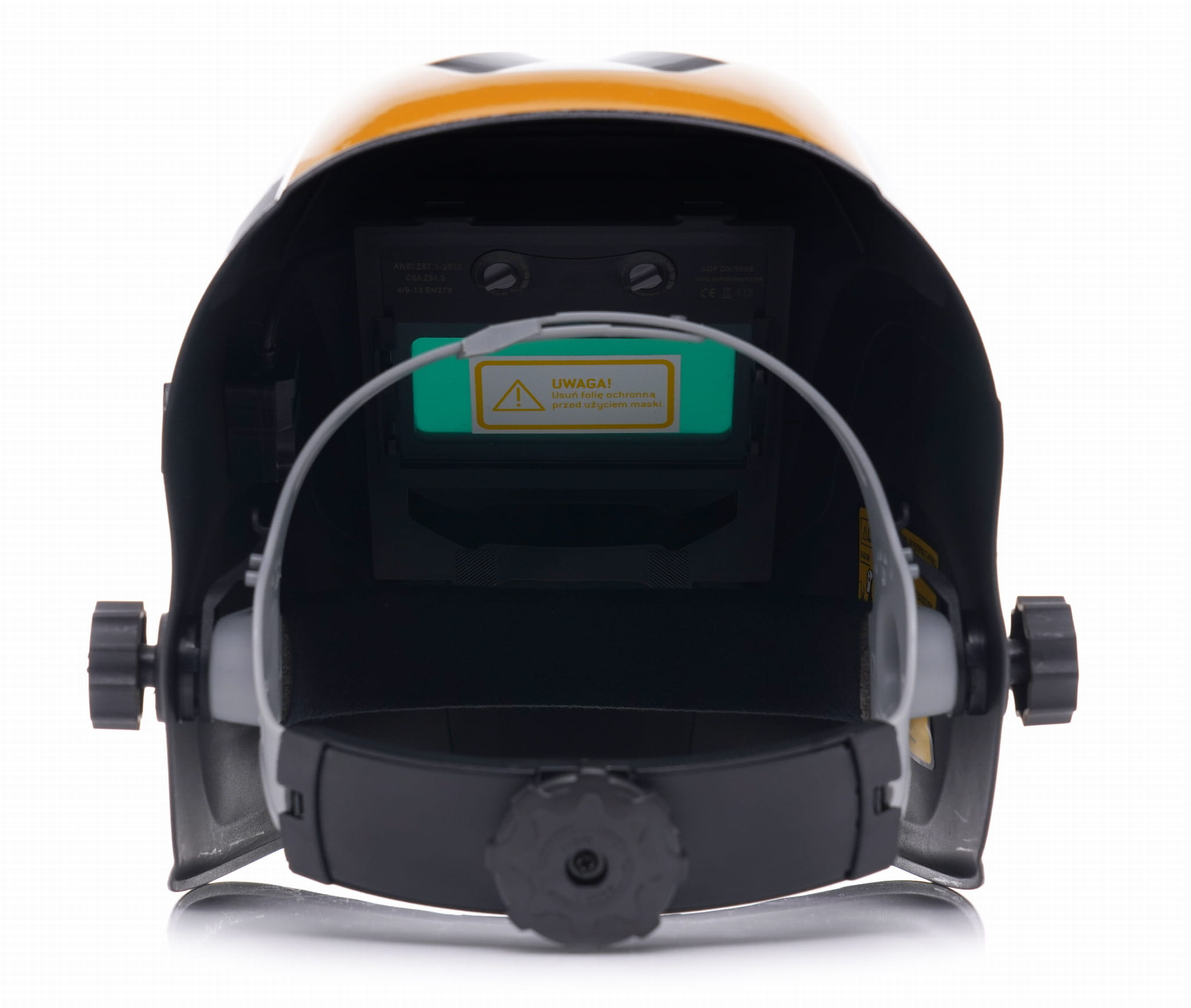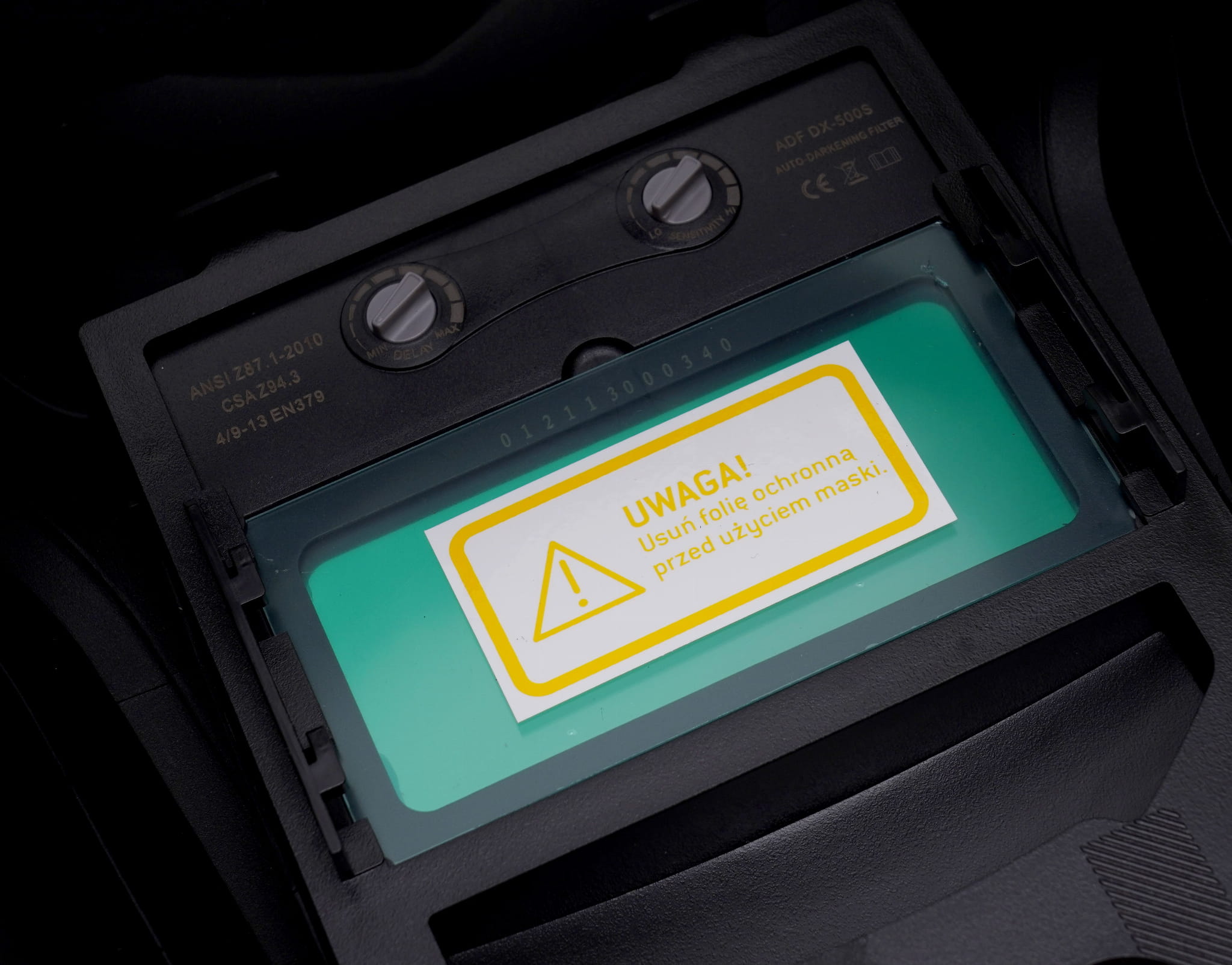 Filtr zapewnia ochronę przed promieniowaniem ultrafioletowym i podczerwonym na poziomie DIN 16 niezależnie od stanu pracy — zarówno w trybie rozjaśnionym, jak i zaciemnionym. Oznacza to, że oczy są chronione przez cały czas noszenia maski, nawet przed zapłonem łuku.