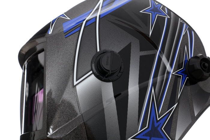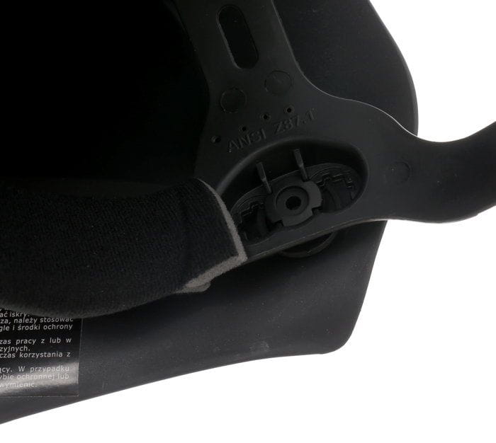 Pokrętło regulacji stopnia zaciemnienia (9–13 DIN) znajduje się na zewnętrznej powierzchni przyłbicy, w łatwo dostępnym miejscu. Umożliwia szybką zmianę ustawień bez zdejmowania ochrony głowy i bez narzędzi.