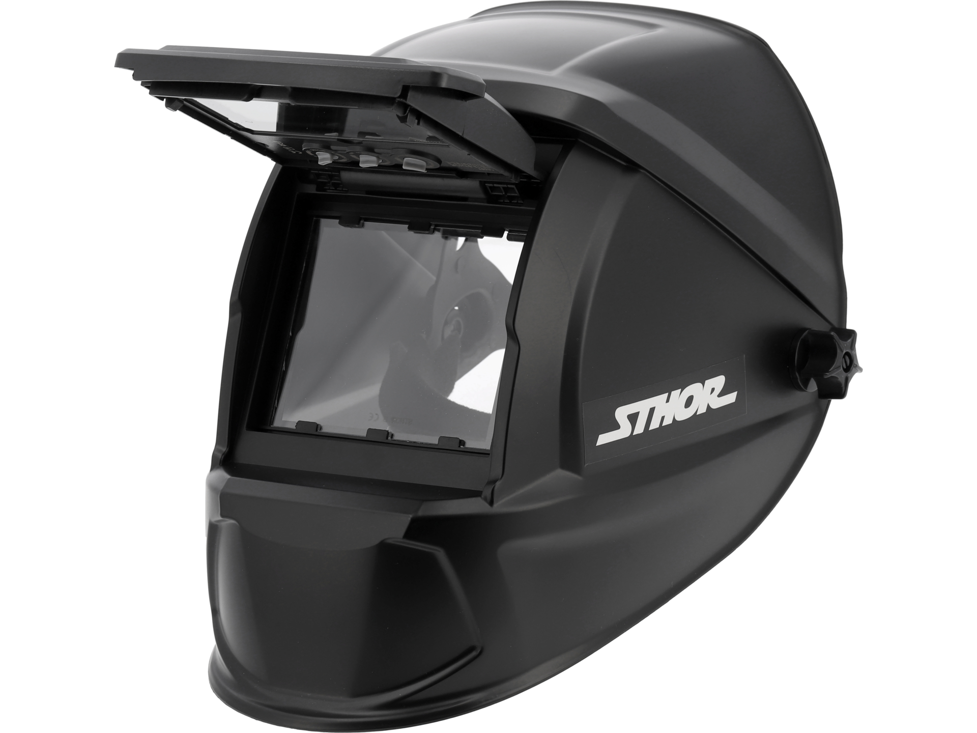 Mechanizm uchylny pozwala na szybkie podniesienie filtra spawalniczego bez zdejmowania przyłbicy. Funkcja przydatna podczas prac szlifierskich, kontroli spoiny czy przygotowania materiału – eliminuje konieczność ciągłego zakładania i zdejmowania ochrony.