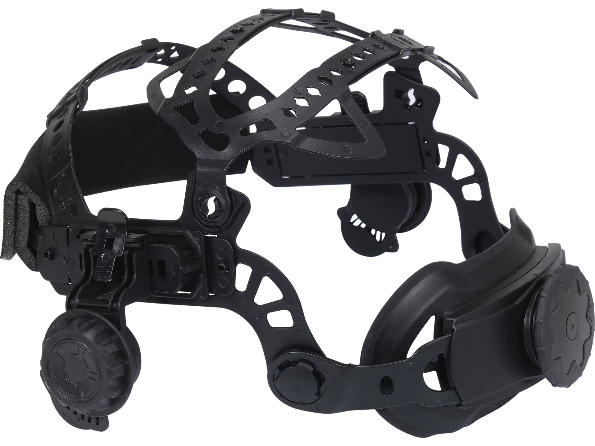 Czteropunktowa więźba z napotnikiem i systemem regulacji umożliwia dopasowanie przyłbicy do obwodu głowy i kąta nachylenia. Rozkład punktów mocowania równomiernie rozdziela ciężar konstrukcji, co redukuje obciążenie szyi podczas długotrwałej pracy. Nastawny nacisk opaski czołowej pozwala dostosować siłę docisku do indywidualnych preferencji.