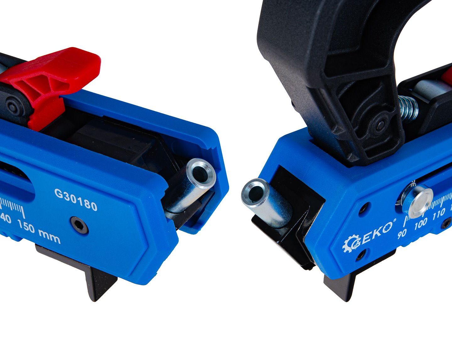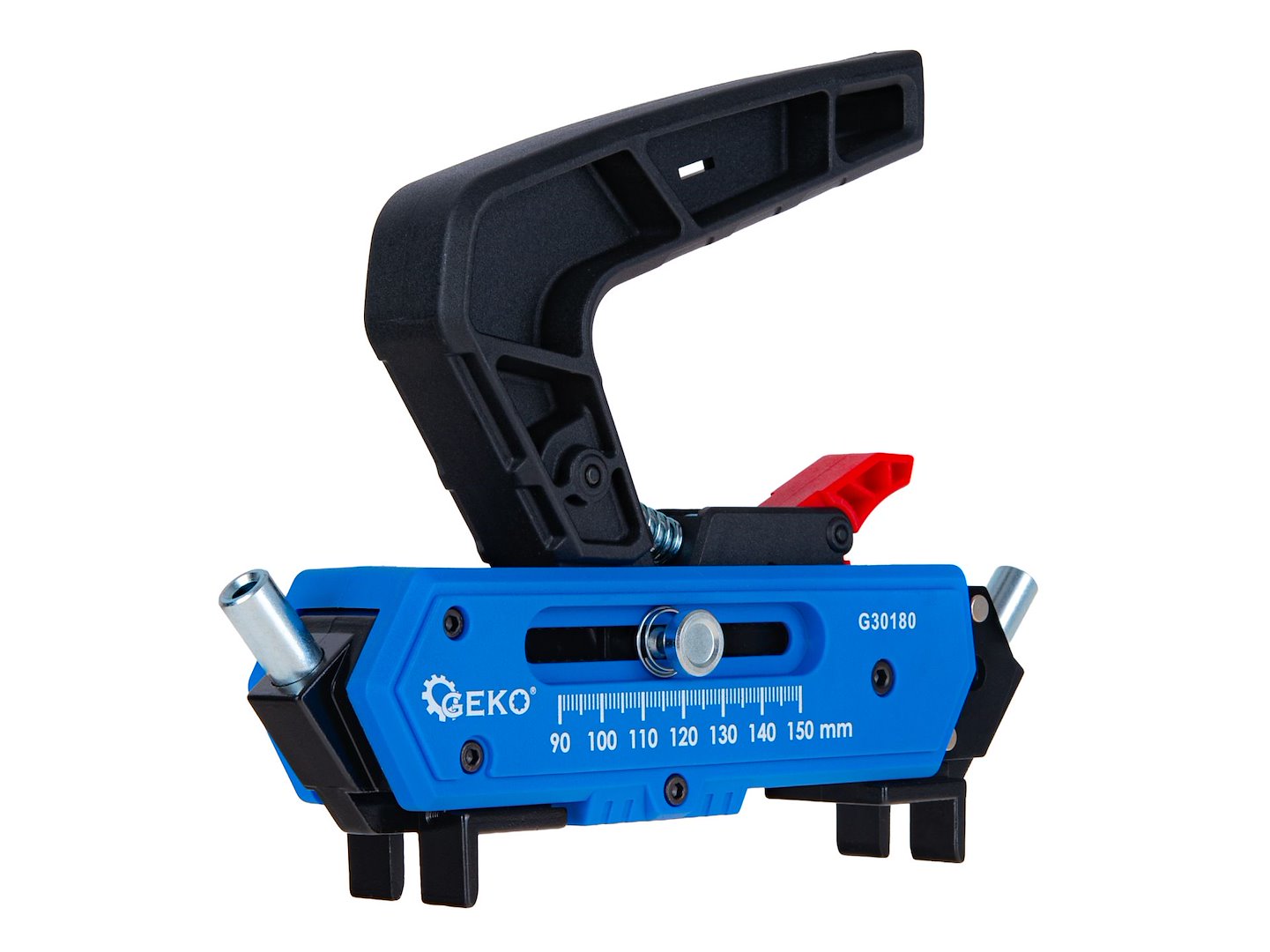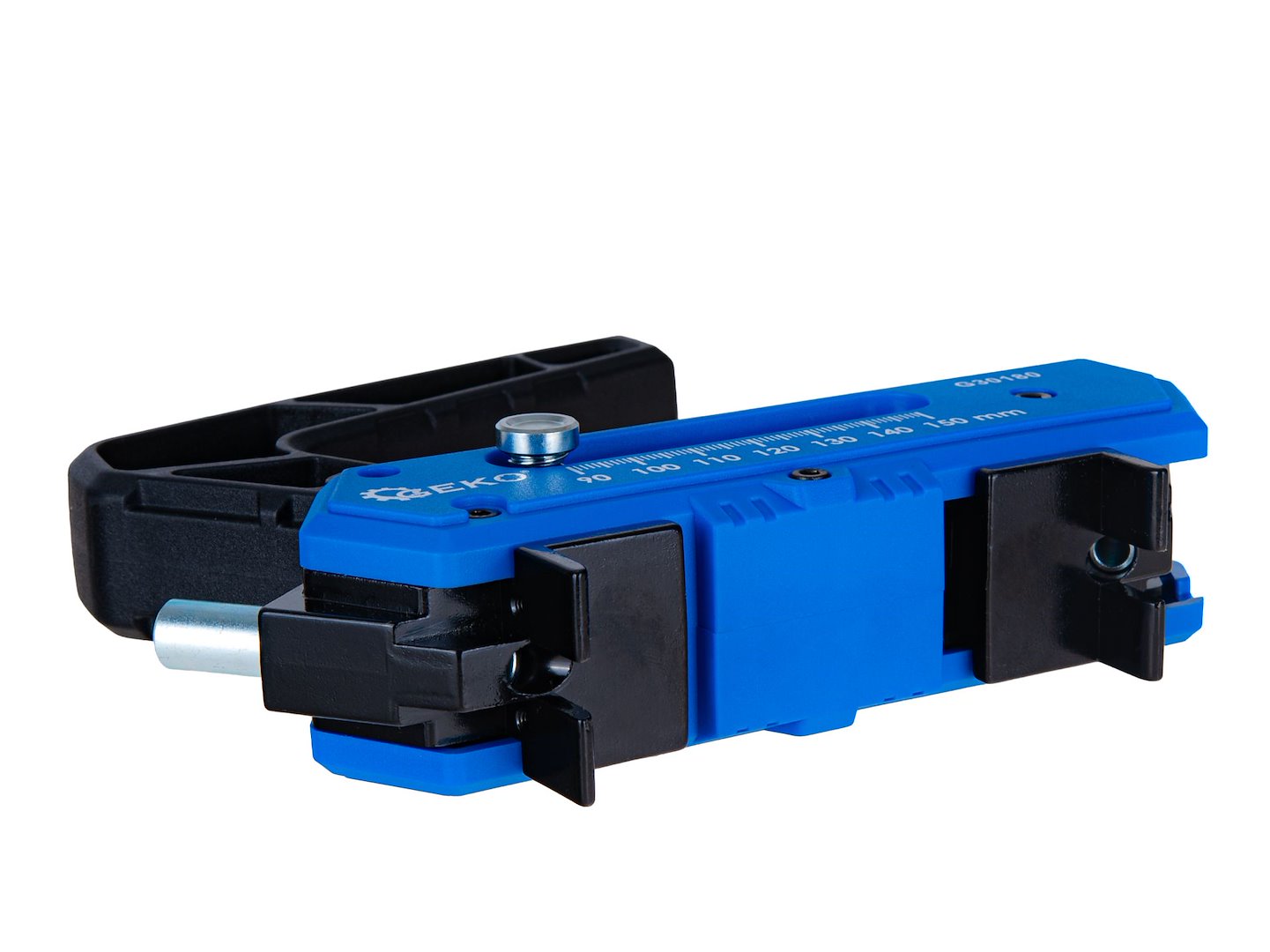 Czytelna podziałka z przesuwnym wskaźnikiem pozwala dopasować narzędzie do desek o szerokości od 90 do 150 mm bez użycia miarki. Eliminuje błędy wynikające z ręcznego odmierzania i przyspiesza ustawianie kolejnych desek podczas montażu dużych powierzchni.