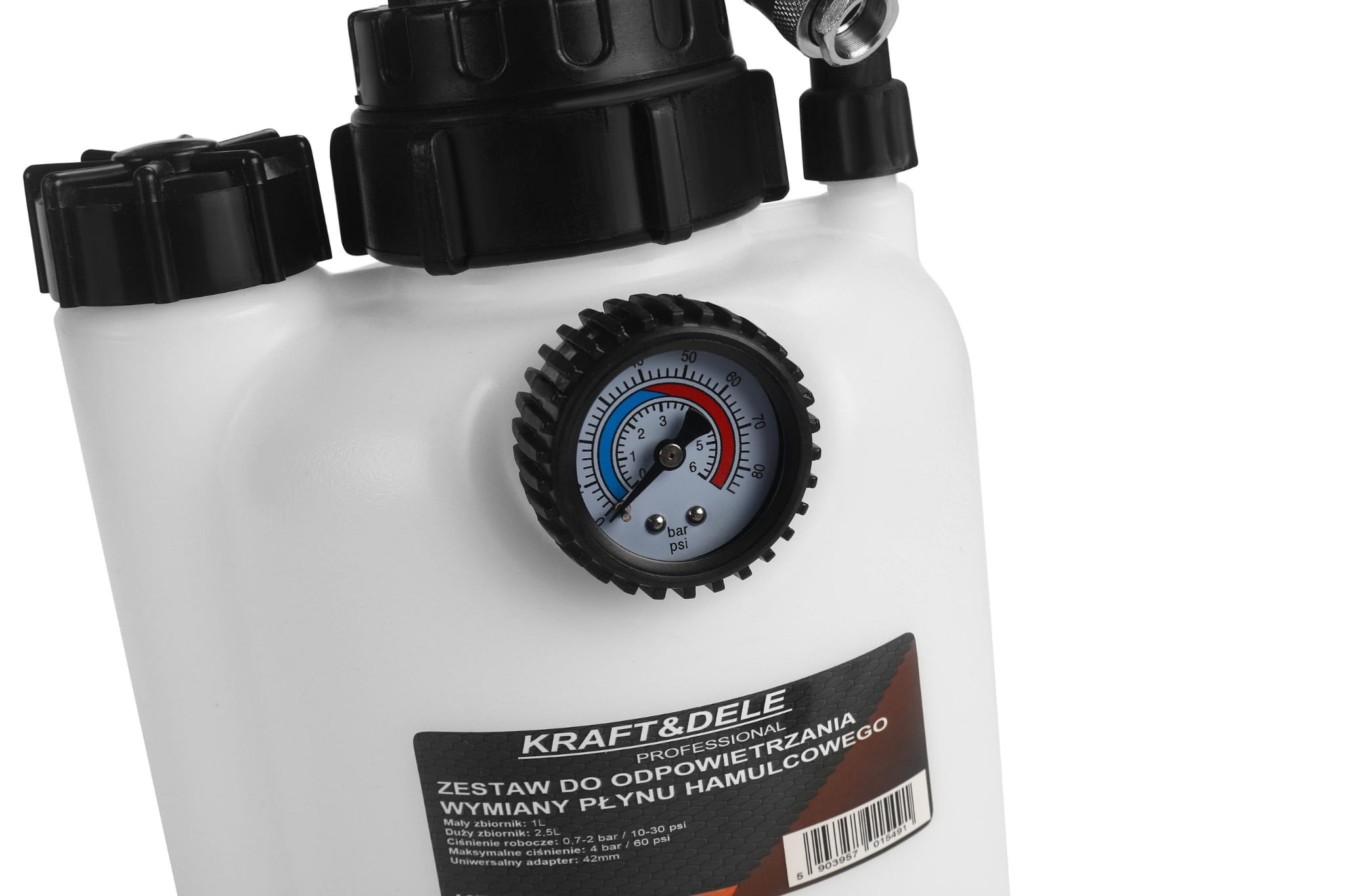 Dołączony pojemnik zbiera wypompowany płyn hamulcowy, zapobiegając jego rozlewaniu na karoserię lub podłogę warsztatu. Płyn hamulcowy jest agresywny dla lakierów i powierzchni betonowych, dlatego szczelny zbiornik ma istotne znaczenie praktyczne.