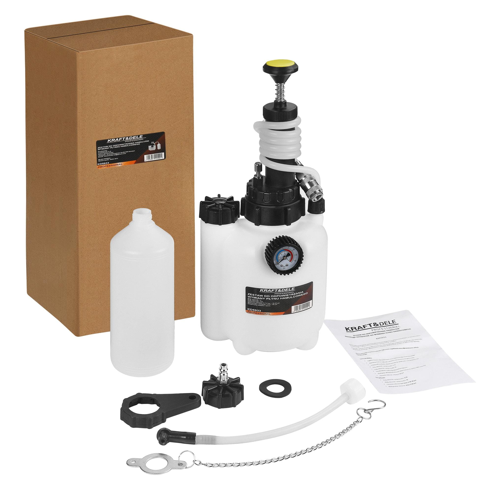 KD5933 to ręczny zestaw podciśnieniowy przeznaczony do odpowietrzania układów hamulcowych i sprzęgłowych oraz wymiany płynu hamulcowego w samochodach osobowych, dostawczych i motocyklach. Umożliwia przeprowadzenie całej procedury samodzielnie — bez udziału drugiej osoby obsługującej pedał hamulca.