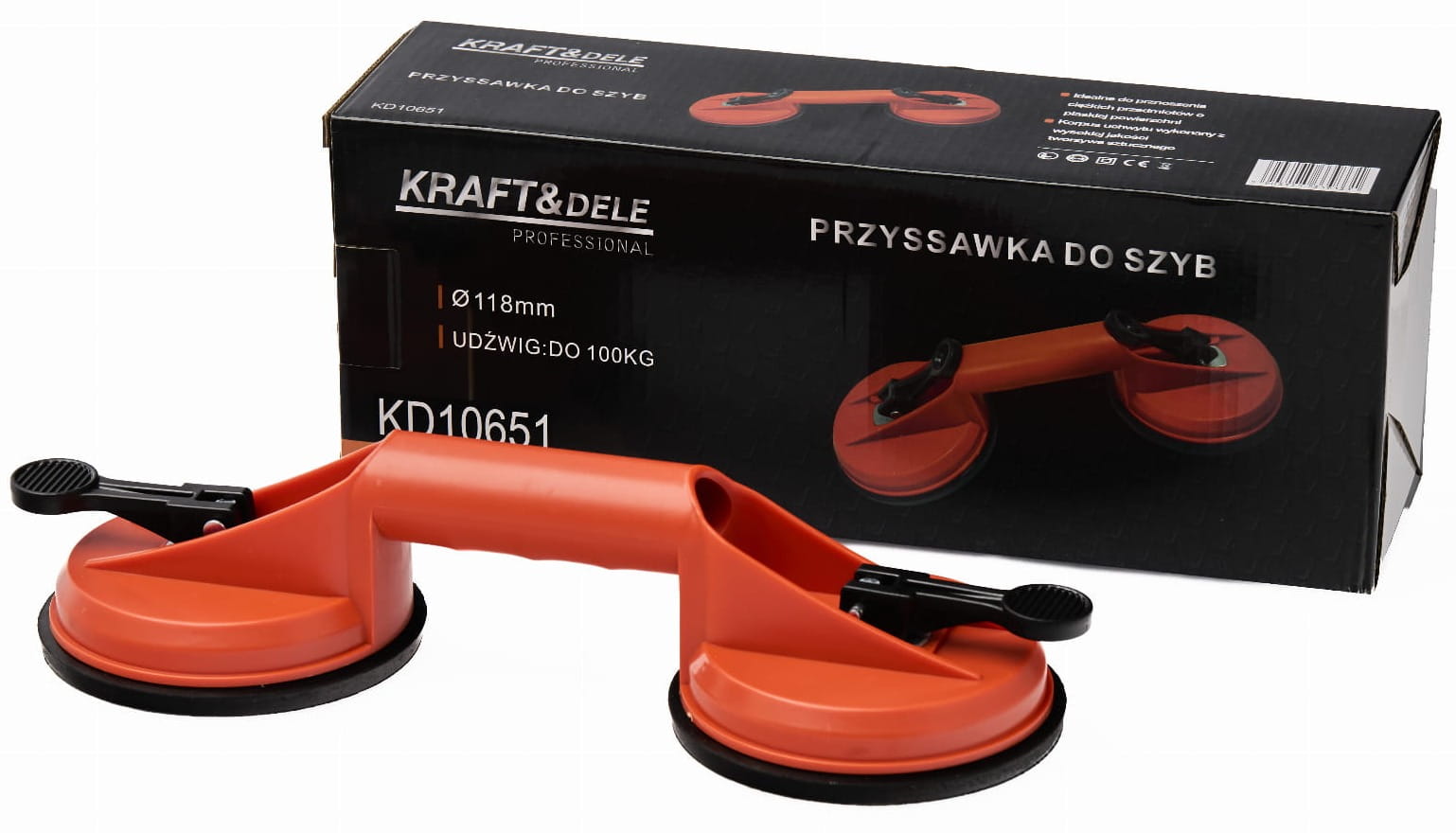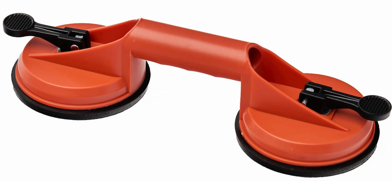 Uchwyt z podwójną przyssawką przeznaczony do ręcznego przenoszenia elementów o gładkich, nieprzepuszczalnych powierzchniach — szyb, blach, płyt laminowanych i podobnych materiałów. Zacisk mimośrodowy umożliwia szybkie mocowanie i zwalnianie uchwytu bez użycia narzędzi, przy maksymalnym udźwigu do 100 kg.