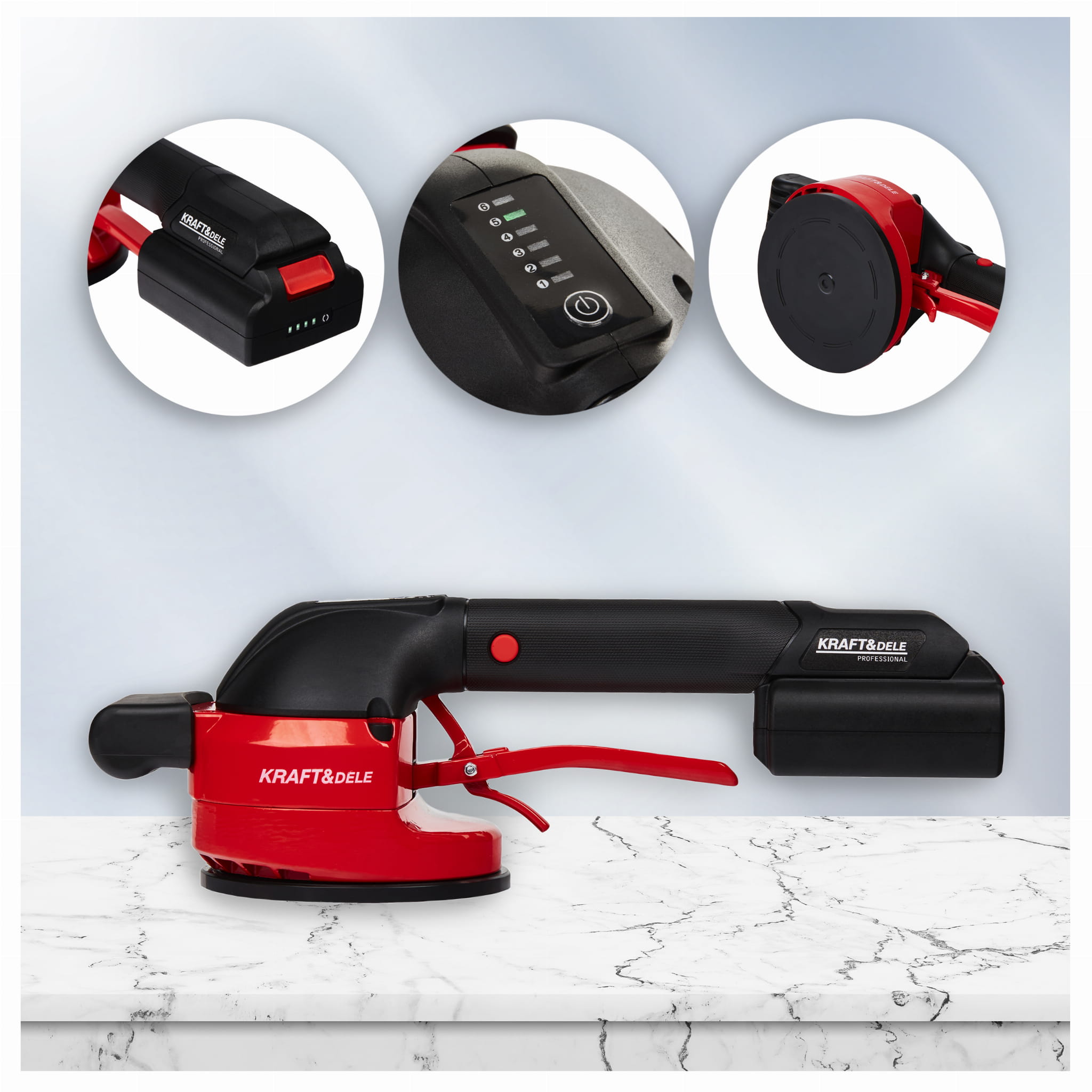 Bezprzewodowe narzędzie do precyzyjnego układania płytek ceramicznych i kamiennych, łączące funkcję przyssawki podnoszącej z mechanizmem wibracyjnym. Wibracje eliminują pęcherzyki powietrza uwięzione pod płytką, co bezpośrednio wpływa na trwałość połączenia z klejem i redukuje ryzyko późniejszych pęknięć lub odspojenia.