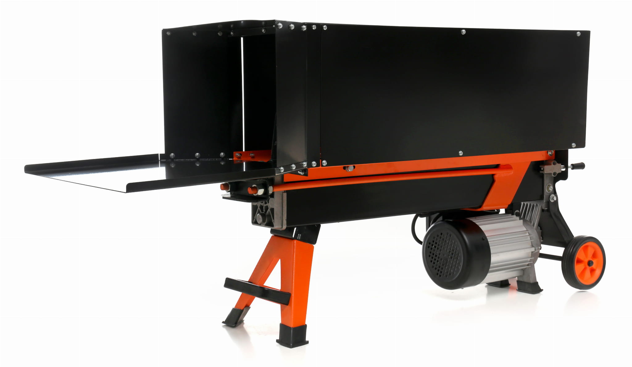 Poziome ustawienie cylindra hydraulicznego stabilizuje maszynę podczas pracy i eliminuje konieczność unoszenia kłód na dużą wysokość. Kółka transportowe umożliwiają przemieszczanie urządzenia o wadze 50 kg bez użycia dodatkowego sprzętu.