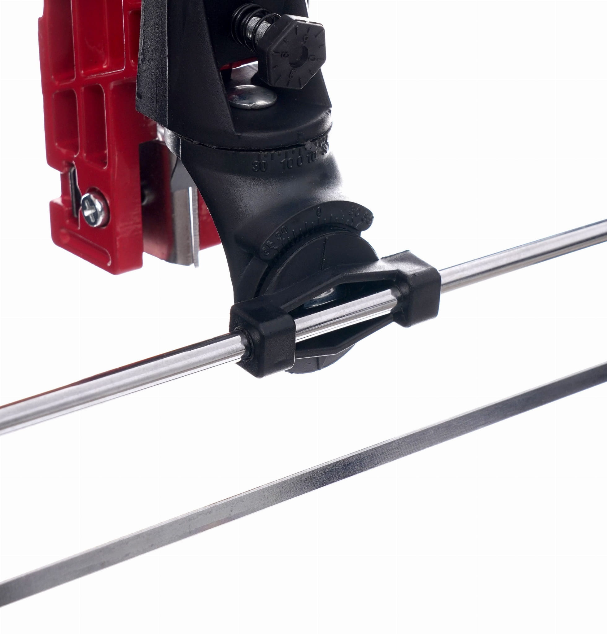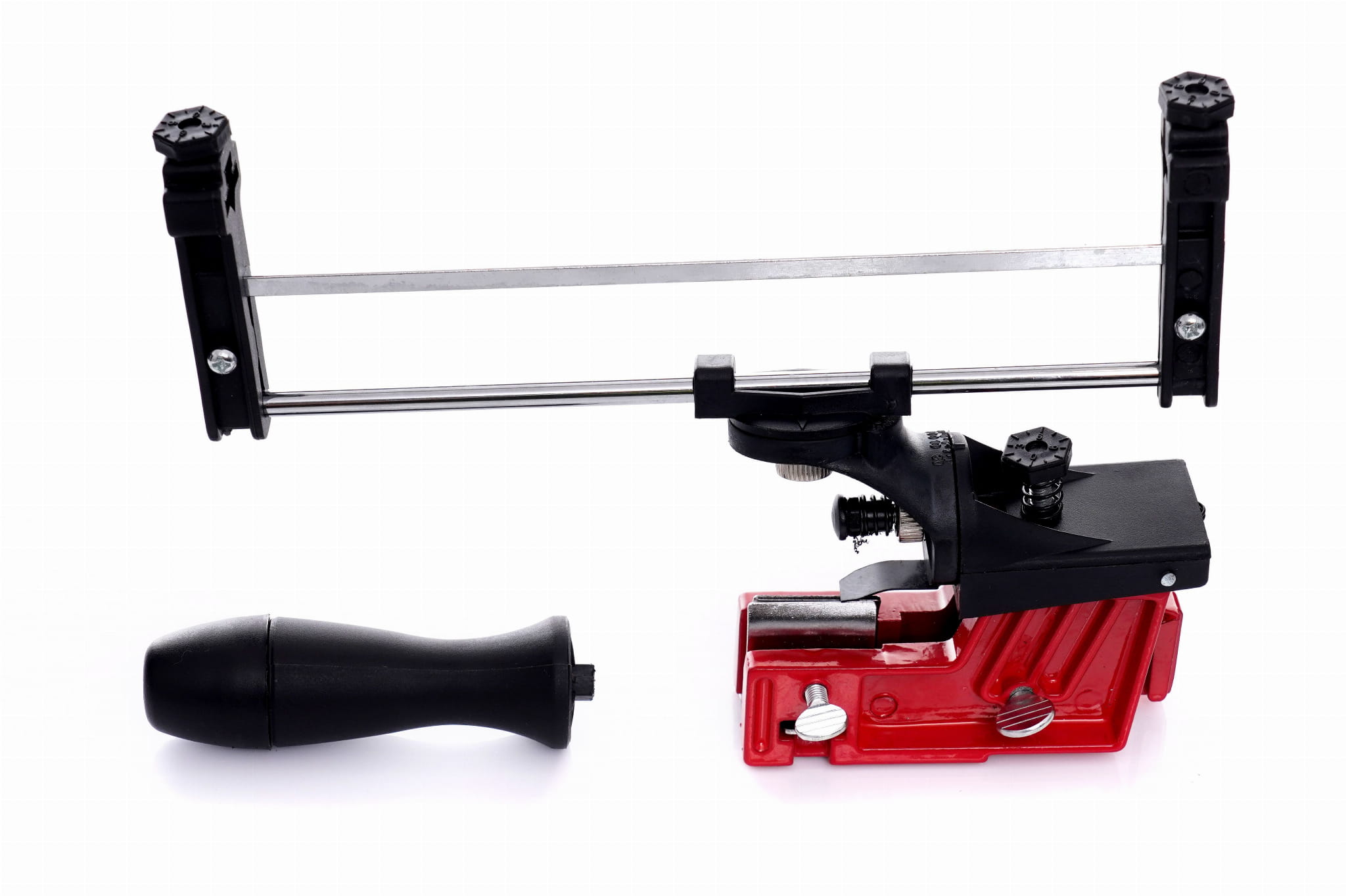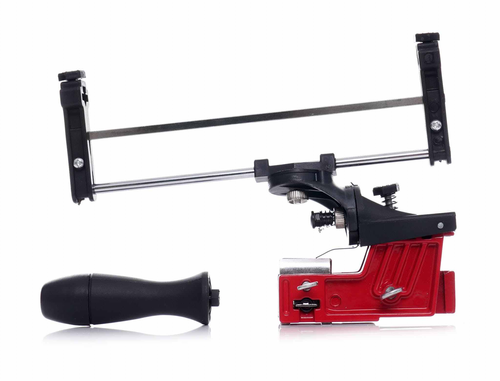Ostrzałka mocowana jest bezpośrednio na prowadnicy pilarki, co stabilizuje narzędzie względem łańcucha podczas ostrzenia. Eliminuje konieczność demontażu łańcucha i pracy na osobnym imadle.