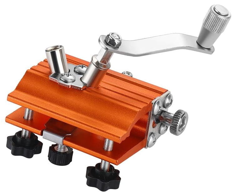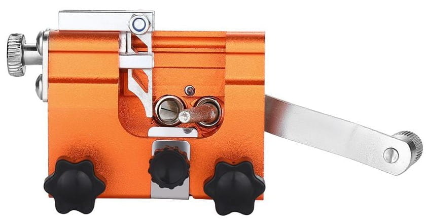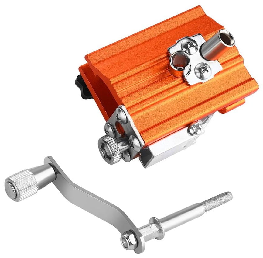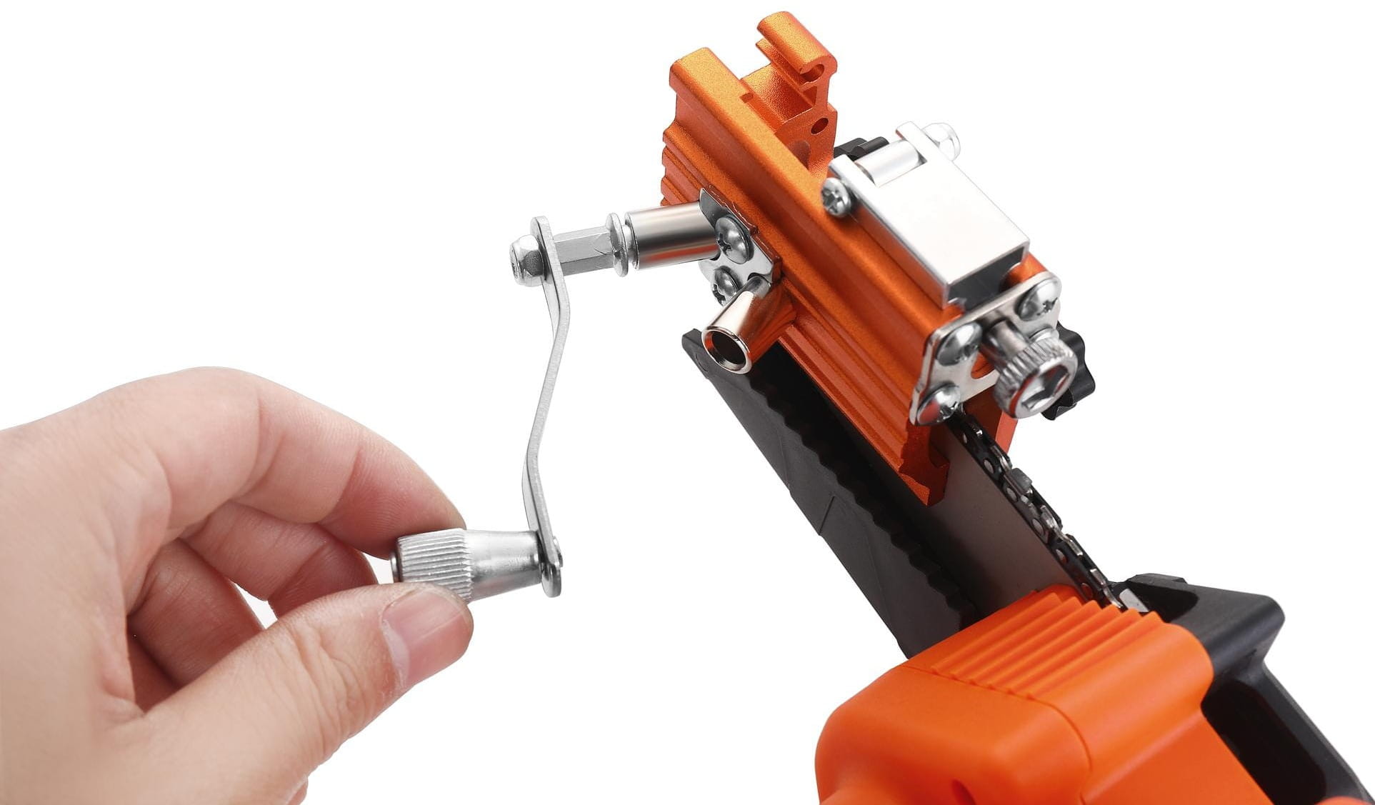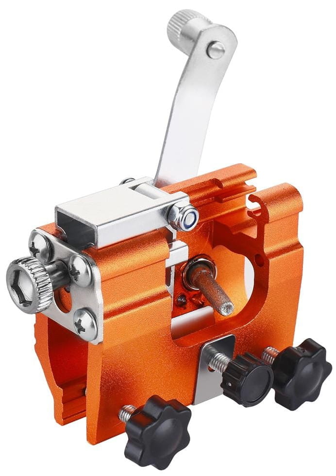Wbudowane śruby regulacyjne umożliwiają ustawienie ostrzałki pod właściwym kątem względem zębów łańcucha. Prawidłowy kąt ostrzenia ma bezpośredni wpływ na jakość cięcia i żywotność łańcucha.