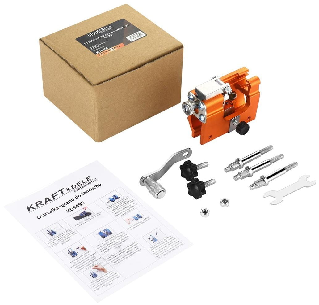 Ostrzałka KD5495 współpracuje z piłami łańcuchowymi wyposażonymi w prowadnicę o długości od 8 do 20 cali (ok. 20–51 cm). Długość prowadnicy jest zazwyczaj podana na naklejce umieszczonej na prowadnicy lub w instrukcji obsługi piły. Dobór odpowiedniej osełki z zestawu zależy od podziałki łańcucha — najczęściej stosowane wartości to 3/8" i 0,325", a ich oznaczenie znajduje się na opakowaniu łańcucha lub w dokumentacji piły.