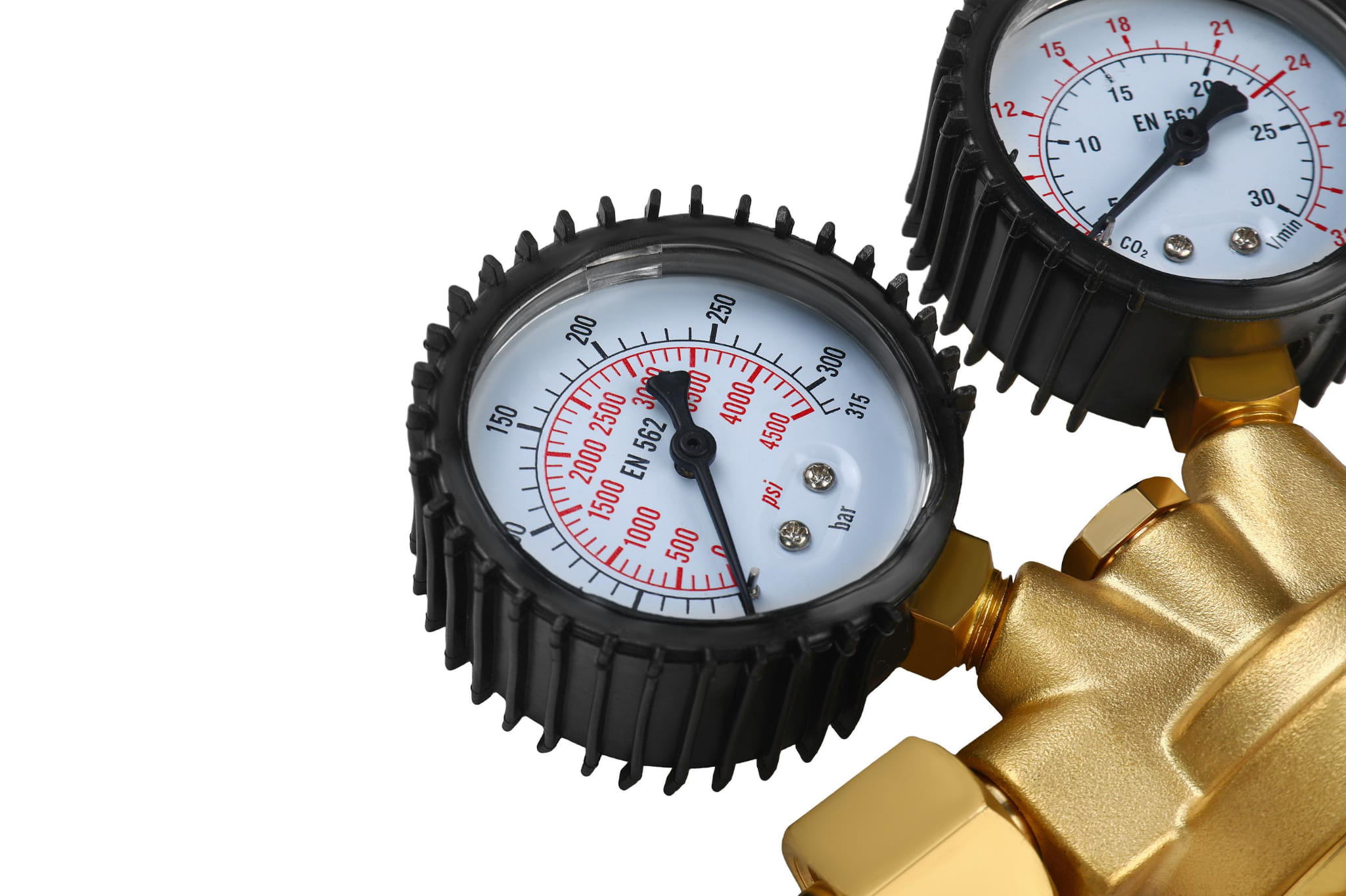 Maksymalne ciśnienie wejściowe 315 bar odpowiada ciśnieniu pełnej butli z argonem lub CO2. Reduktor pracuje bezpiecznie przez cały cykl eksploatacji butli — od pełnej do niemal pustej — bez konieczności korygowania nastawy ciśnienia roboczego.
