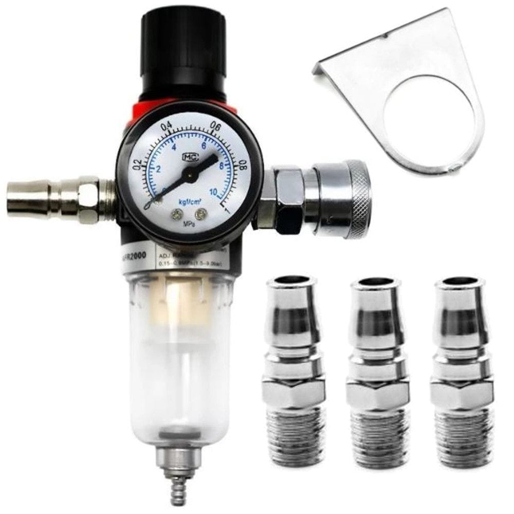 Reduktor montuje się na gwincie 1/4" BSP w pozycji pionowej lub poziomej, zgodnie z oznaczeniem kierunku przepływu na korpusie. Przed pierwszym uruchomieniem należy sprawdzić szczelność połączeń przy niskim ciśnieniu. Ustawienie ciśnienia roboczego odbywa się przez obrót pokrętła regulacyjnego przy otwartym przepływie powietrza — odczyt na manometrze odpowiada ciśnieniu za reduktorem.