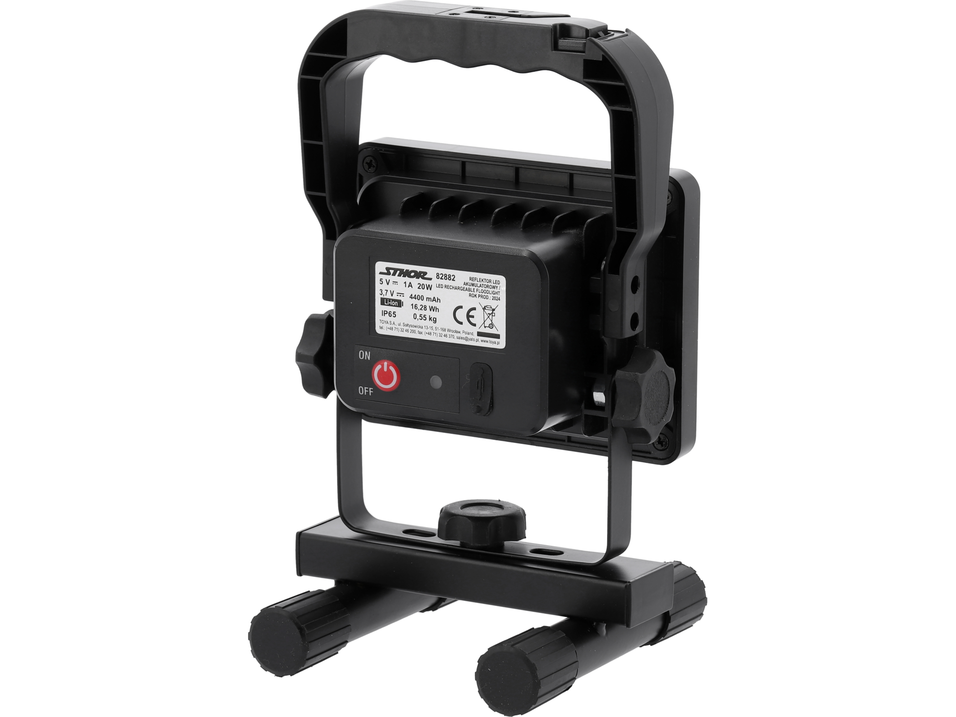 Reflektor Sthor 82882 wyposażony jest w 40 diod SMD LED, które zapewniają mocne i jasne światło o strumieniu świetlnym 2000 lm. Urządzenie oferuje dwa tryby świecenia (100% i 50%), co pozwala dostosować intensywność światła do potrzeb użytkownika oraz przedłużyć czas pracy na jednym naładowaniu. Kąt pracy wynoszący 110˚ umożliwia szerokie rozproszenie światła, a temperatura barwowa 6500 K zapewnia światło zbliżone do dziennego.