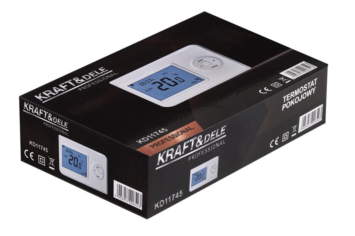 KD11745 to natynkowy termostat radiowy marki Kraft&Dele przeznaczony do bezprzewodowego sterowania elektrycznymi i konwencjonalnymi systemami grzewczymi. Urządzenie pracuje na zasilaniu bateryjnym i komunikuje się z kompaktowym odbiornikiem montowanym przy źródle ciepła, co eliminuje konieczność prowadzenia dodatkowego okablowania.