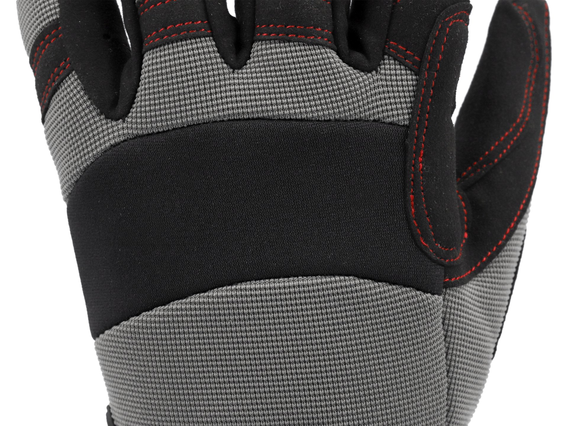 Materiał syntetyczny w dłoni i palcach charakteryzuje się odpornością na ścieranie wyższą niż standardowe tkaniny robocze. Struktura powierzchni zapewnia pewny chwyt przedmiotów, również w obecności kurzu czy lekkiego zabrudzenia.