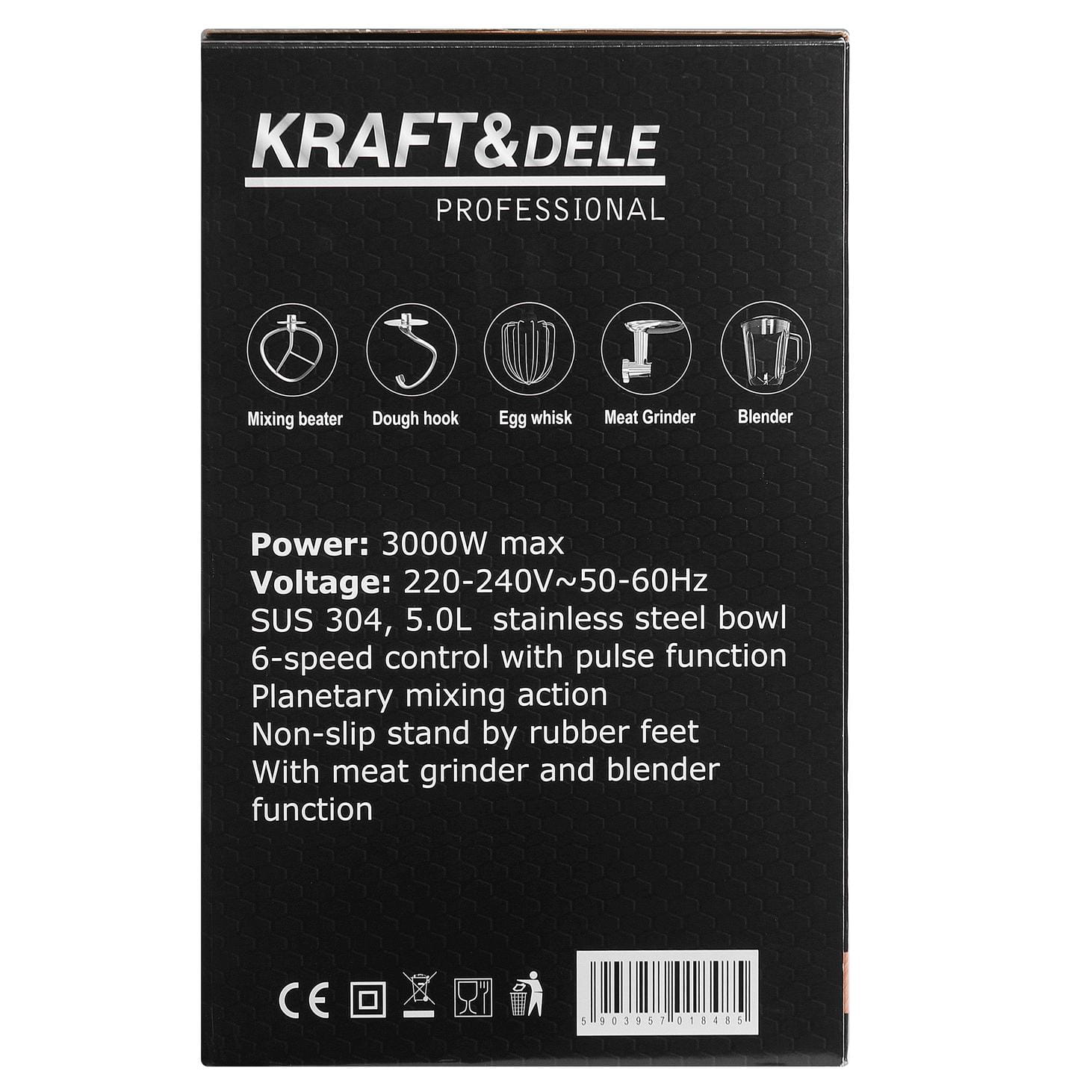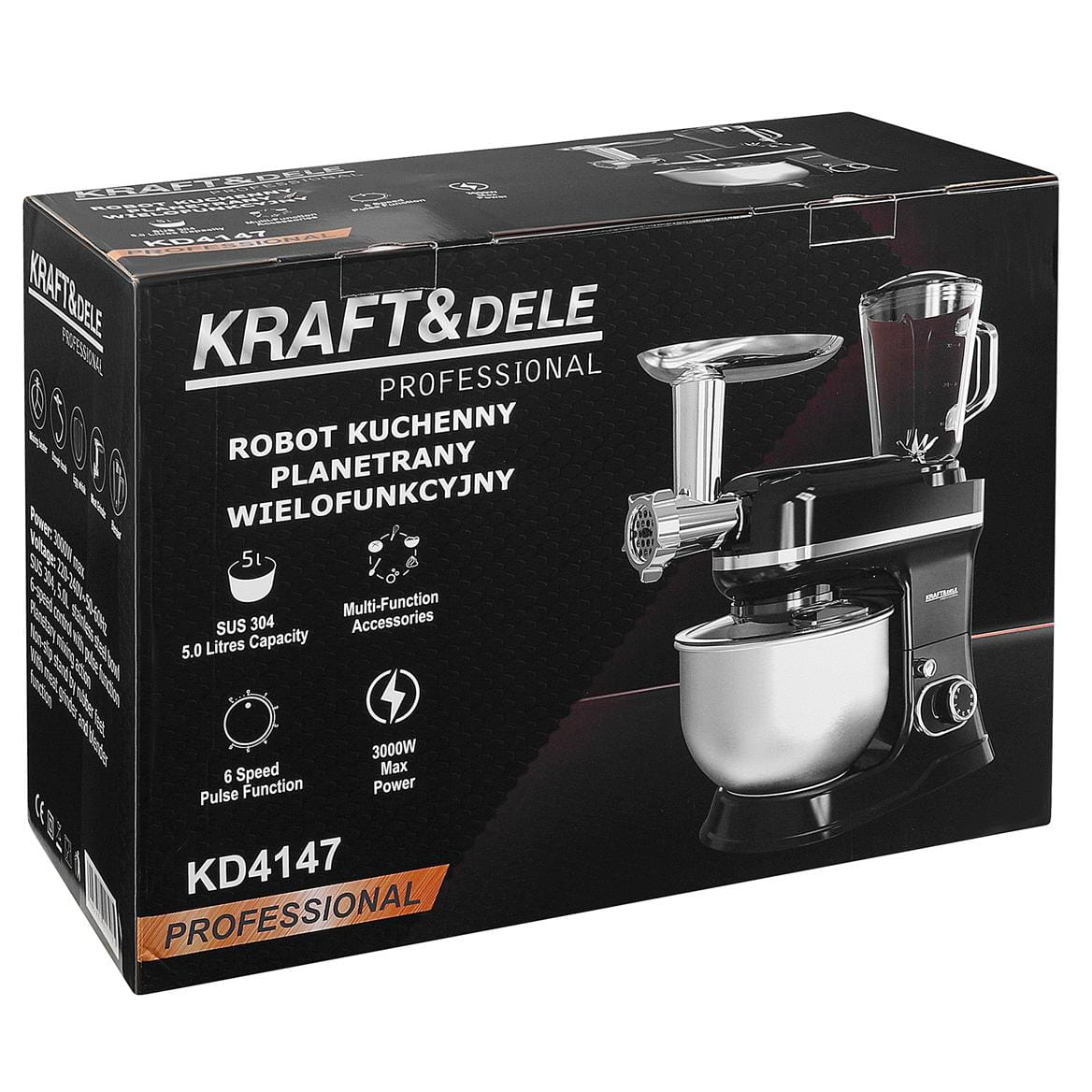 KD4147 to wielofunkcyjny robot kuchenny z mechanizmem ruchu planetarnego, łączący w jednym urządzeniu funkcje miksera planetarnego, maszynki do mielenia mięsa oraz blendera kielichowego. Misa ze stali nierdzewnej o pojemności 5 litrów i moc maksymalna 3000W pozwalają na przetwarzanie zarówno lekkich mas, jak i gęstych ciast czy mięsa.