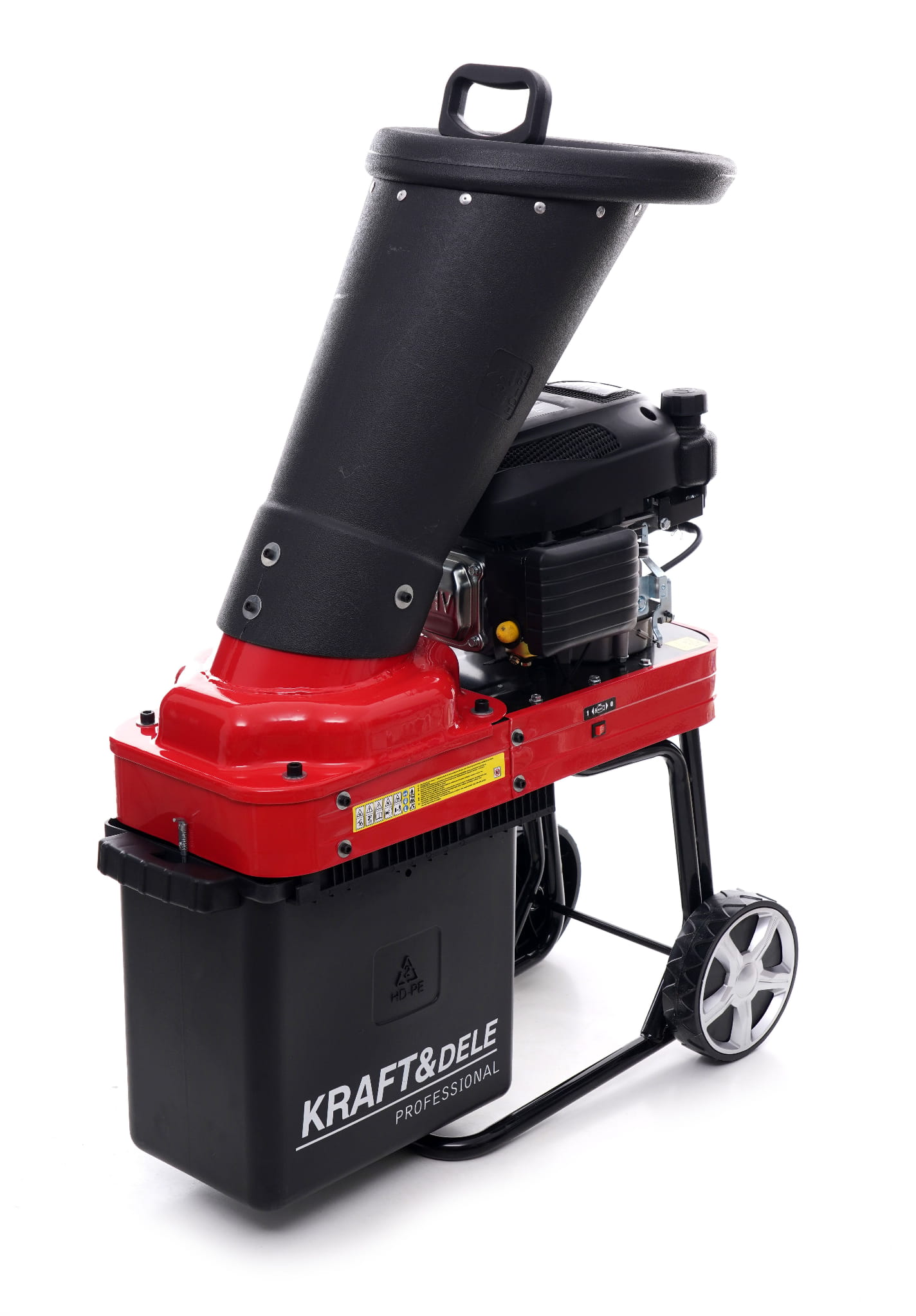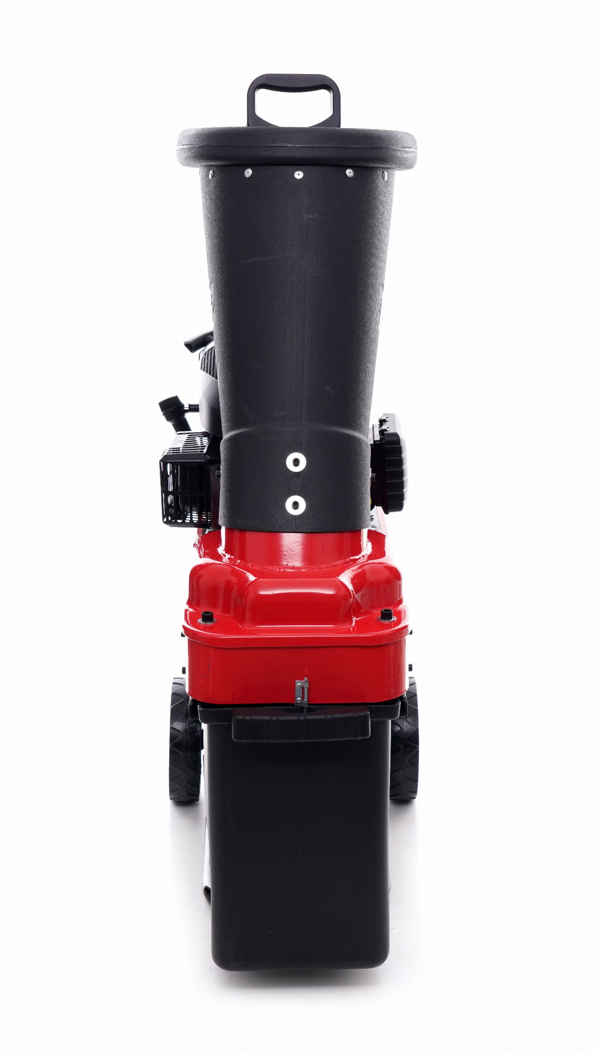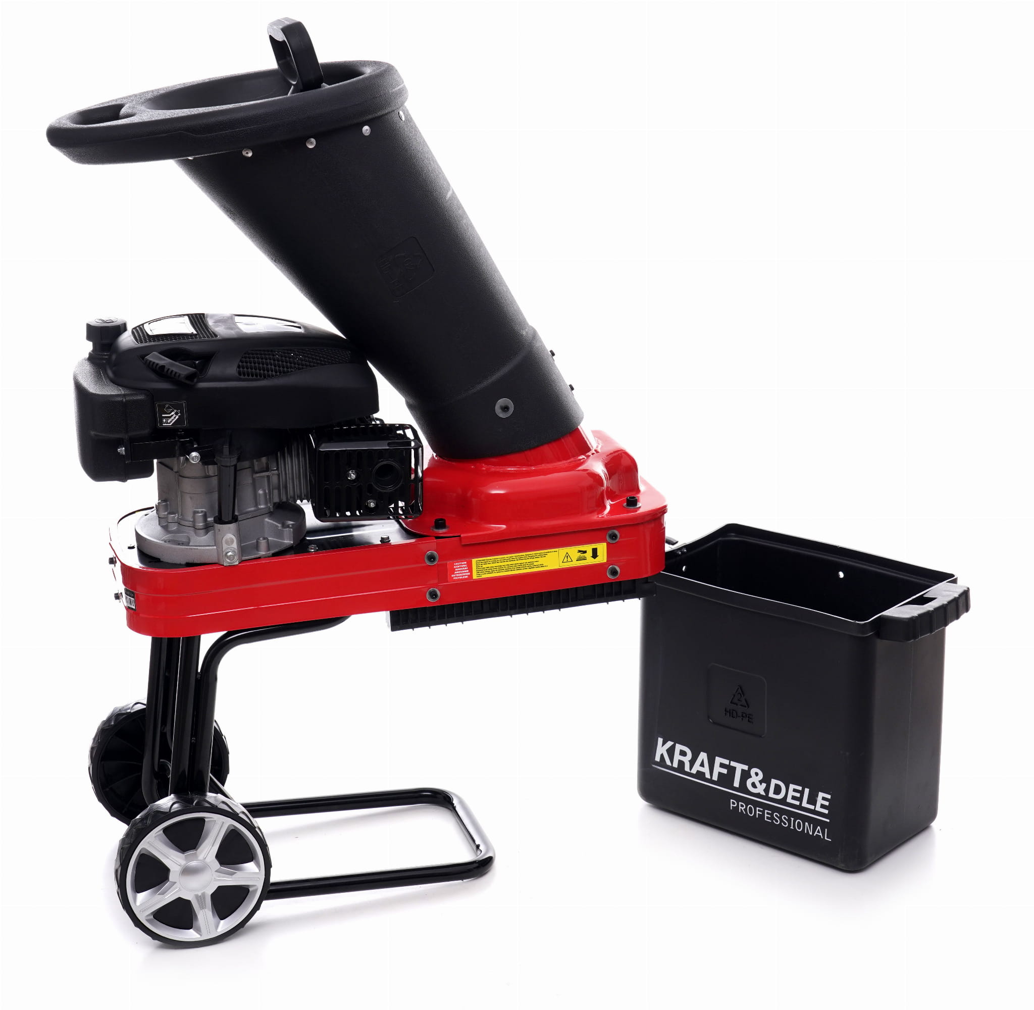 Kosz wykonany z tworzywa odpornego na odkształcenia zbiera rozdrobniony materiał bezpośrednio przy maszynie. Ogranicza rozrzut zrębków i ułatwia ich transport do kompostownika lub miejsca składowania.