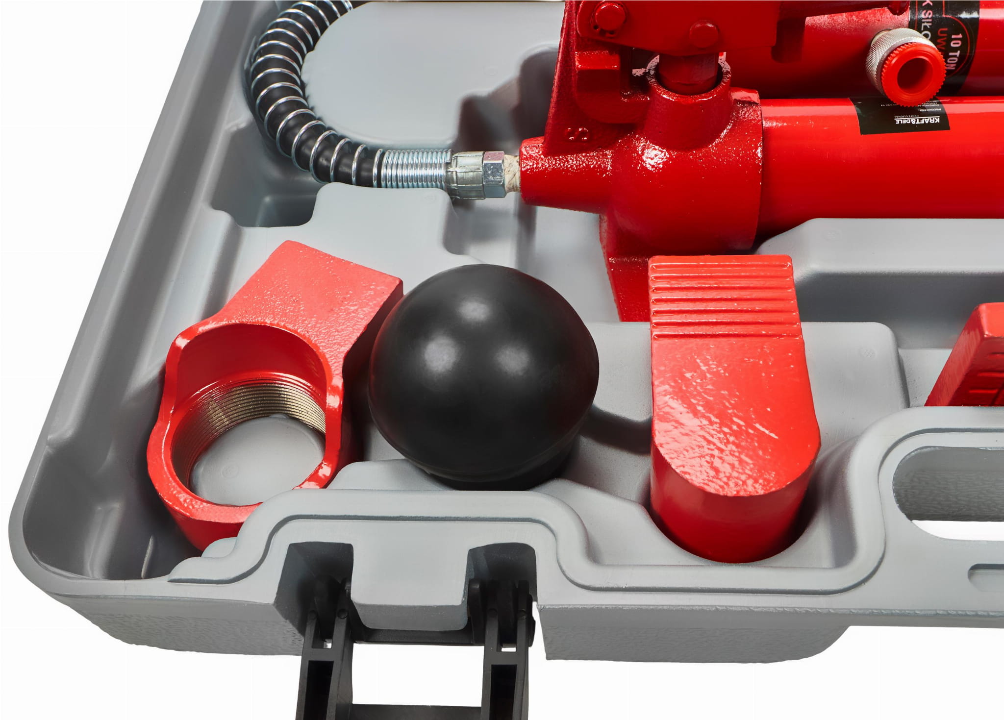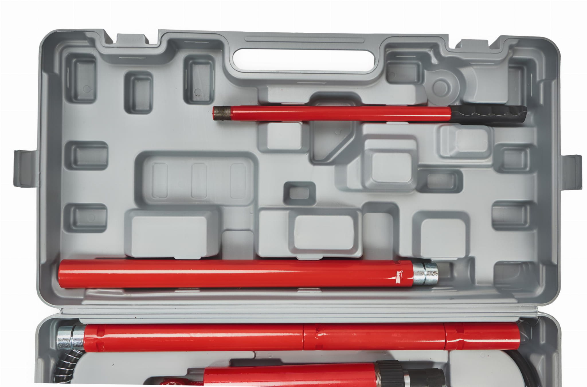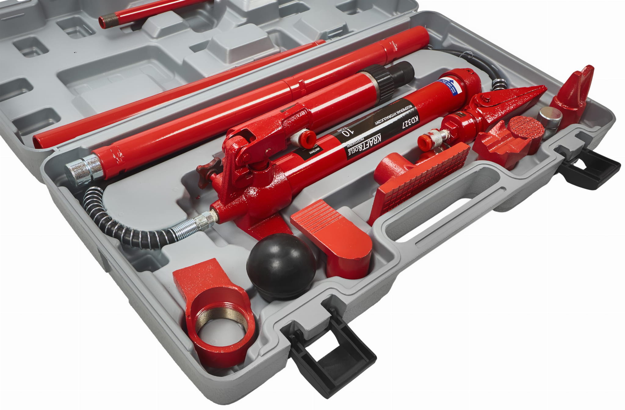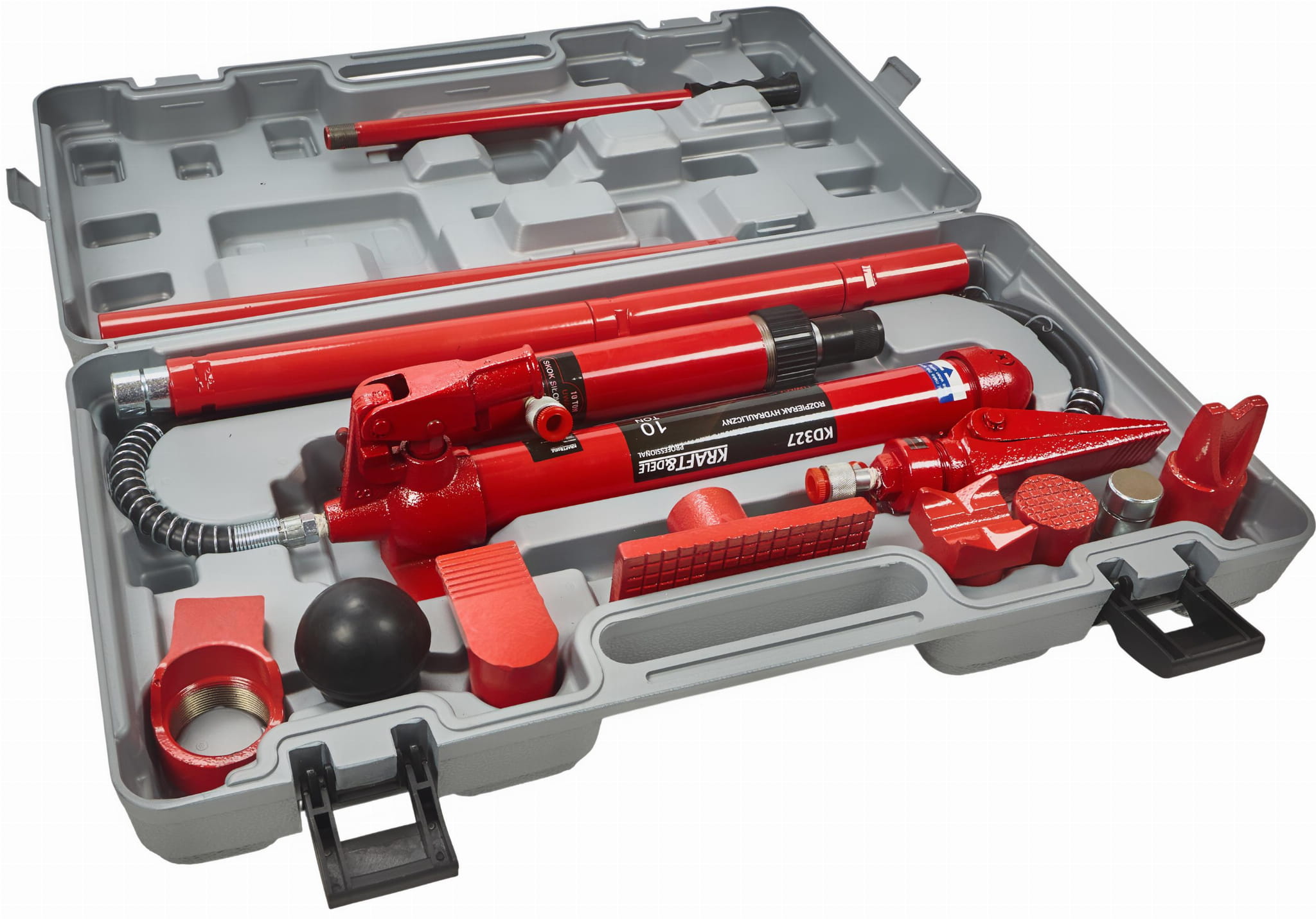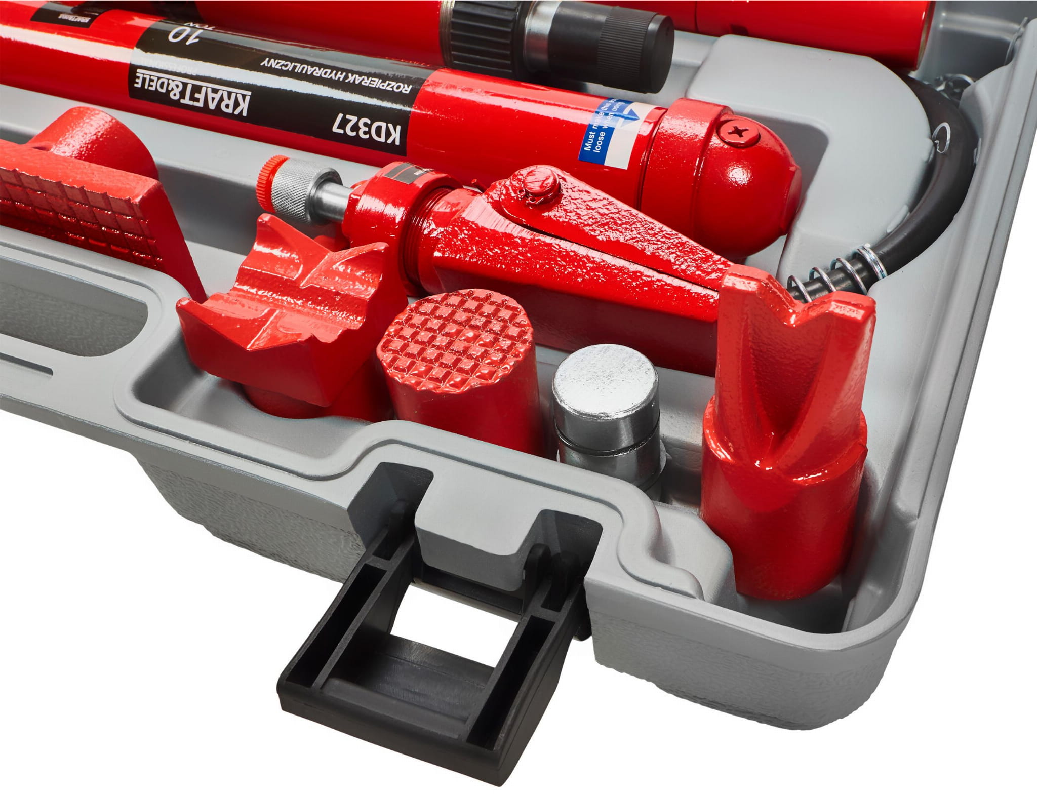 Rozpierak hydrauliczny KD327 to narzędzie warsztatowe przeznaczone do prostowania, rozpierania i dociskania elementów metalowych z siłą do 10 ton. Zestaw zawiera oddzieloną pompę hydrauliczną, cztery grubościenne przedłużki oraz pięć nasadek — całość przechowywana i transportowana w sztywnej walizce.