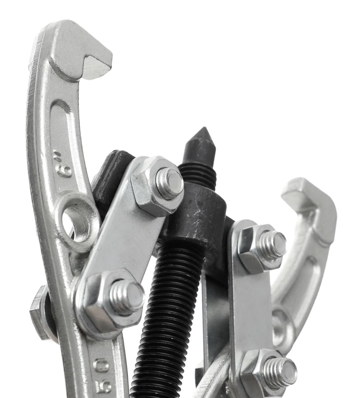 Ściągacz dwuramienny przeznaczony do mechanicznego demontażu elementów osadzonych na wałach — łożysk, kół pasowych, tarcz i tulei. Zasięg ramion do 150 mm (6") pozwala na pracę z elementami o średnich gabarytach, typowymi w naprawach silników, przekładni i układów napędowych.