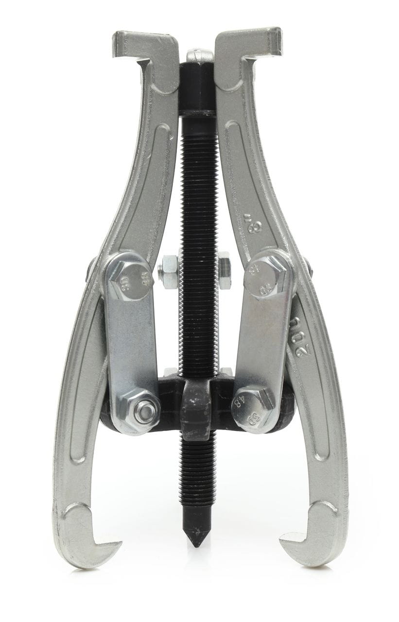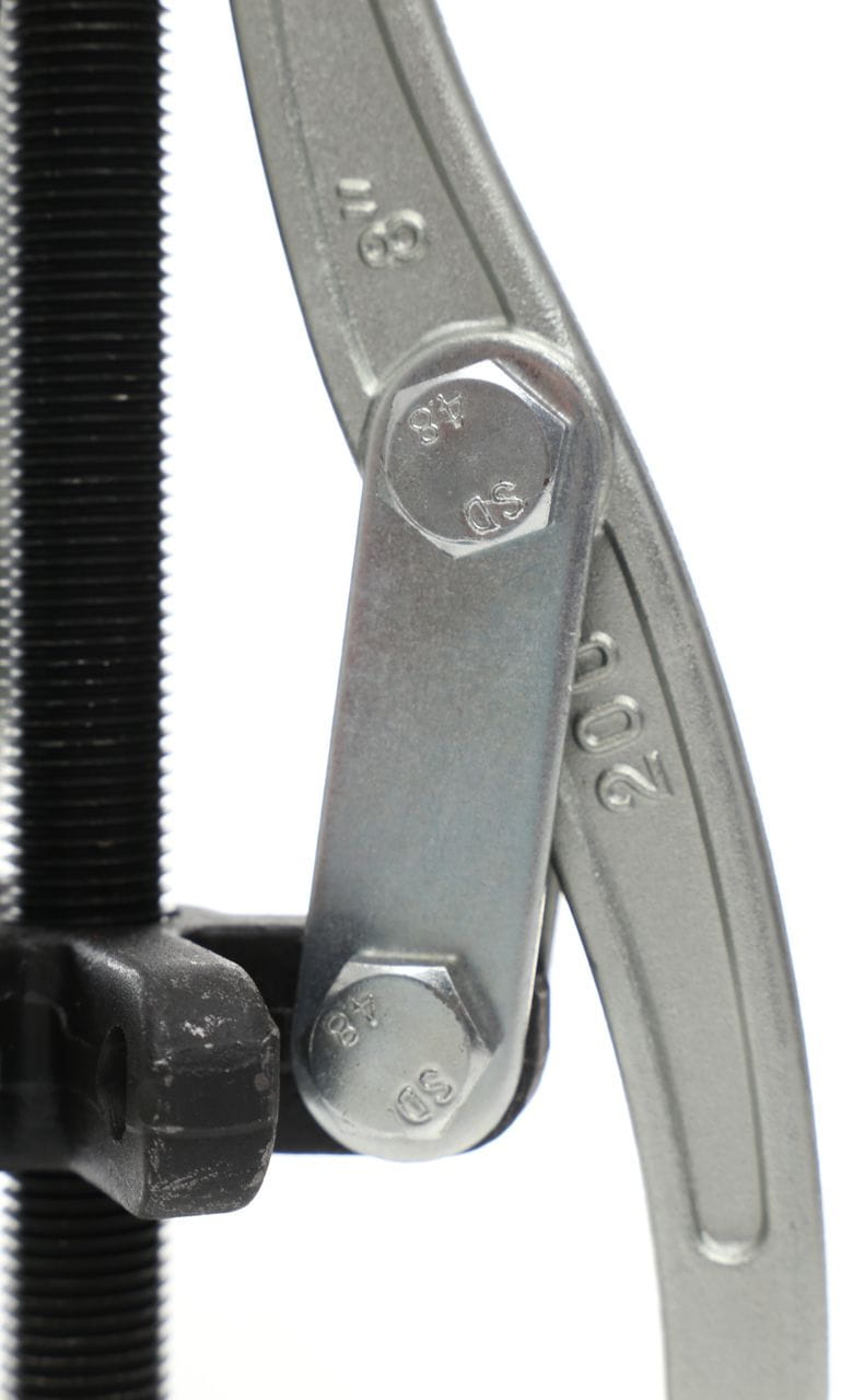 Układ trzech ramion rozkłada siłę ściągania równomiernie na obwodzie demontowanego elementu. Zmniejsza to ryzyko jego uszkodzenia lub ześlizgnięcia się narzędzia podczas pracy pod obciążeniem — istotne przy demontażu elementów zapieczonych lub osadzonych na wcisk.