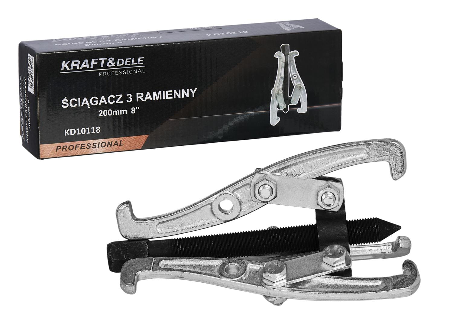 Ściągacz trójramienny KD10118 to narzędzie warsztatowe przeznaczone do demontażu elementów osadzonych na wałach — łożysk, kół pasowych, piast i sprzęgieł. Trzy ramiona rozmieszczone symetrycznie zapewniają równomierne rozłożenie siły ściągającej, co minimalizuje ryzyko uszkodzenia demontowanego elementu oraz wału.