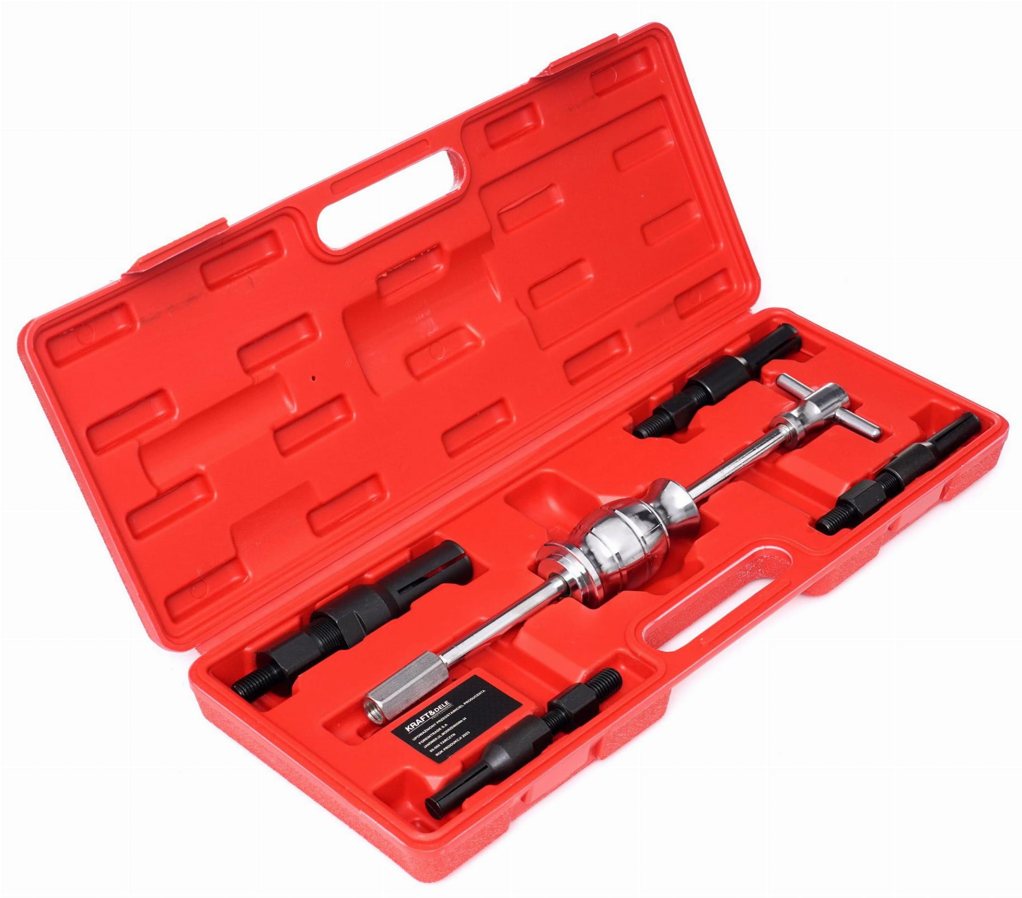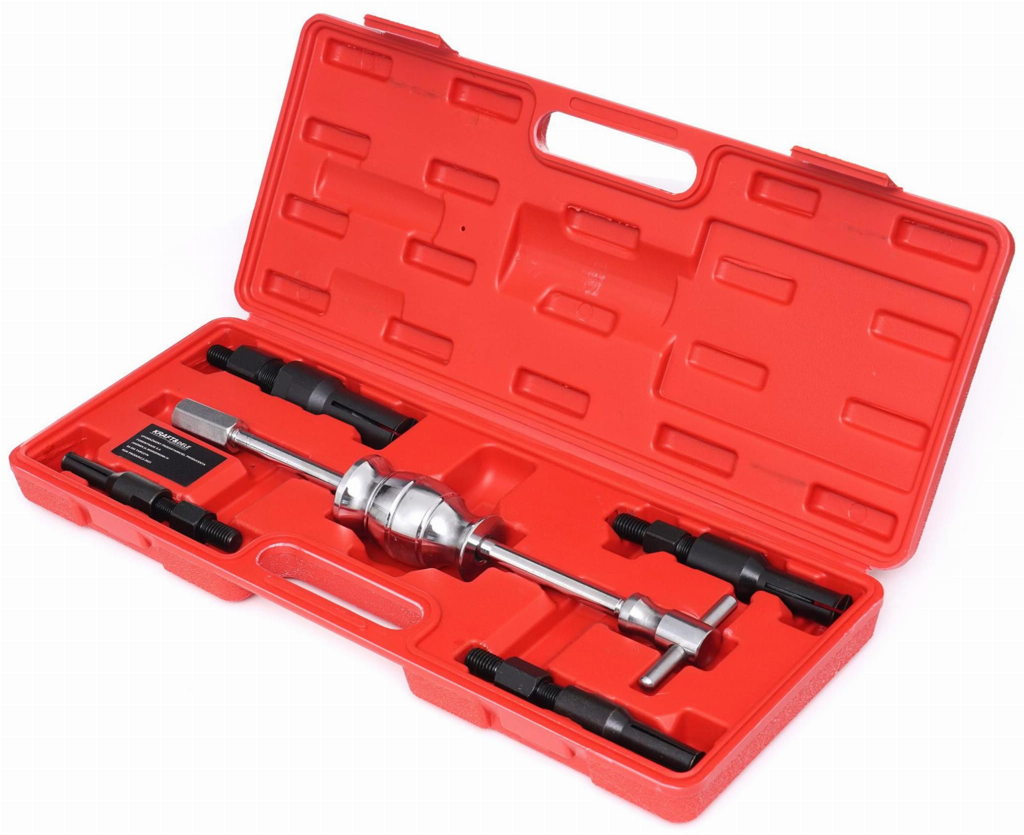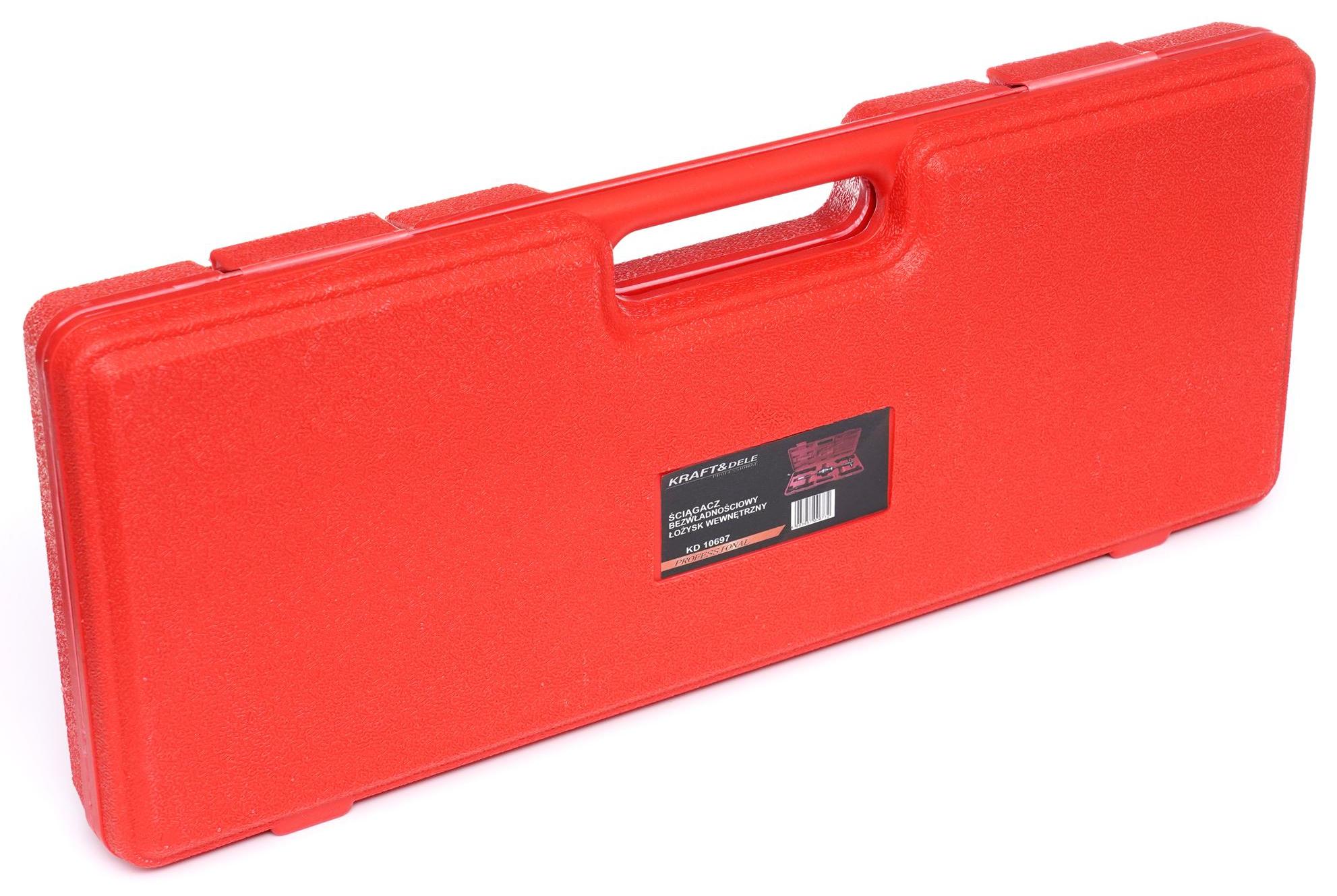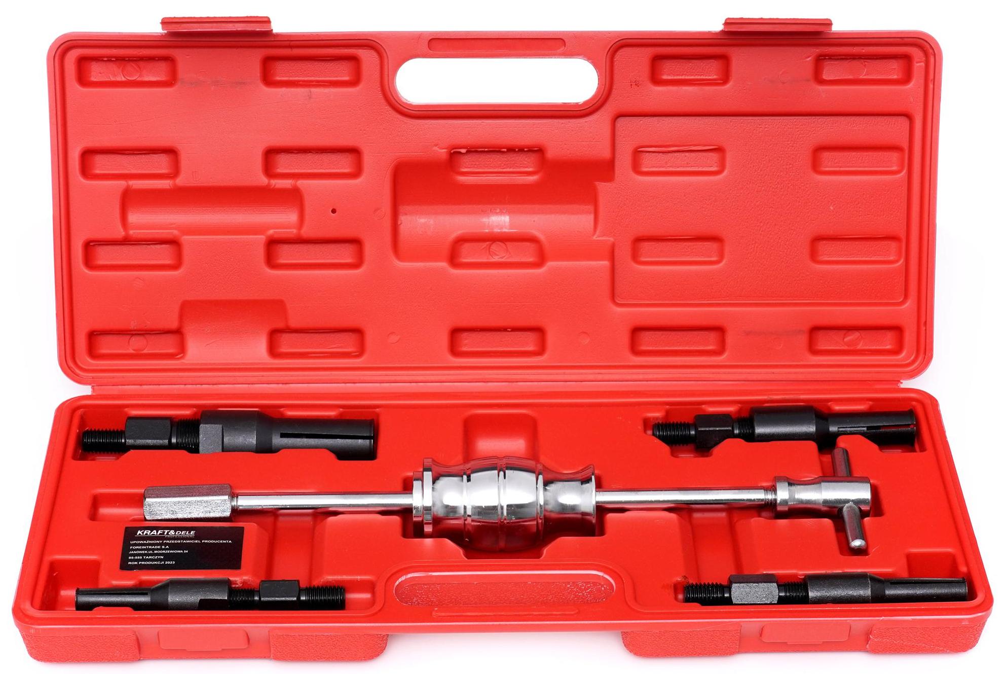 KD10697 to zestaw narzędzi do demontażu łożysk wewnętrznych metodą bezwładnościową — bez konieczności stosowania prasy czy zewnętrznych urządzeń hydraulicznych. Zestaw obejmuje młotek bezwładnościowy o długości 375 mm oraz 4 wymienne ściągacze, pokrywające zakres średnic od 10 do 32 cm. Narzędzia wykonano ze stali, a całość przechowywana jest w dedykowanej walizce.