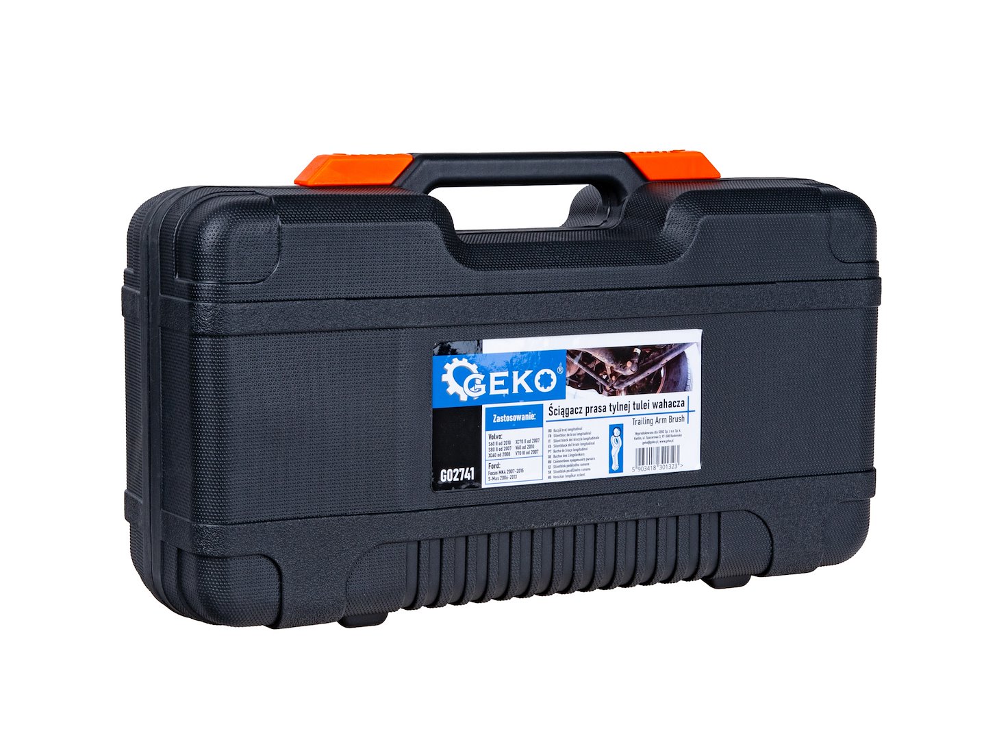 G02741 to specjalistyczne narzędzie warsztatowe do wciskania i wyciskania tulei metalowo-gumowych w tylnym wahaczu wybranych modeli Ford i Volvo. Narzędzie umożliwia wymianę tulei bez konieczności demontażu całego wahacza z pojazdu, co skraca czas naprawy i ogranicza ryzyko uszkodzenia sąsiednich elementów zawieszenia.