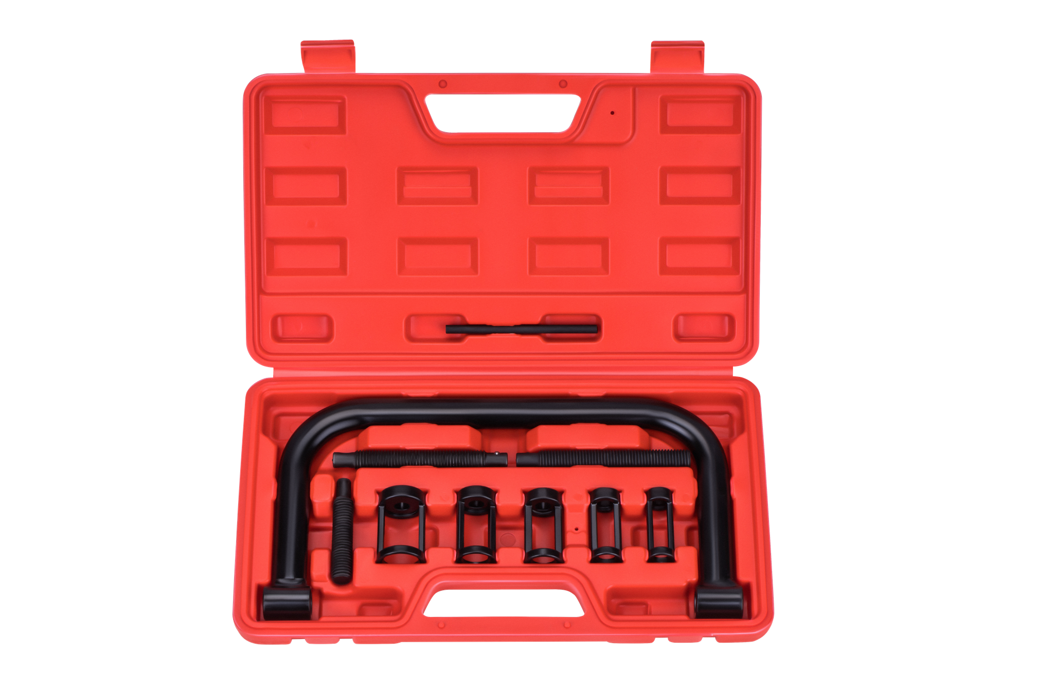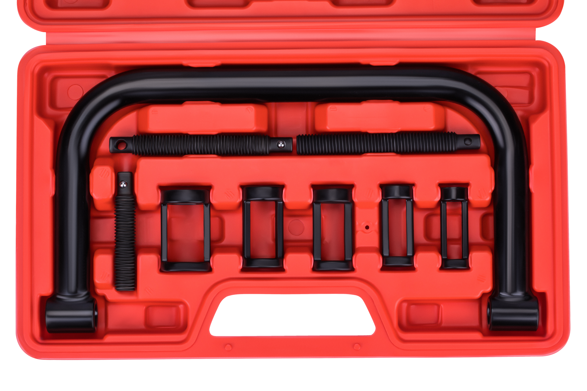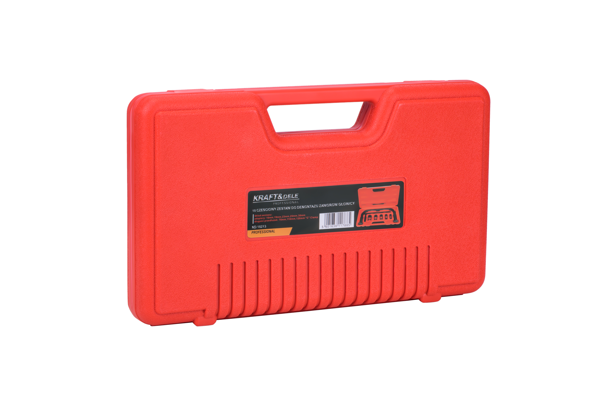 Zestaw przeznaczony do montażu i demontażu zaworów w głowicach silników spalinowych. Obejmuje walce w pięciu średnicach oraz nagwintowane przedłużki, umożliwiając pracę przy różnych konfiguracjach głowic spotykanych w samochodach osobowych, dostawczych i motocyklach. Komplet dostarczany jest w walizce transportowej.