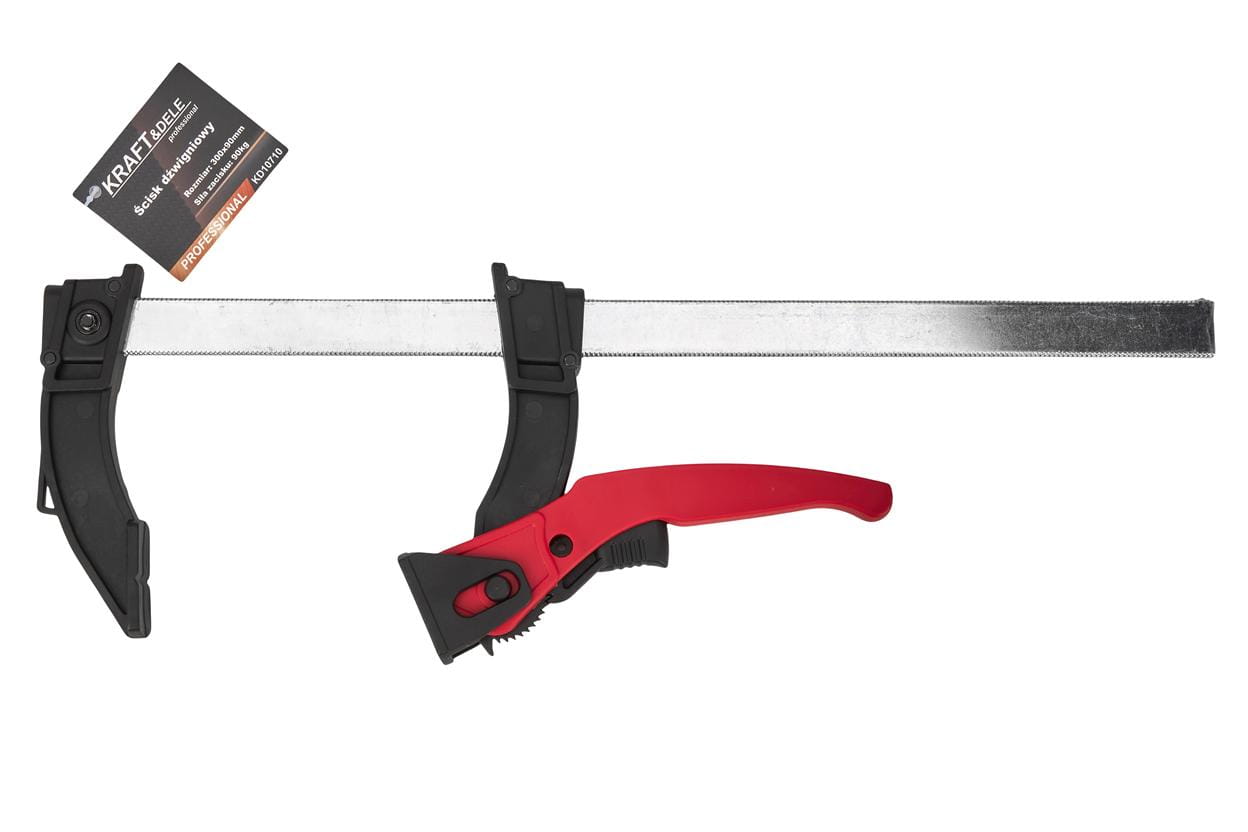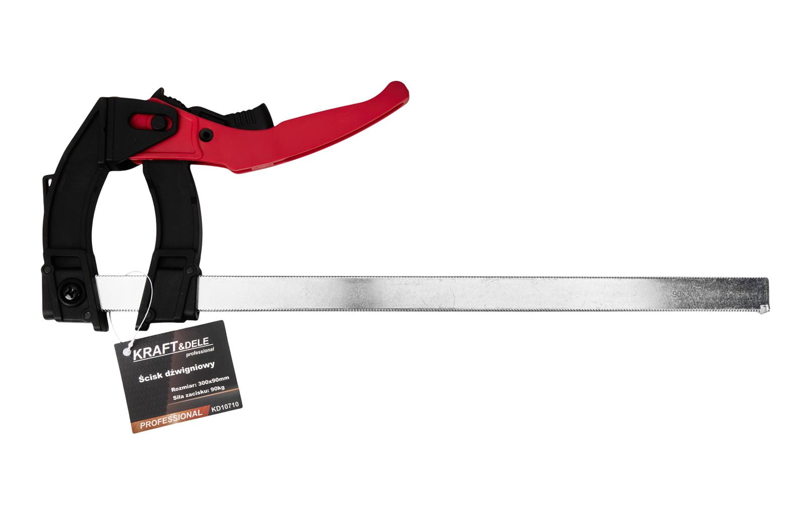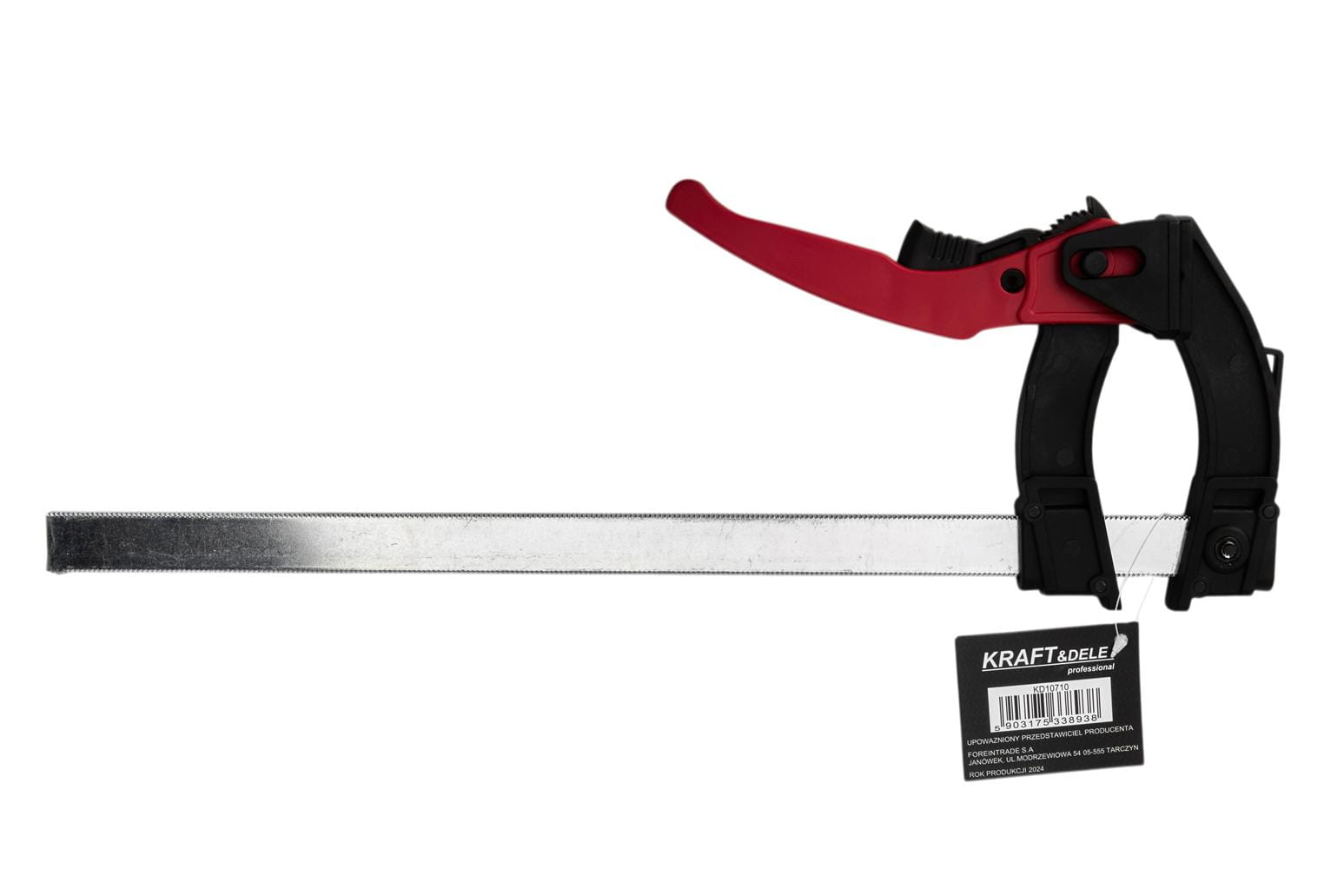 Ścisk dźwigniowy KD10710 to narzędzie stolarskie przeznaczone do dociskania i łączenia elementów drewnianych podczas klejenia, montażu oraz obróbki. Wyposażony w mechanizm szybkiego przesuwu szczęki, umożliwia sprawną regulację zakresu roboczego bez konieczności użycia obu rąk.