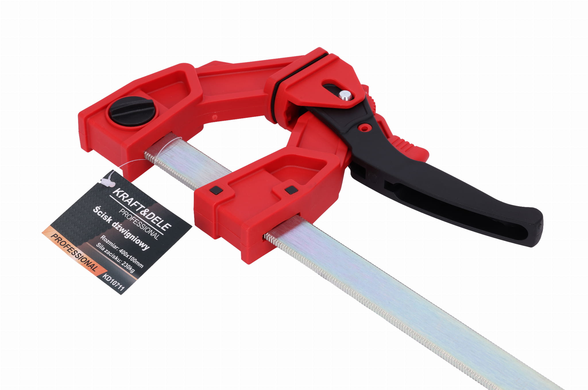 Ścisk stolarski z serii Kraft&Dele przeznaczony do dociskania i łączenia elementów drewnianych podczas klejenia, montażu oraz obróbki stolarskiej. Narzędzie wyposażone w system szybkiego przesuwu szczęki oraz ochronne nakładki, które zapobiegają uszkodzeniu powierzchni materiału. Po odwróceniu szczęk może pełnić funkcję rozpieracza.