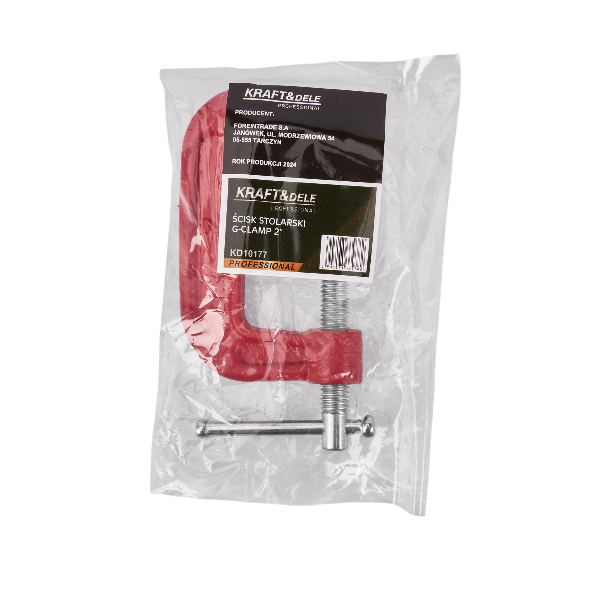 Ścisk typu G marki Kraft&Dele o rozwarciu 2 cali (ok. 50 mm), wykonany z odlewu żeliwnego. Narzędzie przeznaczone do warsztatowych prac stolarskich i ślusarskich, gdzie wymagane jest pewne, stabilne unieruchomienie elementów podczas obróbki, klejenia lub spawania.