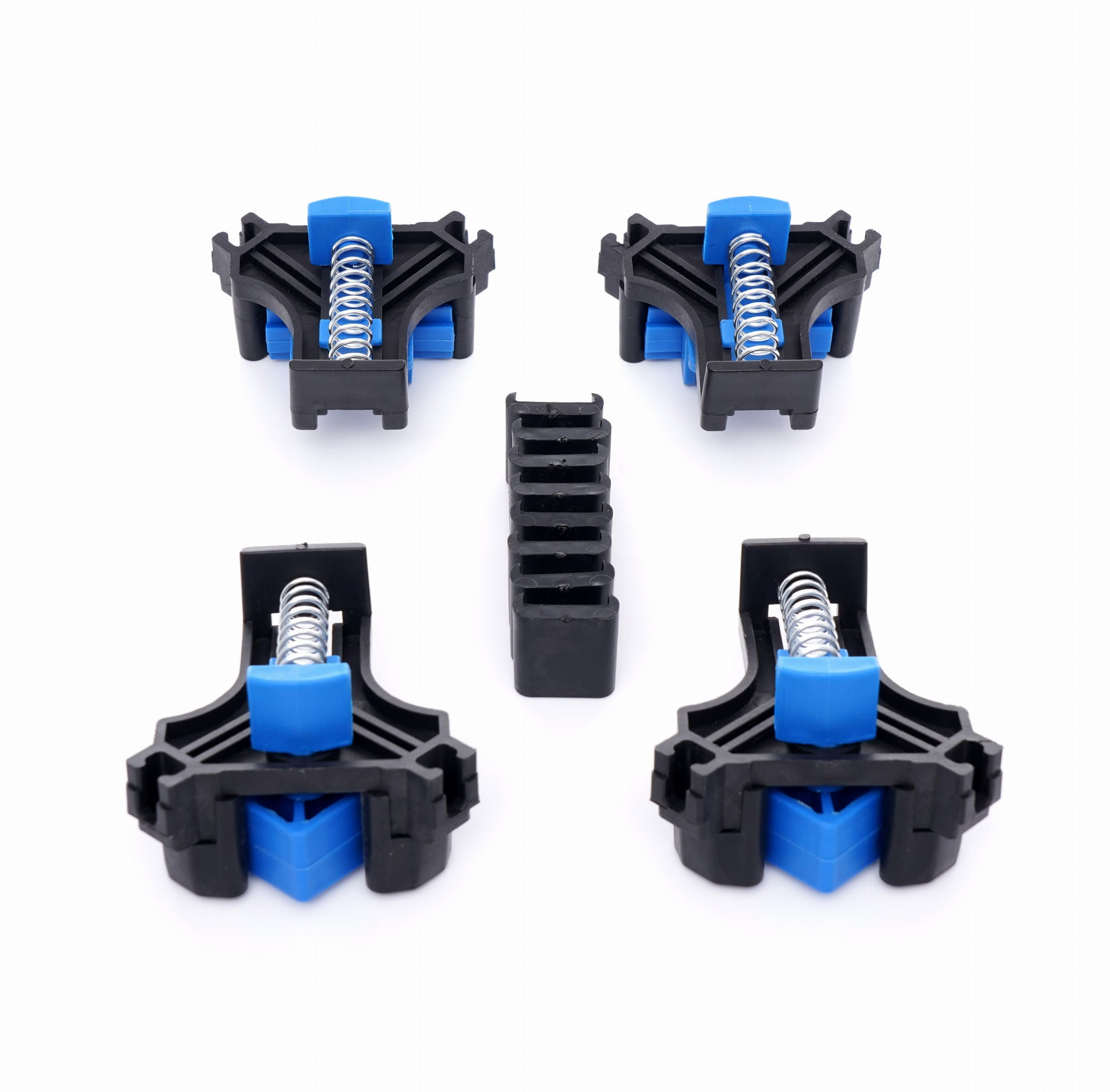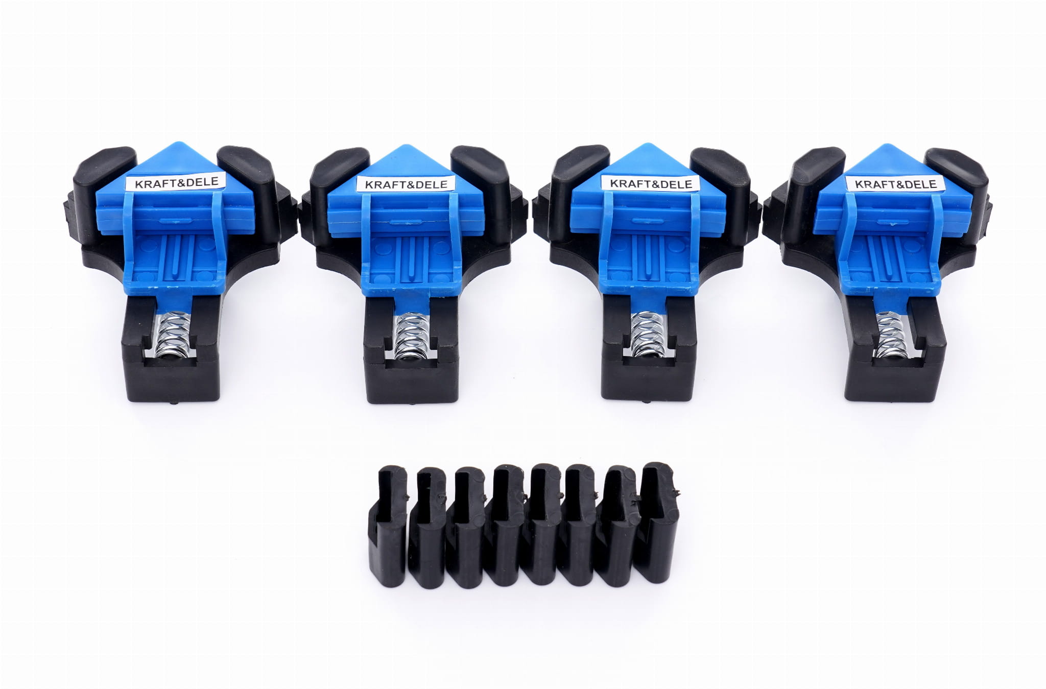 KD1194 to zestaw czterech ścisków stolarskich przeznaczonych do pozycjonowania i mocowania elementów drewnianych pod kątem prostym podczas sklejania i skręcania. Szablony umożliwiają precyzyjne wykonanie połączeń kątowych i teowych, obsługując materiały o grubości od 5 do 22 mm.
