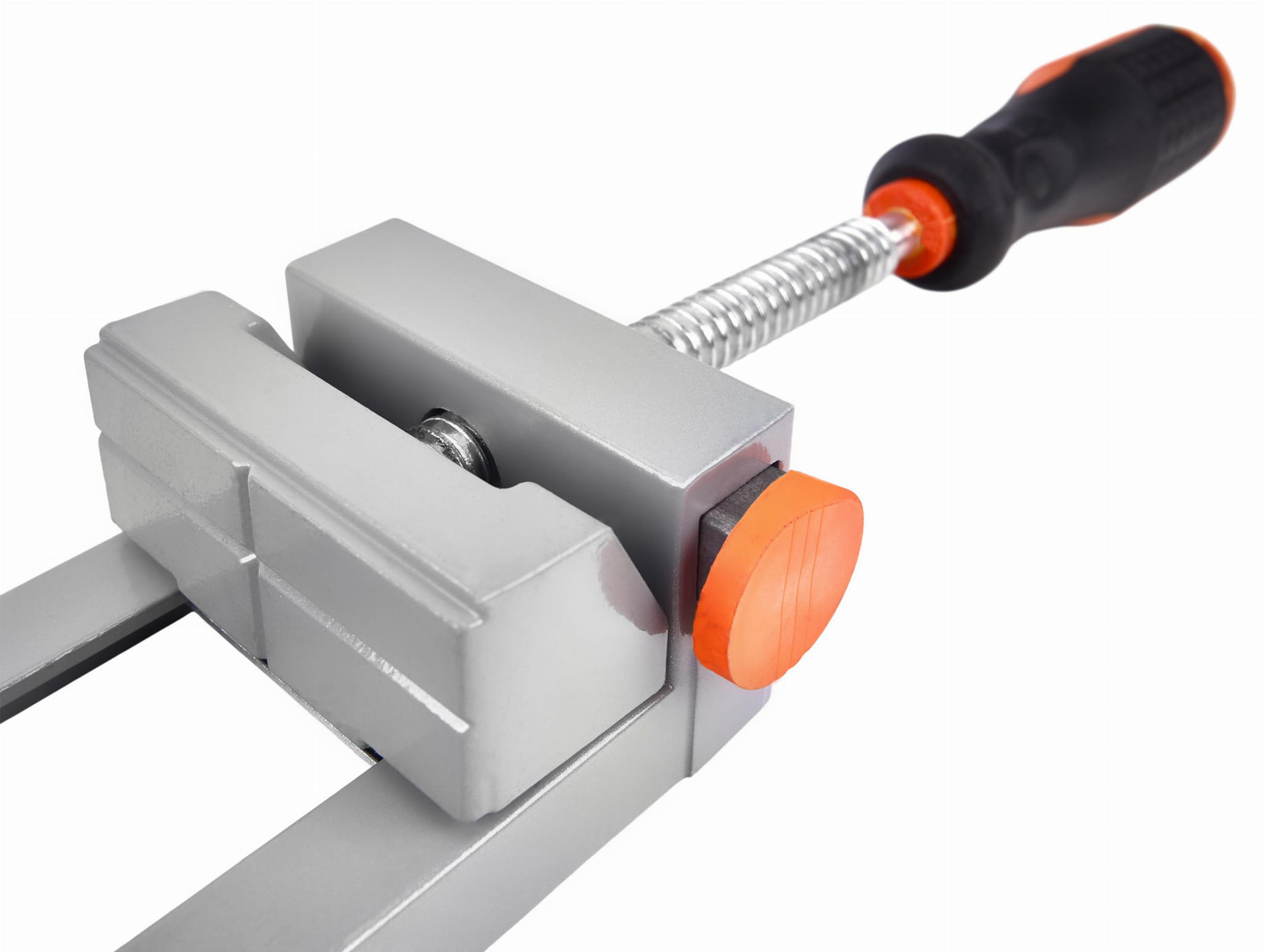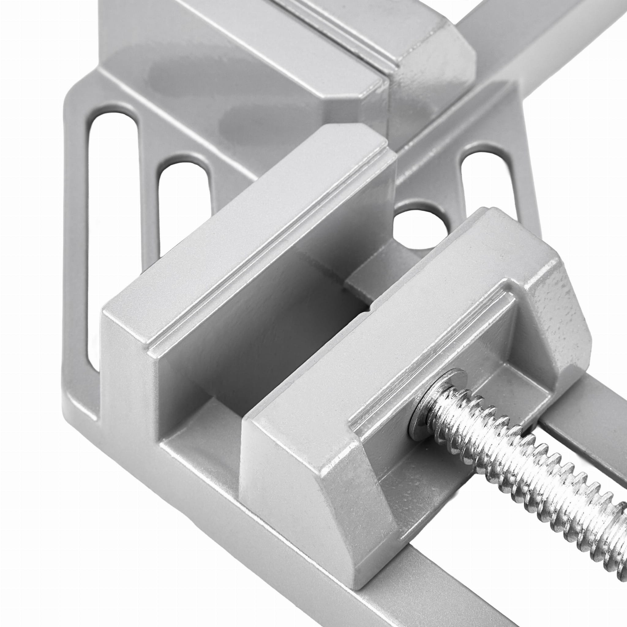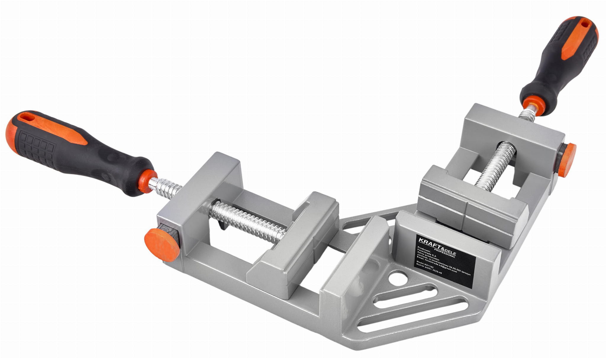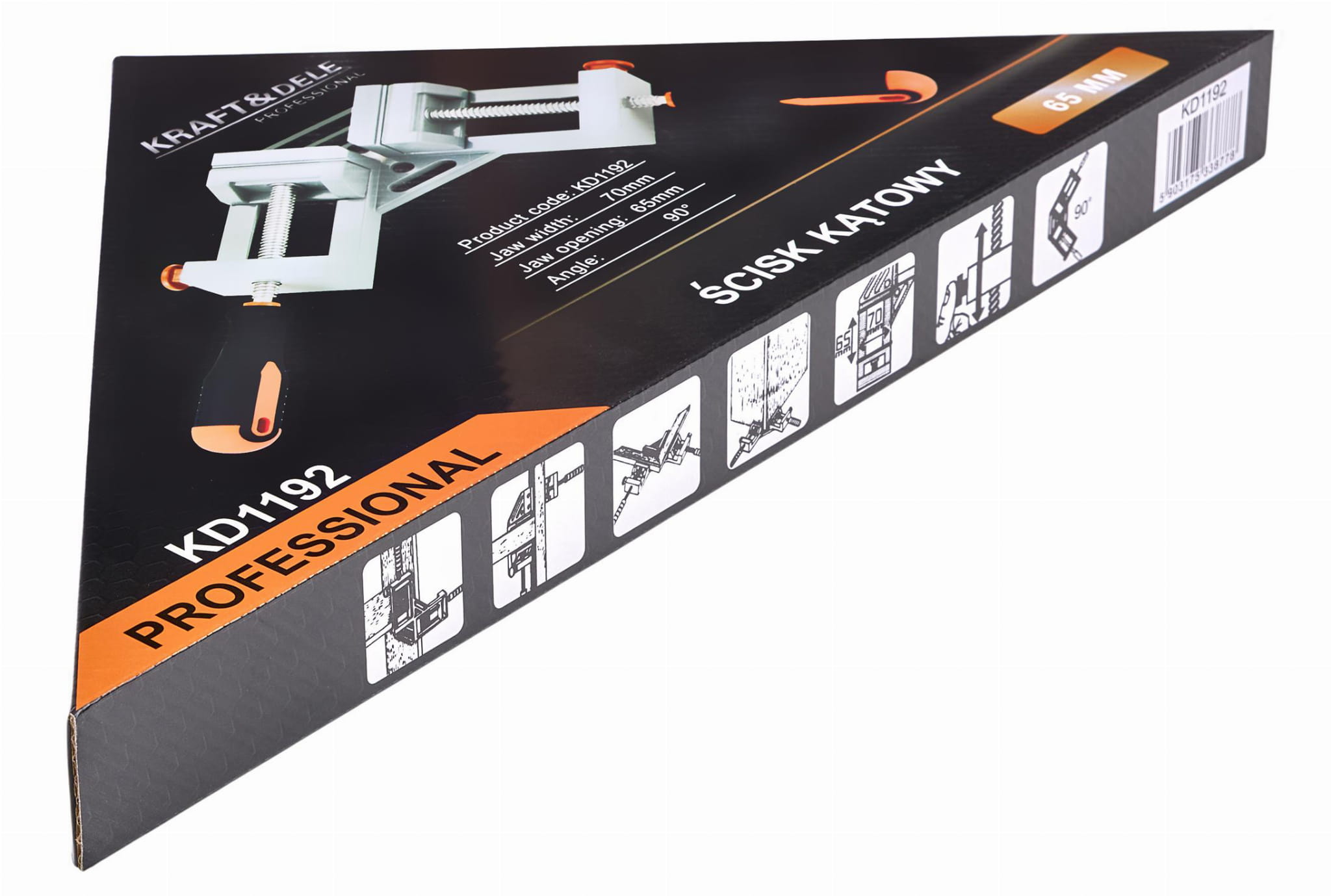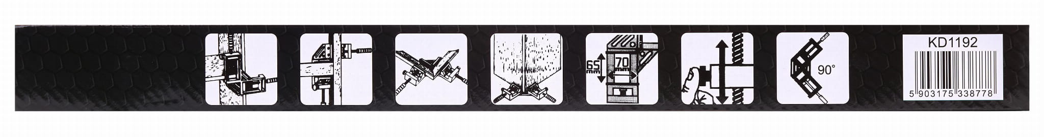 Ścisk kątowy KD1192 to narzędzie do dociskania łączonych elementów pod kątem 90°. Aluminiowy korpus odlewany ciśnieniowo oraz śruba z gwintem trapezowym zapewniają stabilne i powtarzalne mocowanie podczas klejenia, montażu i spawania elementów stolarskich.