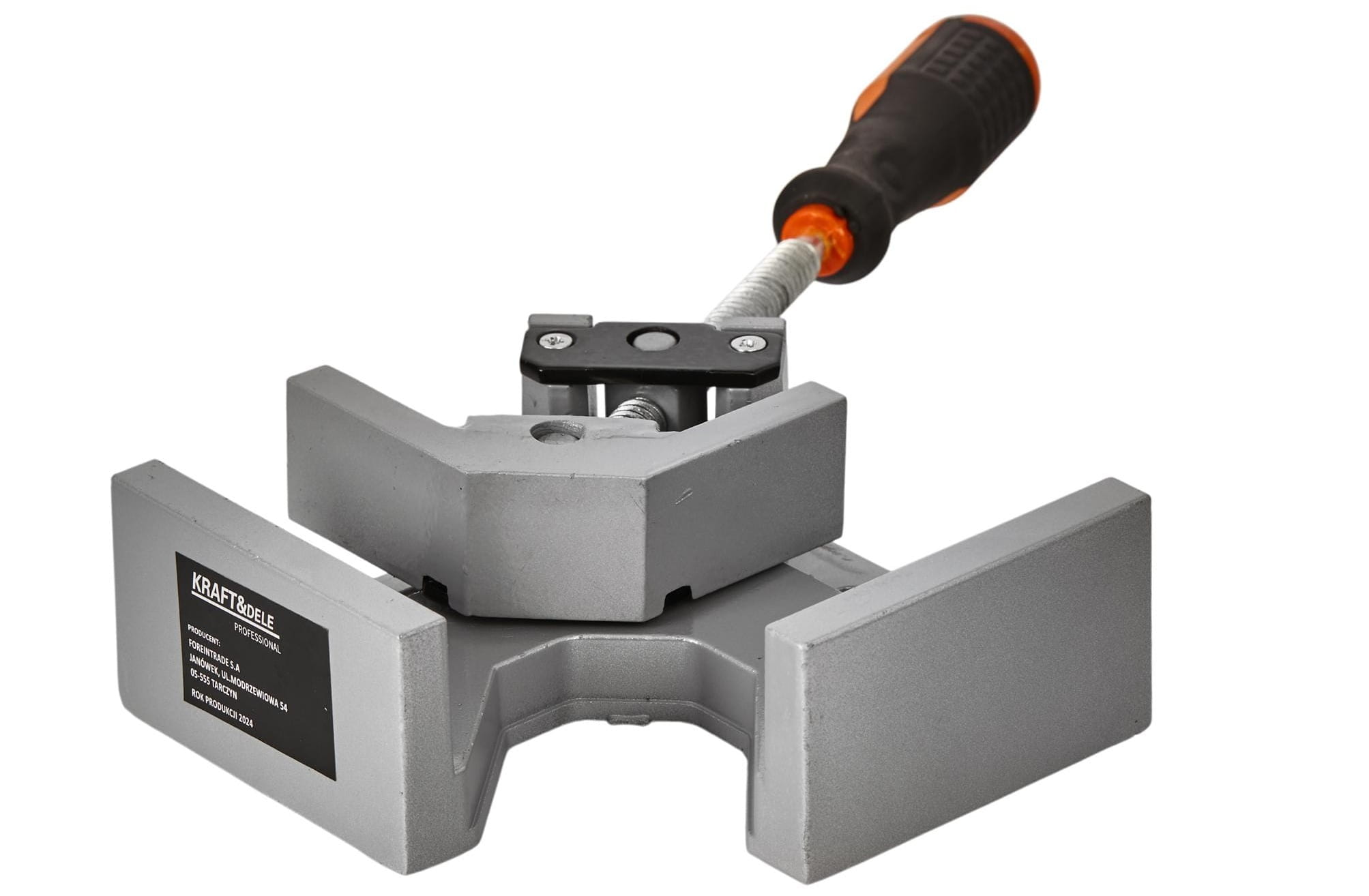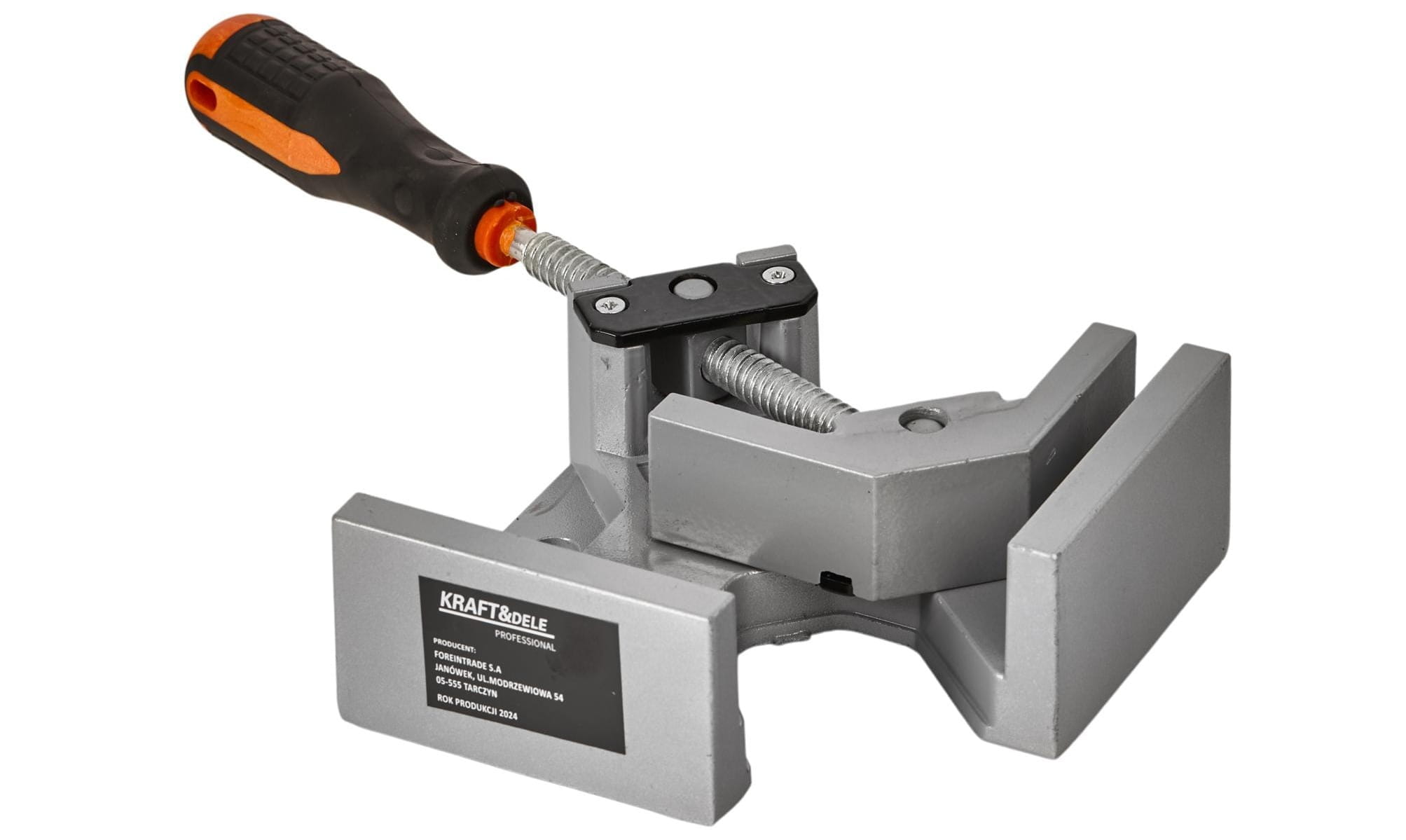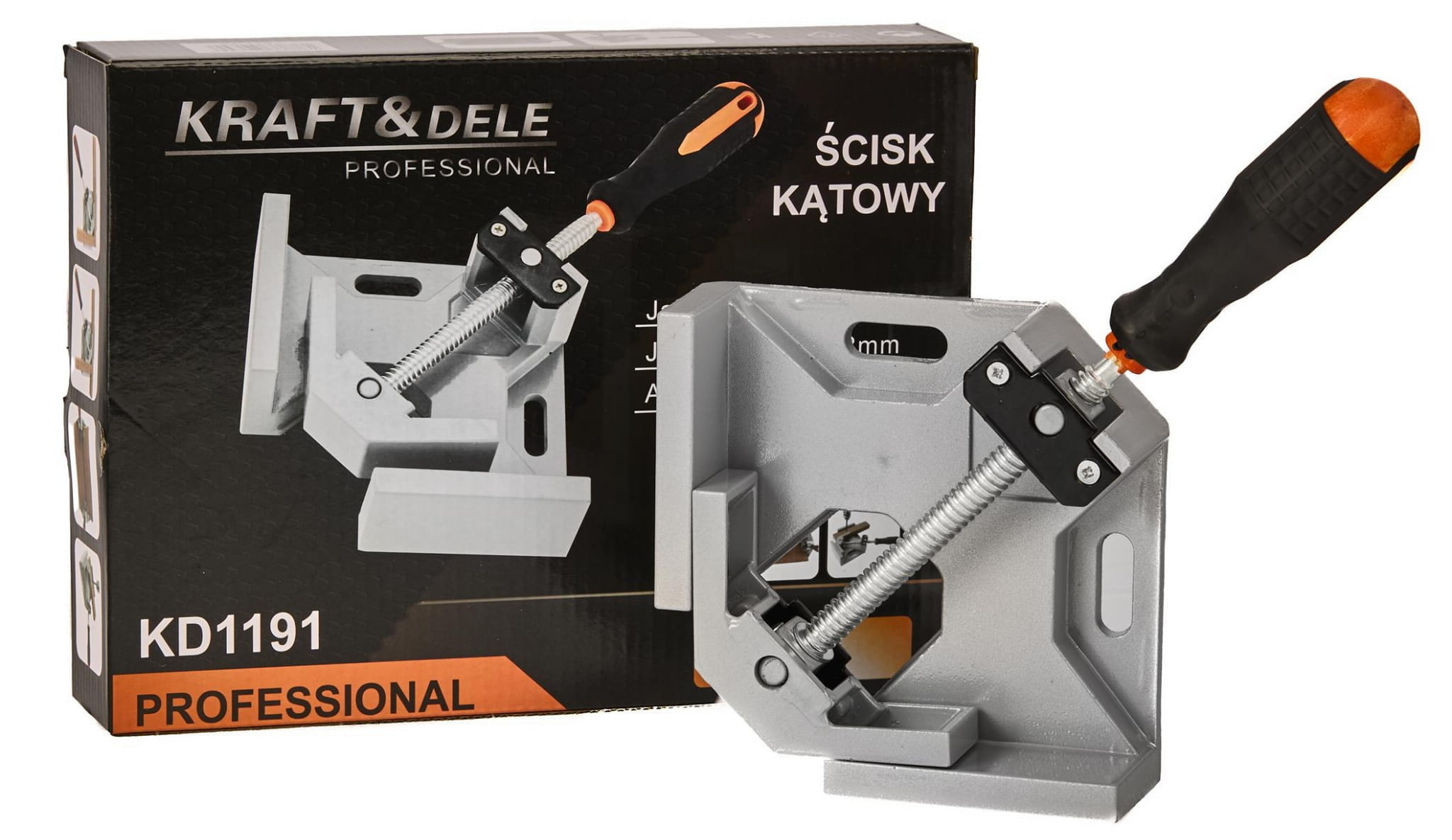 Ścisk kątowy KD1191 służy do dociskania i utrzymywania elementów pod kątem 90° podczas klejenia, montażu i innych prac stolarskich. Korpus oraz szczęki wykonano z odlewu aluminiowego, a wrzeciono dociskowe — ze stali z gwintem trapezowym, co zapewnia trwałość mechanizmu przy wielokrotnym użytkowaniu.