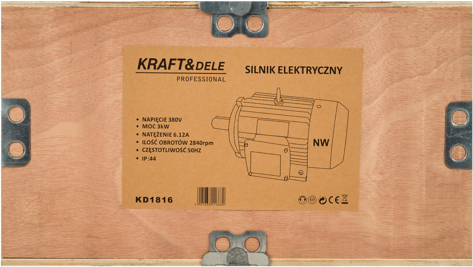 KD1816 to trójfazowy silnik elektryczny o mocy 3 kW, przeznaczony do napędu maszyn warsztatowych i urządzeń przemysłowych zasilanych z sieci 380V. Pracuje z prędkością 2840 rpm, pobiera prąd 6,12 A i waży 18 kg.