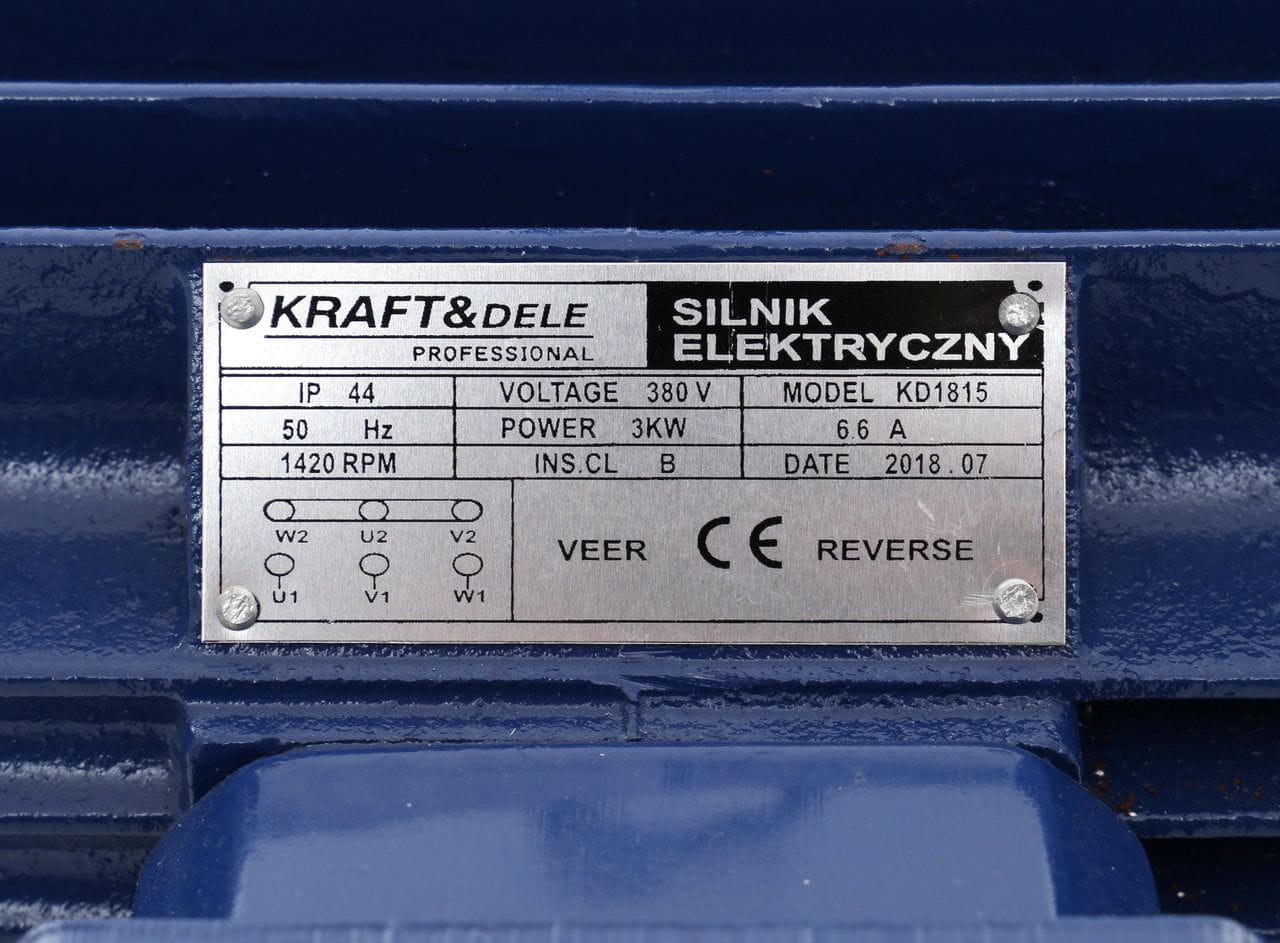KD1815 to jednofazowy silnik elektryczny o mocy 3,0 kW, przeznaczony do napędzania maszyn warsztatowych i urządzeń przemysłowych. Przetwarza energię elektryczną na mechaniczną, pracując przy napięciu sieciowym 400V i prędkości obrotowej 1420 rpm.