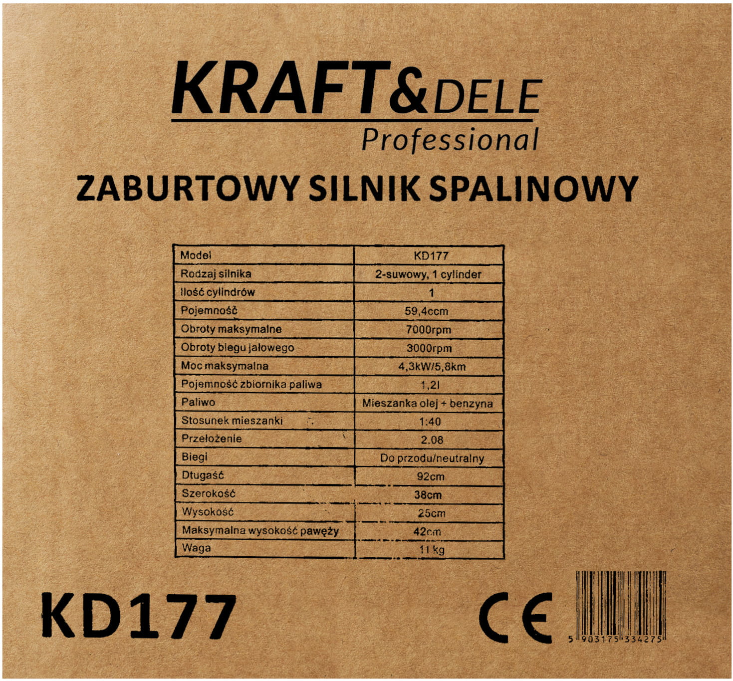 Silniki dwusuwowe charakteryzują się prostszą budową mechaniczną niż czterosuwowe — mniejsza liczba ruchomych części przekłada się na łatwiejszy serwis i mniejszą masę całkowitą. W przypadku KD177 waga wynosi 11 kg, co ułatwia montaż i transport.